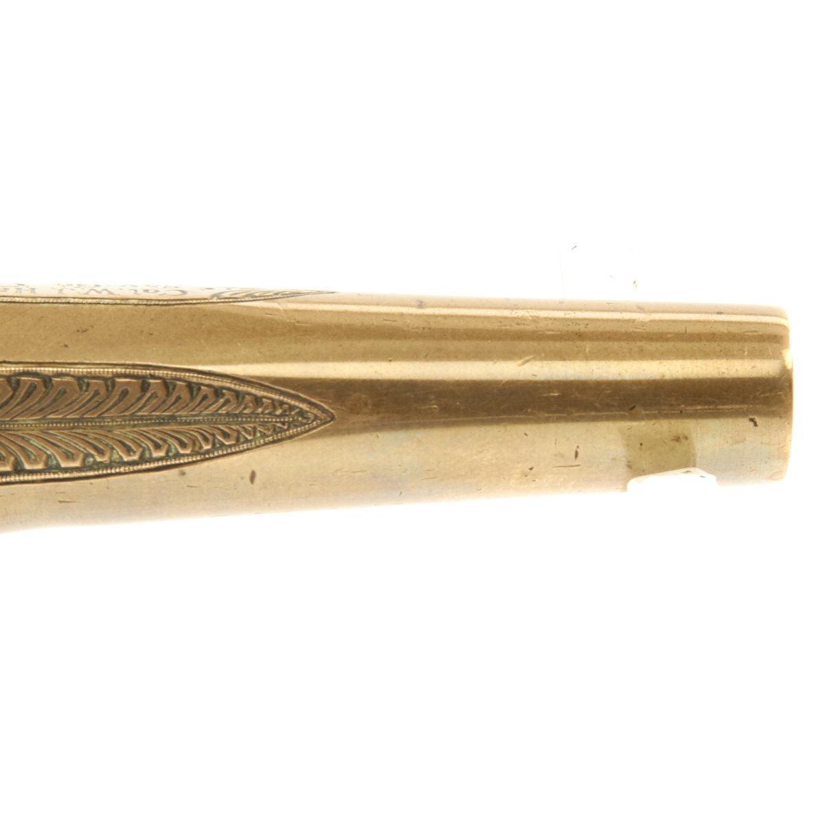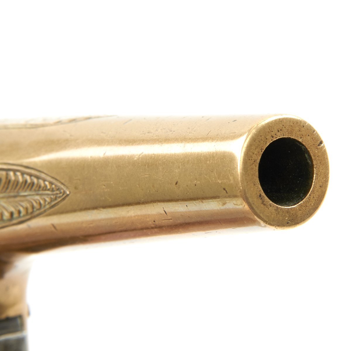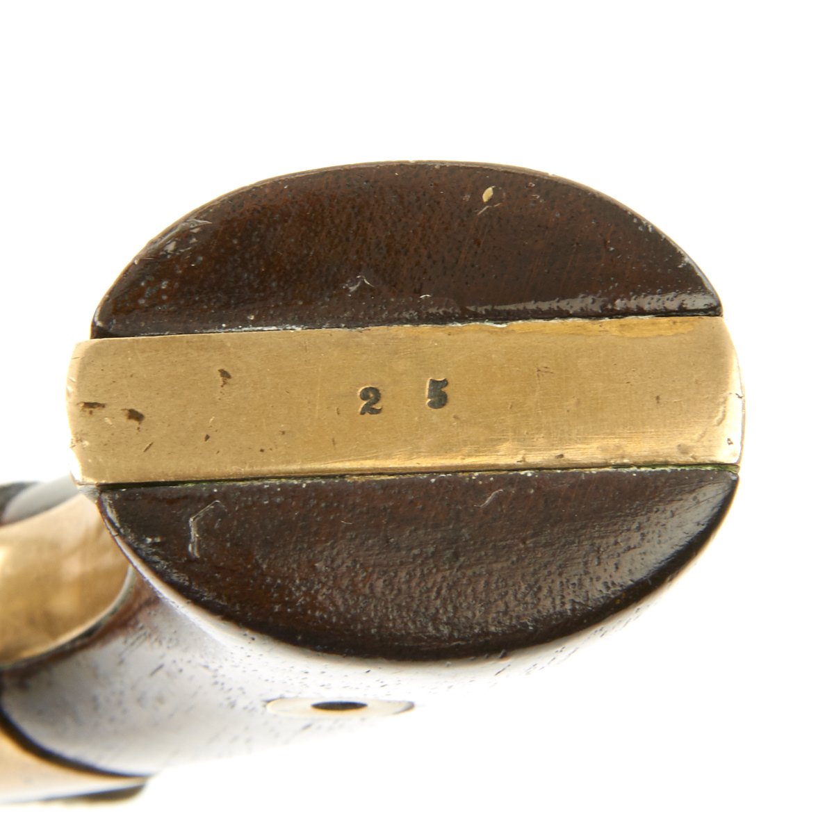 Original Item: One of a Kind. This is a most interesting small Single Shot Percussion Derringer constructed from Brass. The single piece grip frame and barrel bears serial number of # 25 on the bottom of the grip. The pistol is in approximately .32 Caliber, with iron hammer, trigger and presumably the internal parts. Nice deeply engraved decoration on back strap and on each side of the barrel. The design indicates production circa 1860-1863.