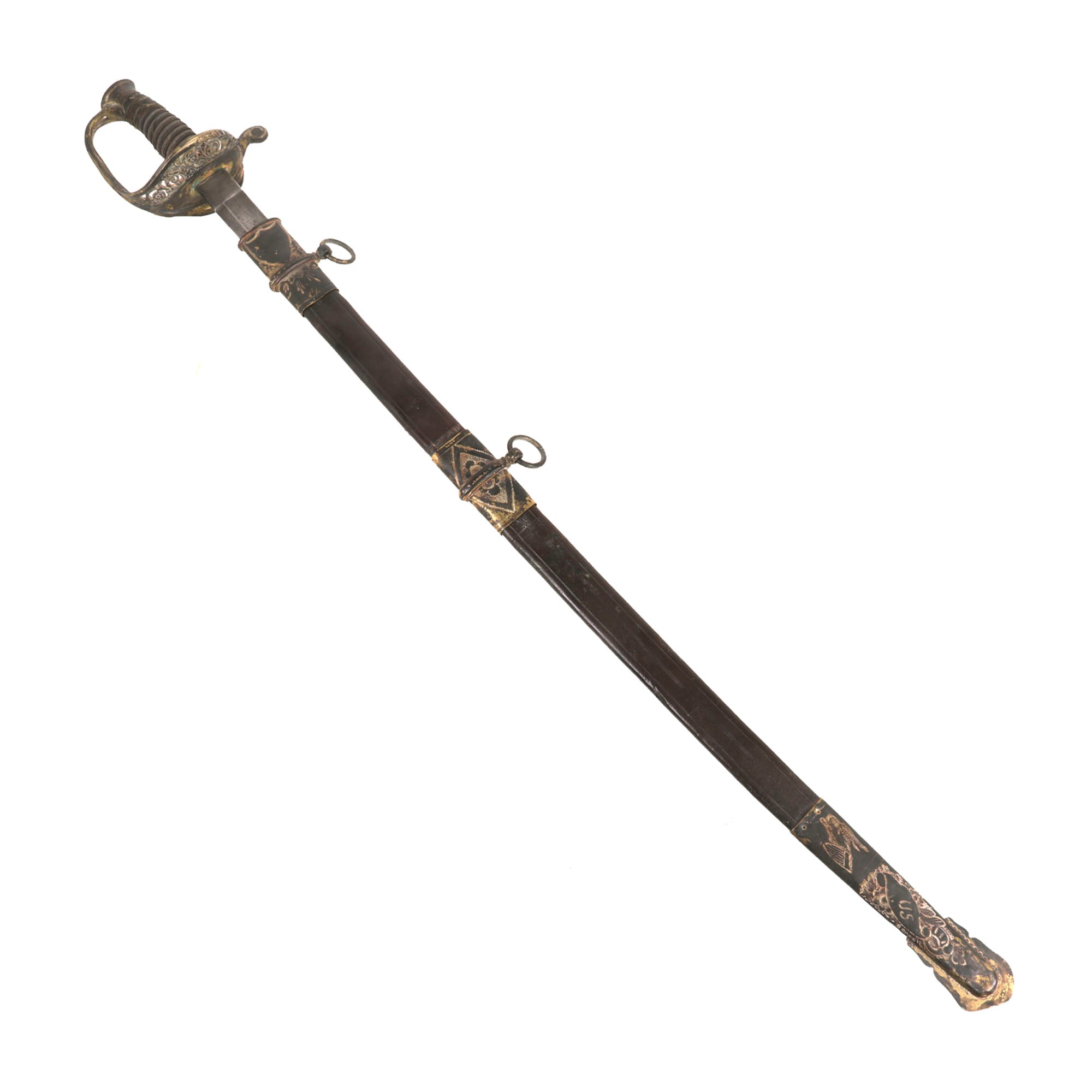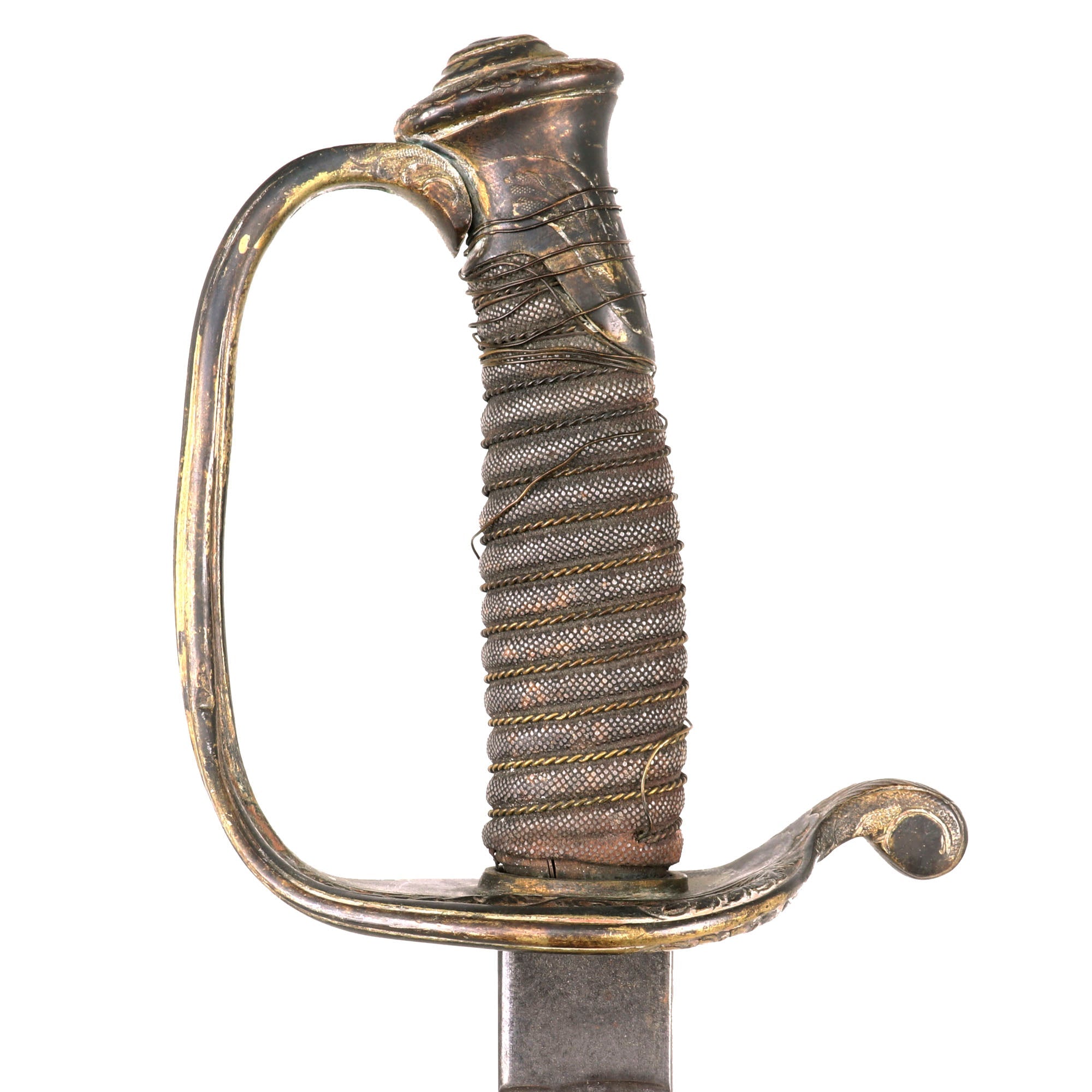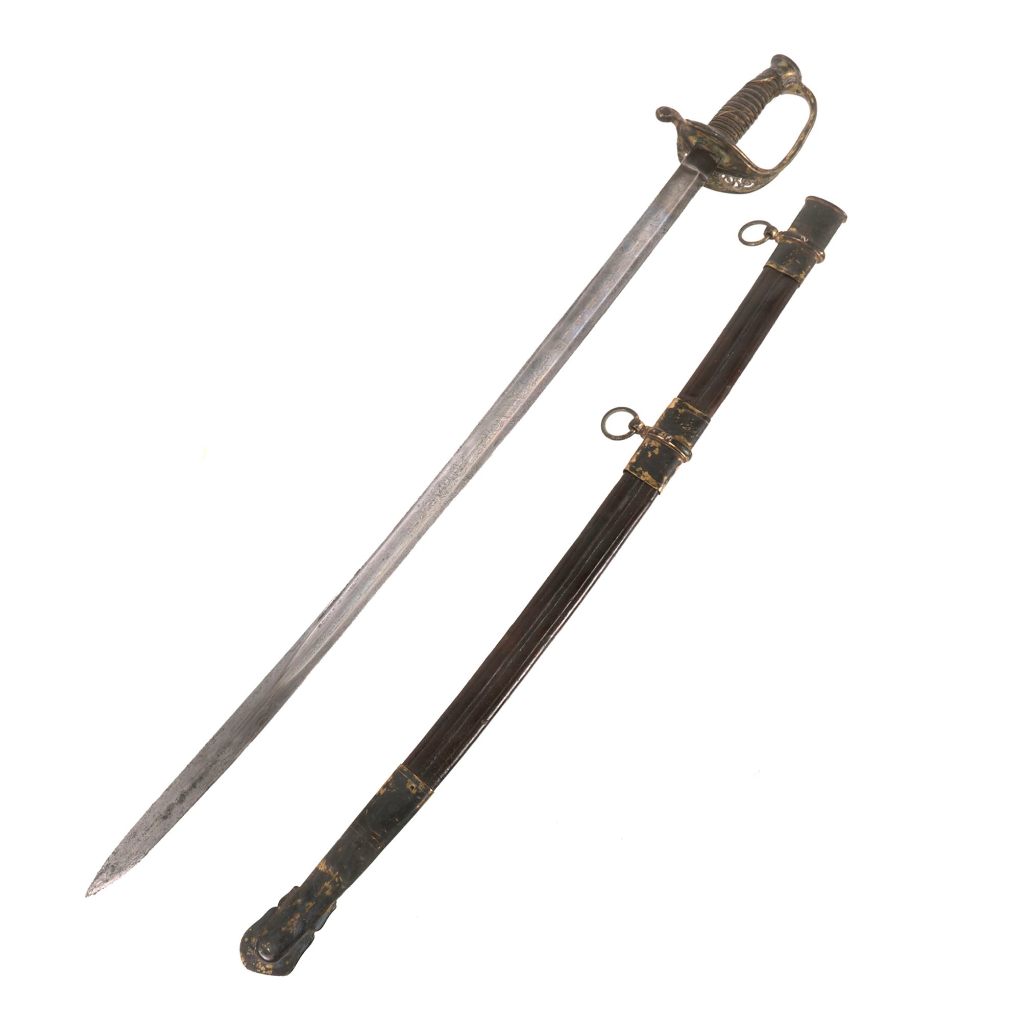 Original Item: Only One Available. This is an excellent, original condition model 1850 Foot Officer’s Sword with half basket brass hilt decorated with pierced floral decorations, and a custom ordered etched blade with lovely patriotic motifs. The brass fittings of the scabbard are engraved with gorgeous custom patriotic motifs. This sword was likely import-made & retailed by the extremely scarce firm Hunt & Goodwin of Washington, D.C.. Hunt & Goodwin retailed swords only during the Civil War years between 1861 and 1865, making this retailer quite rare & desirable. As used by all officers below the rank of major between 1851-1865. This sword was used by both Union and Confederate officers during the American Civil War.