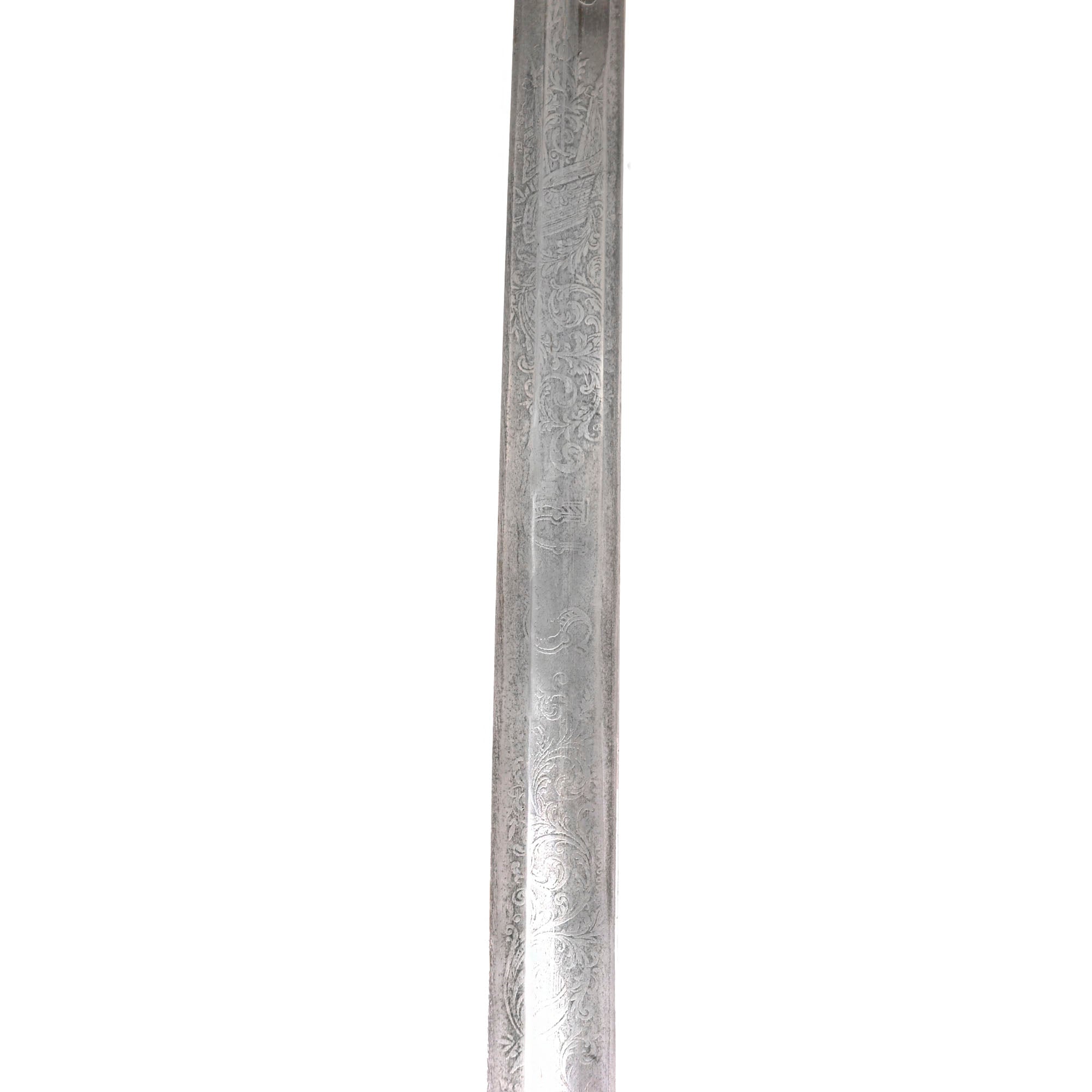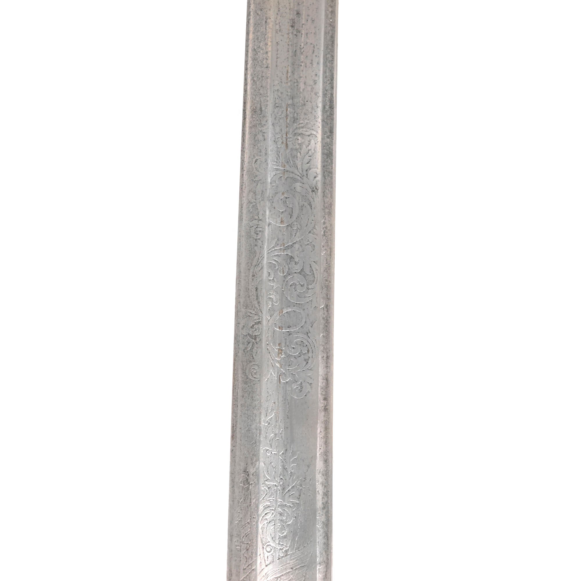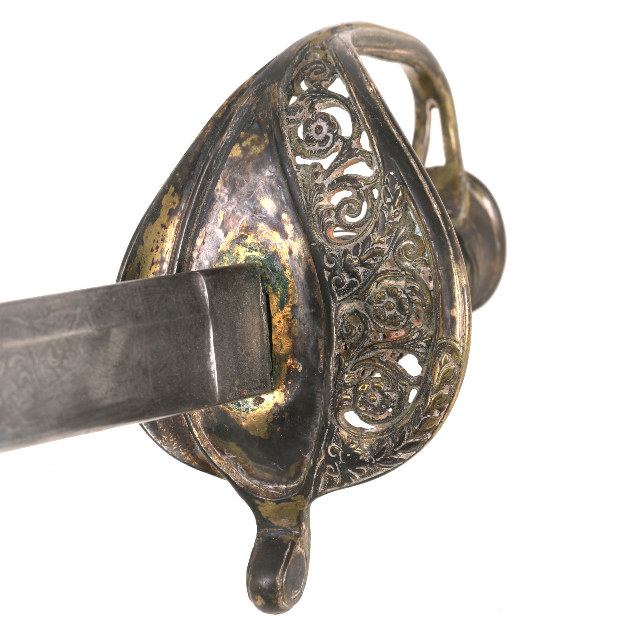 Original Item: Only One Available. This is an excellent, original condition model 1850 Foot Officer’s Sword with half basket brass hilt decorated with pierced floral decorations, and a custom ordered etched blade with lovely patriotic motifs. The brass fittings of the scabbard are engraved with gorgeous custom patriotic motifs. This sword was likely import-made & retailed by the extremely scarce firm Hunt & Goodwin of Washington, D.C.. Hunt & Goodwin retailed swords only during the Civil War years between 1861 and 1865, making this retailer quite rare & desirable. As used by all officers below the rank of major between 1851-1865. This sword was used by both Union and Confederate officers during the American Civil War.