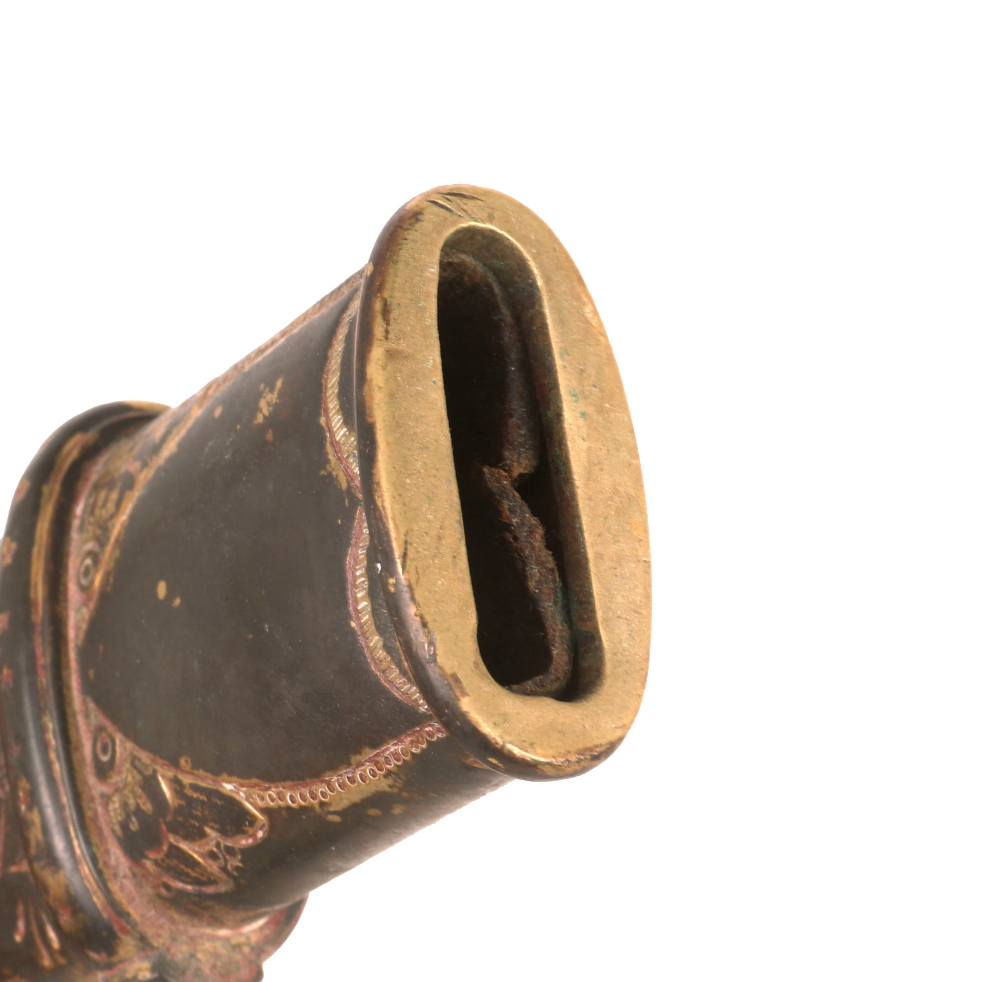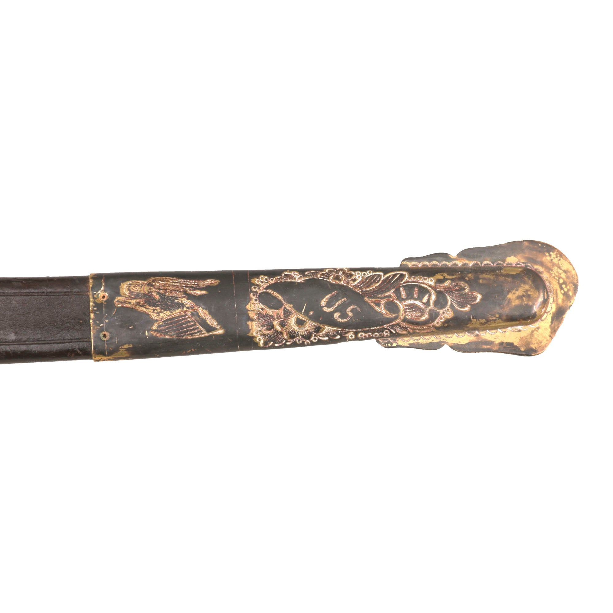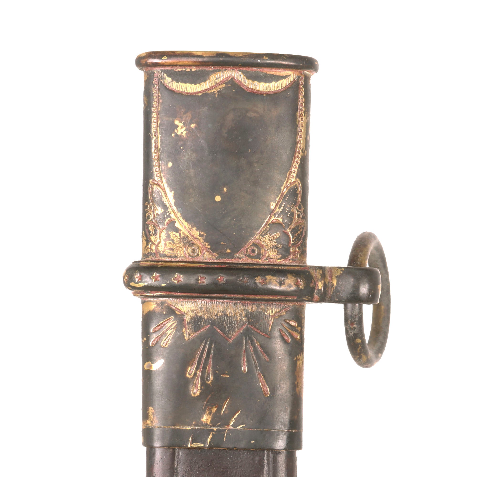 The sword comes in its original brass-mounted leather scabbard, the brass fittings of which are gorgeously engraved with patriotic motifs with stars along the suspension ring mounts. The throat drag has a lovely shield which would have been used to identify the officer, but this example is just the shield. The throat fitting is no longer connected to the leather but sits fine for display. Due to the aging of the leather, it has shrunk and no longer fits the sword all the way, but due to the looseness of the throat fitting, it can be moved to the ricasso with enough leather above it to look as if it fits perfectly.