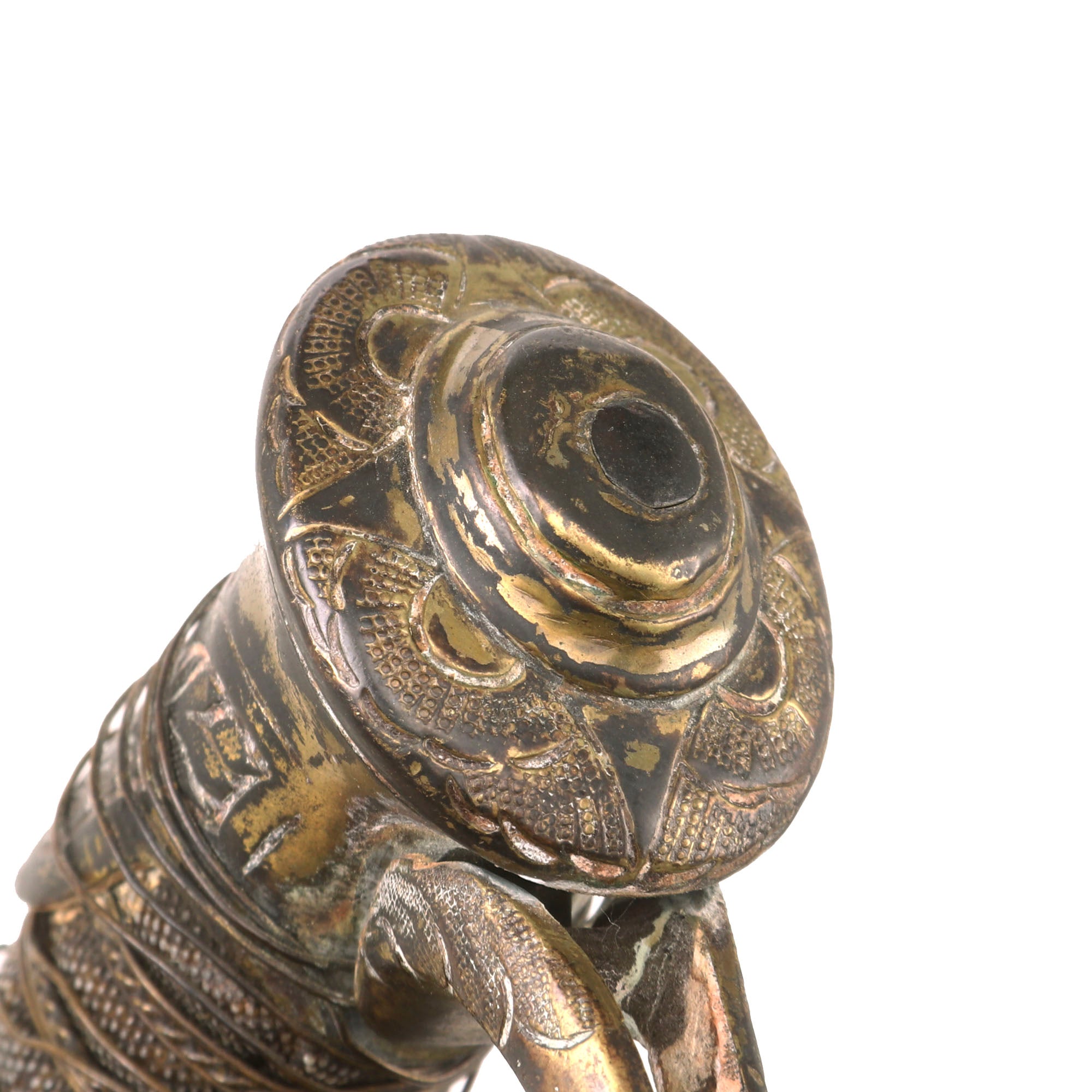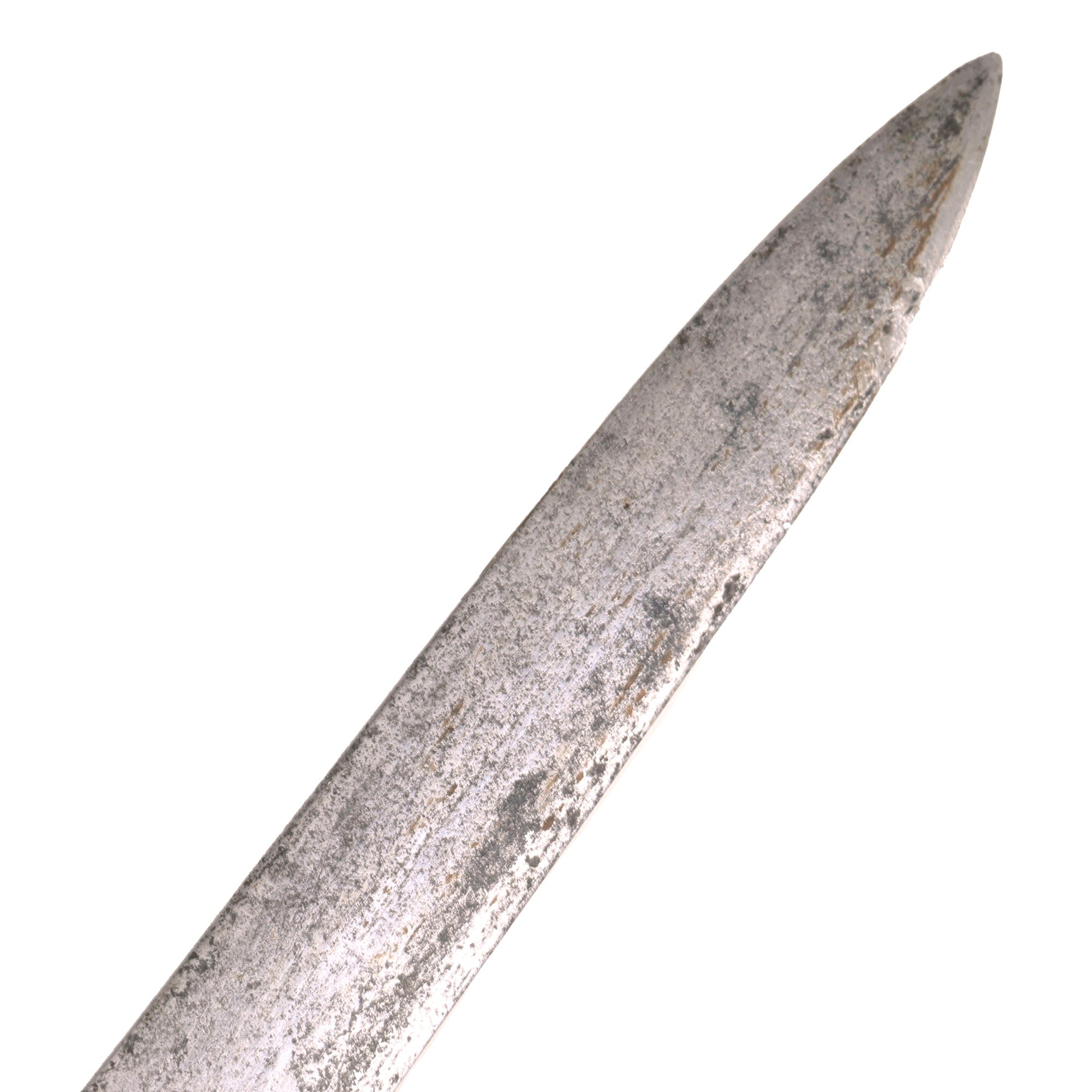 The blade shows heavy oxidation cleaning over the years which has made the etching rather faint. The original leather blade buffer is gone. The guard is a bit loose to the blade but is still well-retained.