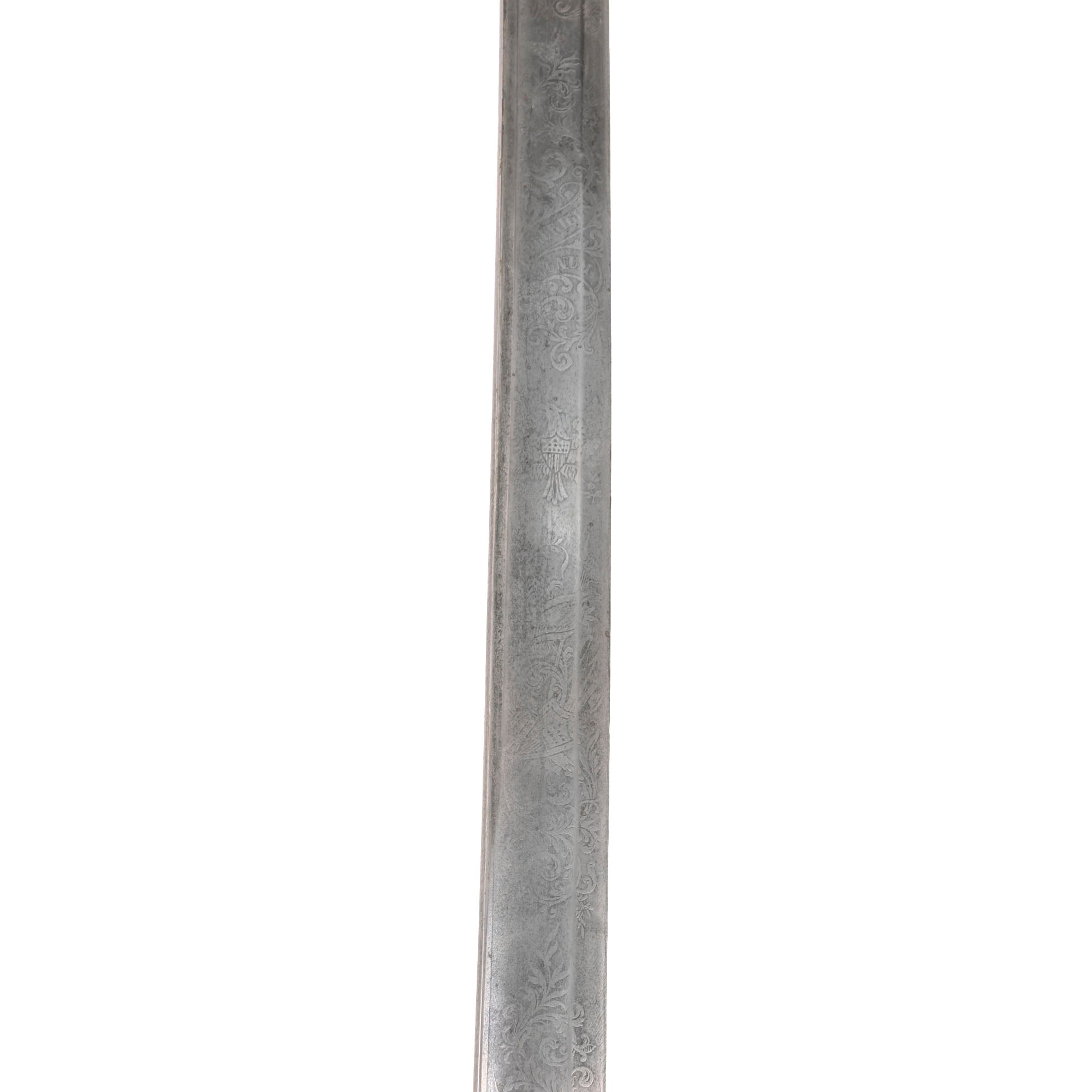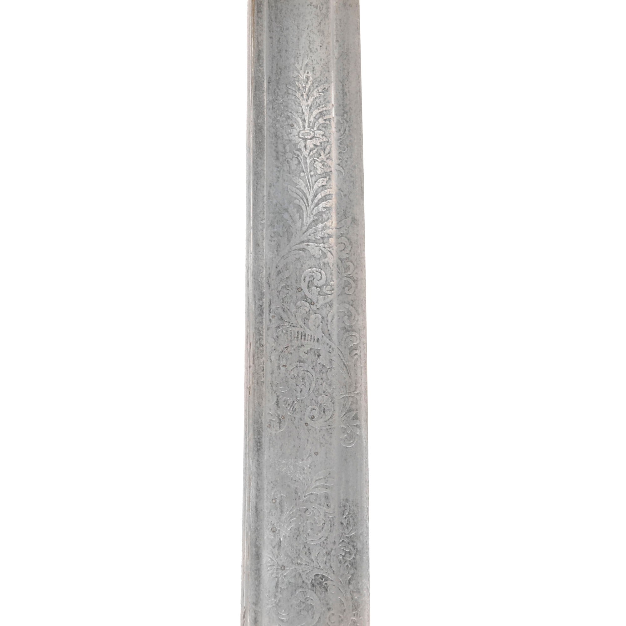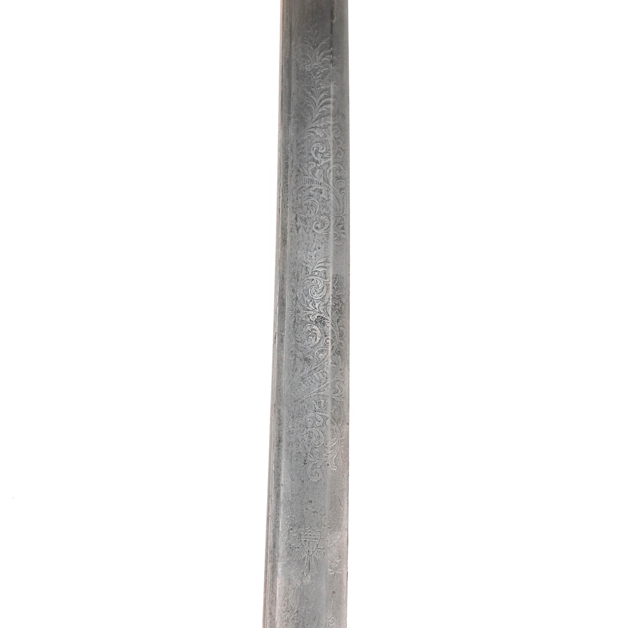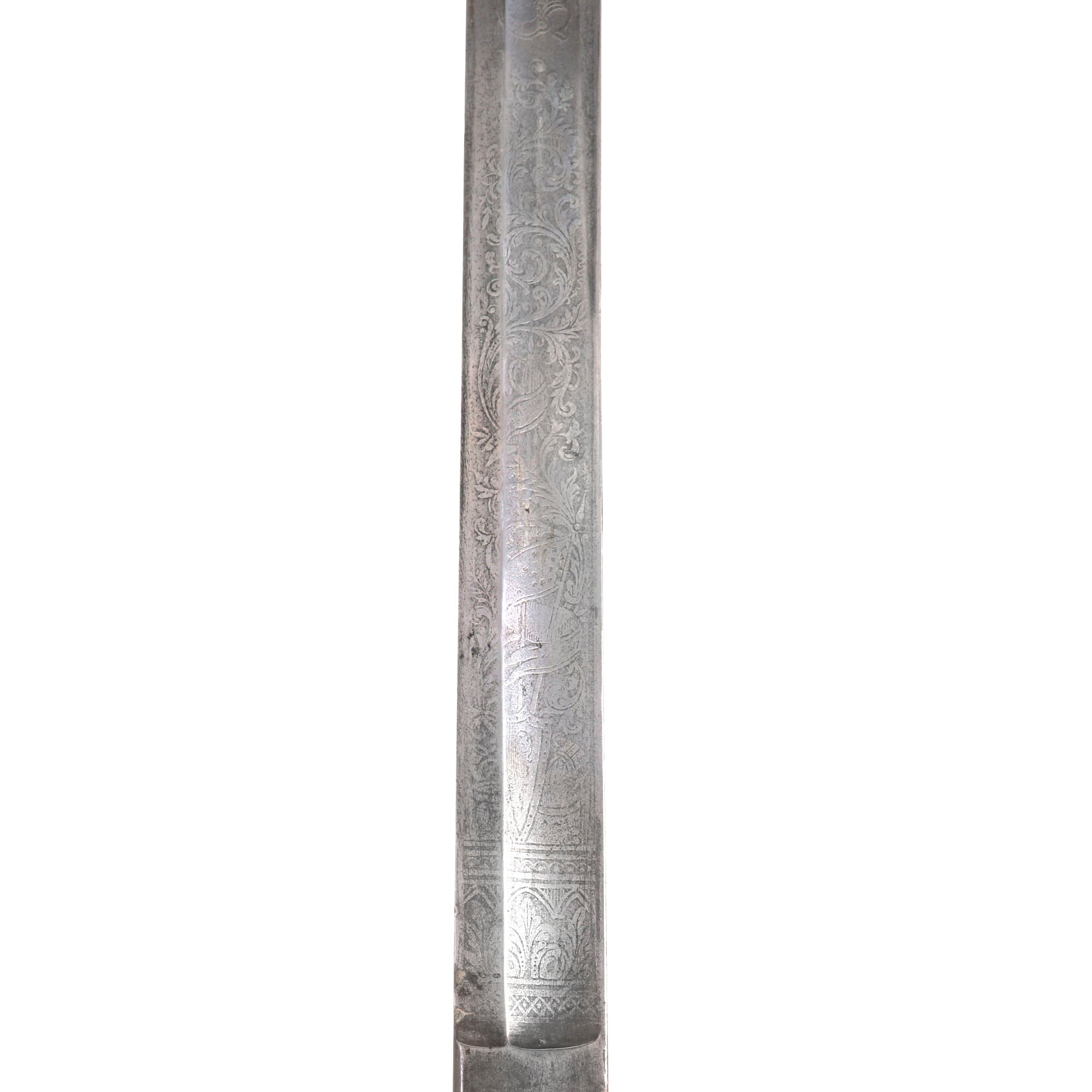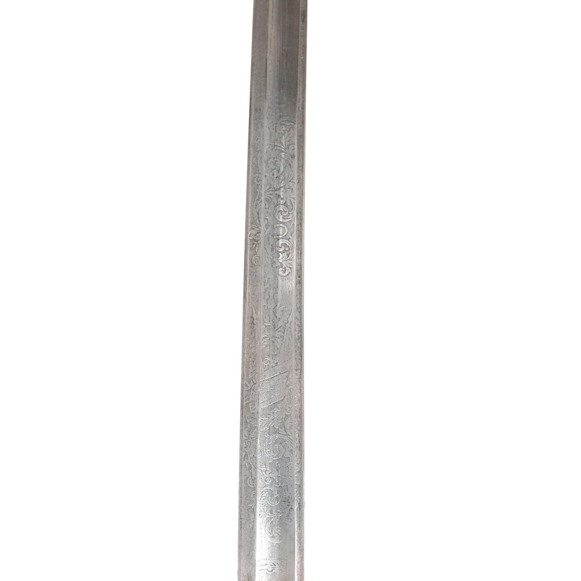 The slightly curved blade of 30 3/4 inches is in good shape, with some lovely but faded etching in the middle, with “U.S.” on one side, and a stunning military motif on the opposite side. Truly a lovely blade, with a nice aged dark patina, which is marked on one side with the maker information: