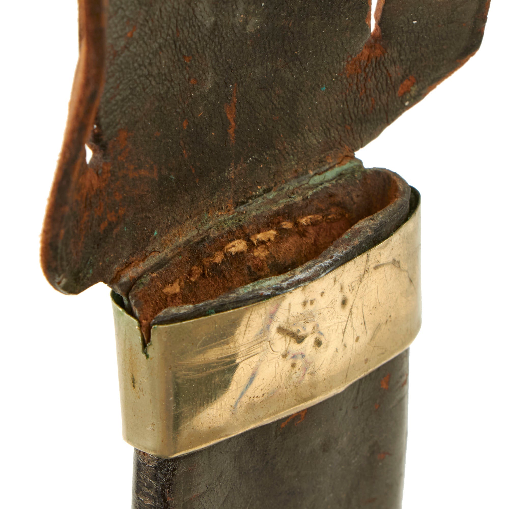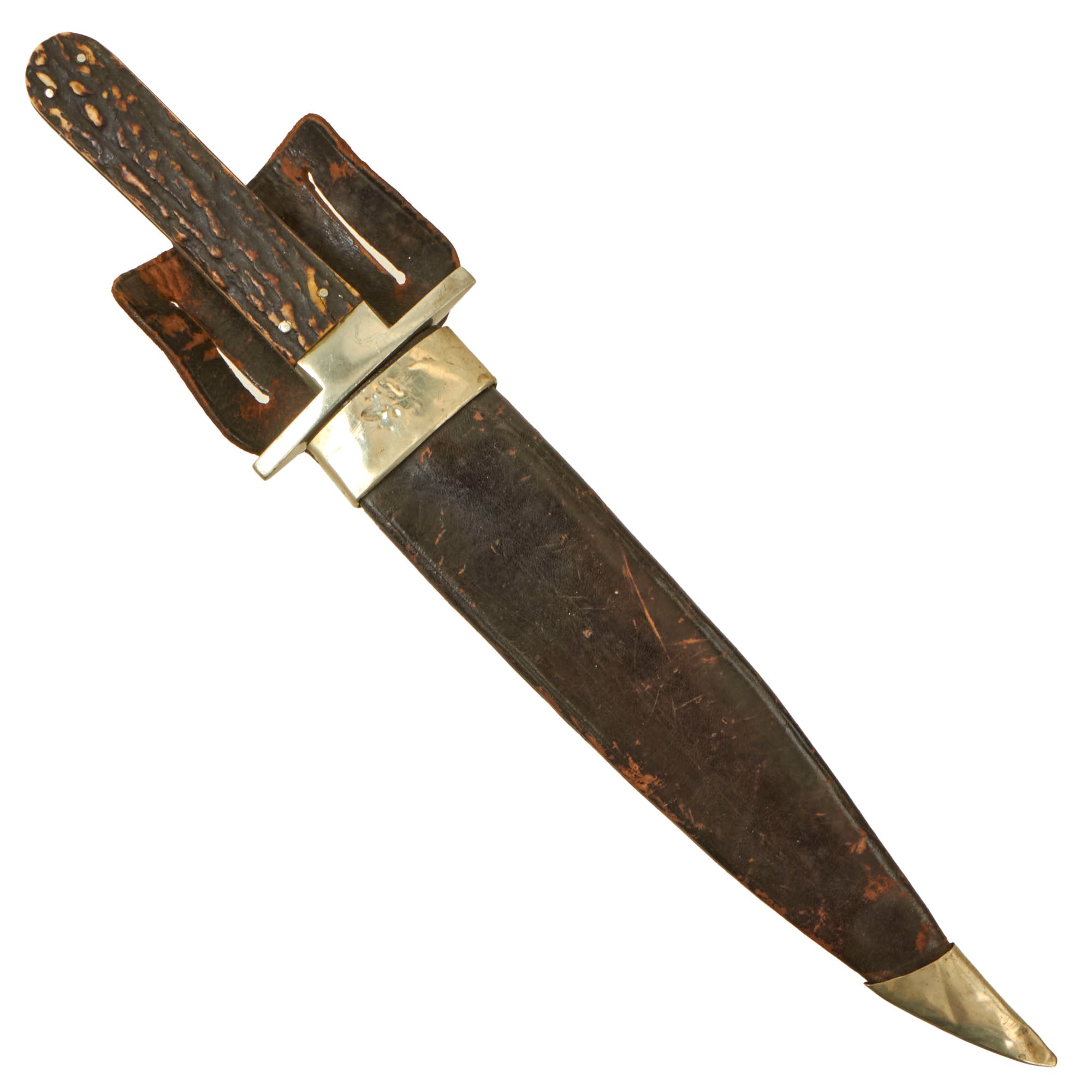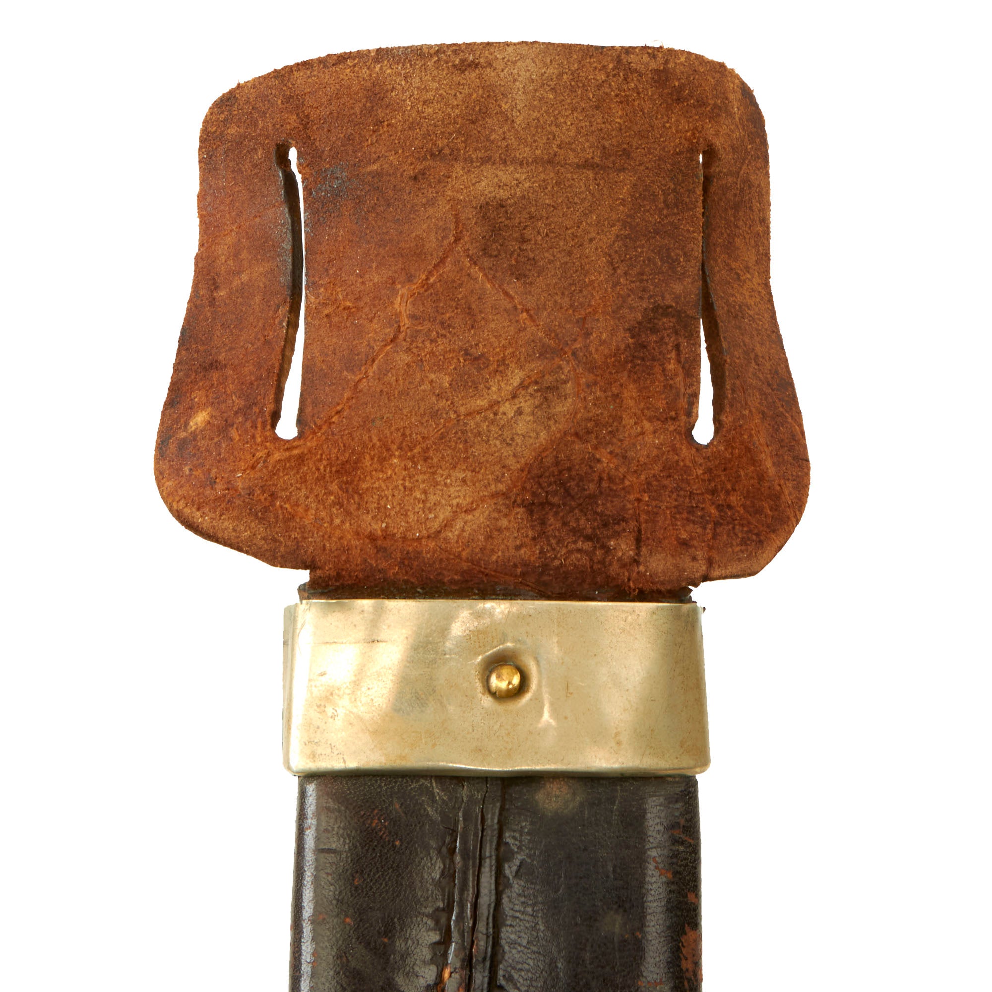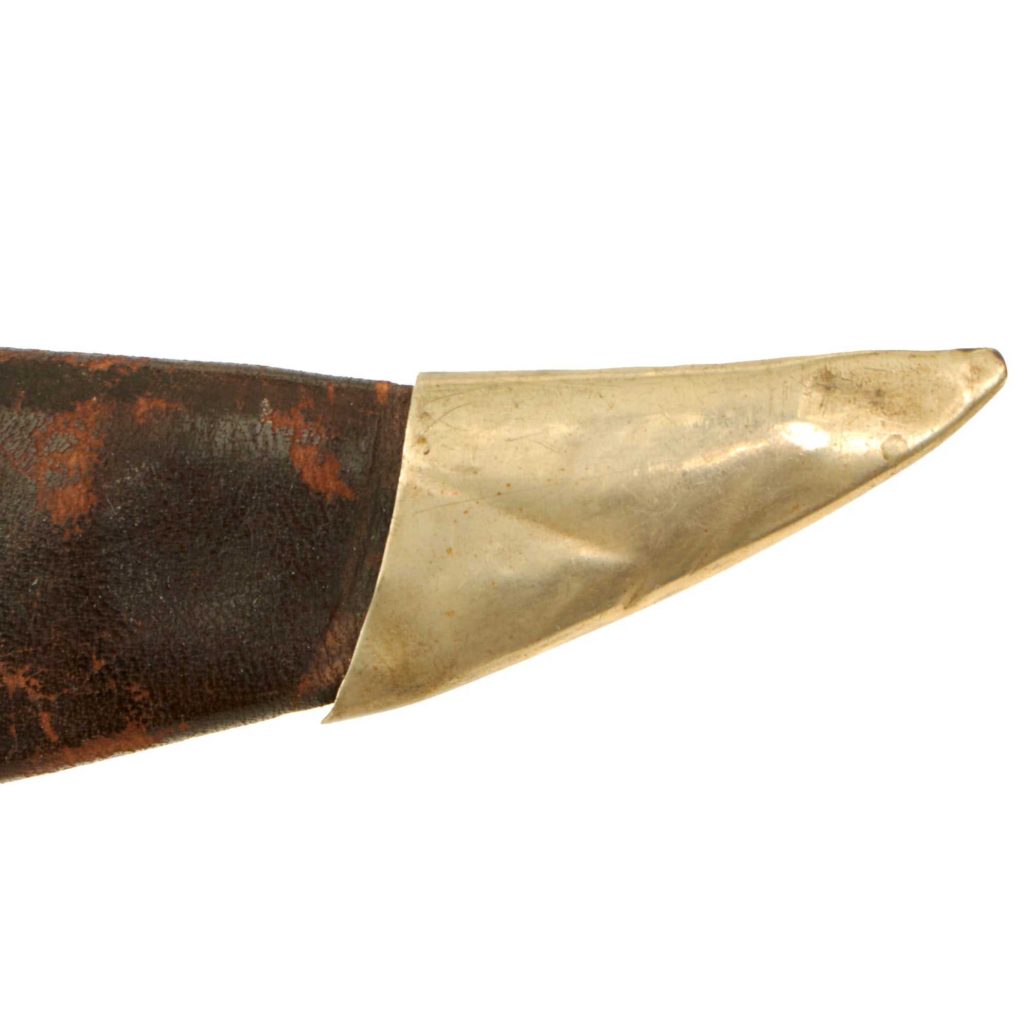 The original German Silver-mounted leather scabbard is in good condition, with the silver throat and drag still well-retained with some denting. The leather is still intact with some crazing in the finish, but the stitching has held up very well on the back. The incorporated leather belt loop is a very nice touch, supposedly added after the belt stud broke off.
