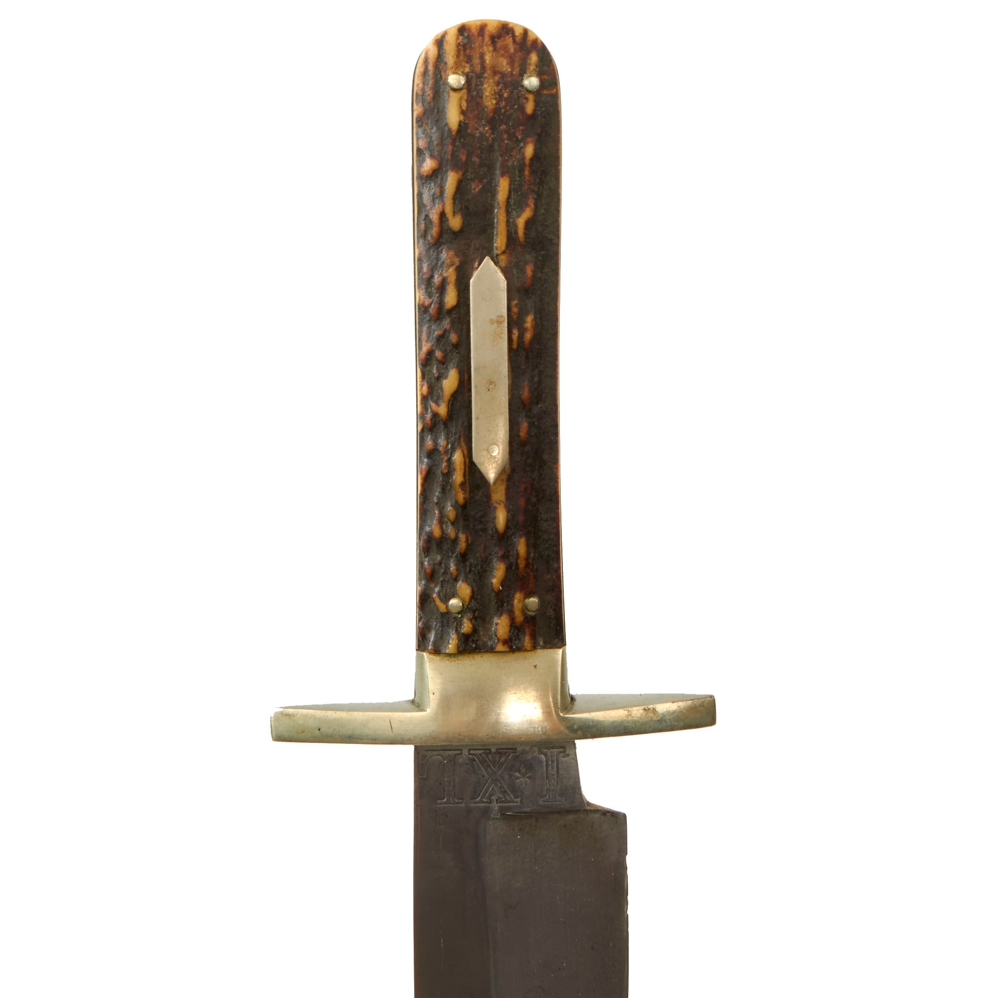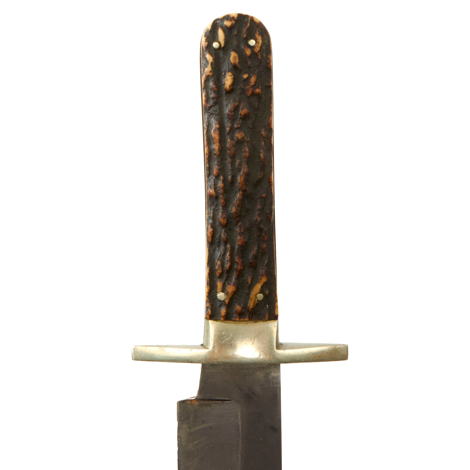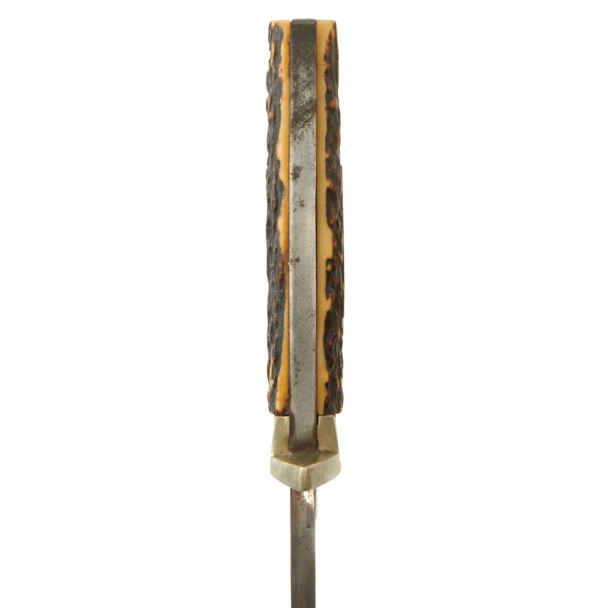 The blade is in great shape with some small nicks to the edge and past oxidation having been cleaned away. The original staghorn plate grips are in great condition, held in by four small rivets, with a small German Silver plate in the center on one side. The staghorn has held up very well. The knife measures 14¾” overall.