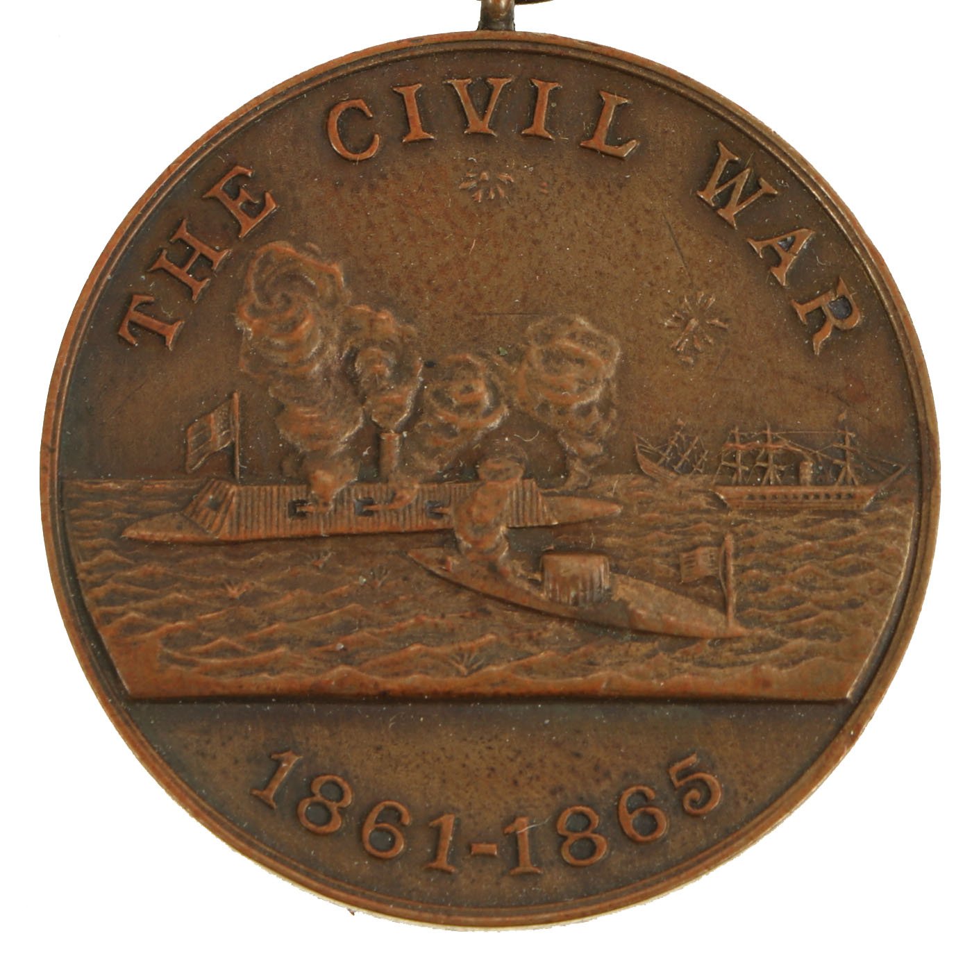 Two ironclad naval vessels are shown engaged in combat. To the rear of both ships (and to the viewer's right), two wooden vessels appear, one of which is sinking. In the sky, a bomb is bursting in air. Above this scene, and following the upper contour of the medal, the words THE CIVIL WAR appear in raised letters. The exergue contains the dates 1861-1865.
