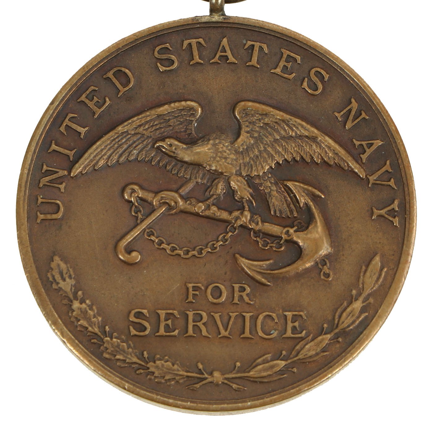 In the center of a bronze medallion, an eagle with its wings displayed is shown resting upon an anchor with draped chain, over the words FOR SERVICE in raised letters. At the base of the medal, and following the contour of its rim, there is an elongated wreath composed of oak on the left and laurel on the right. Following the contour of the upper portion of the medal, the words UNITED STATES NAVY are shown in raised letters.