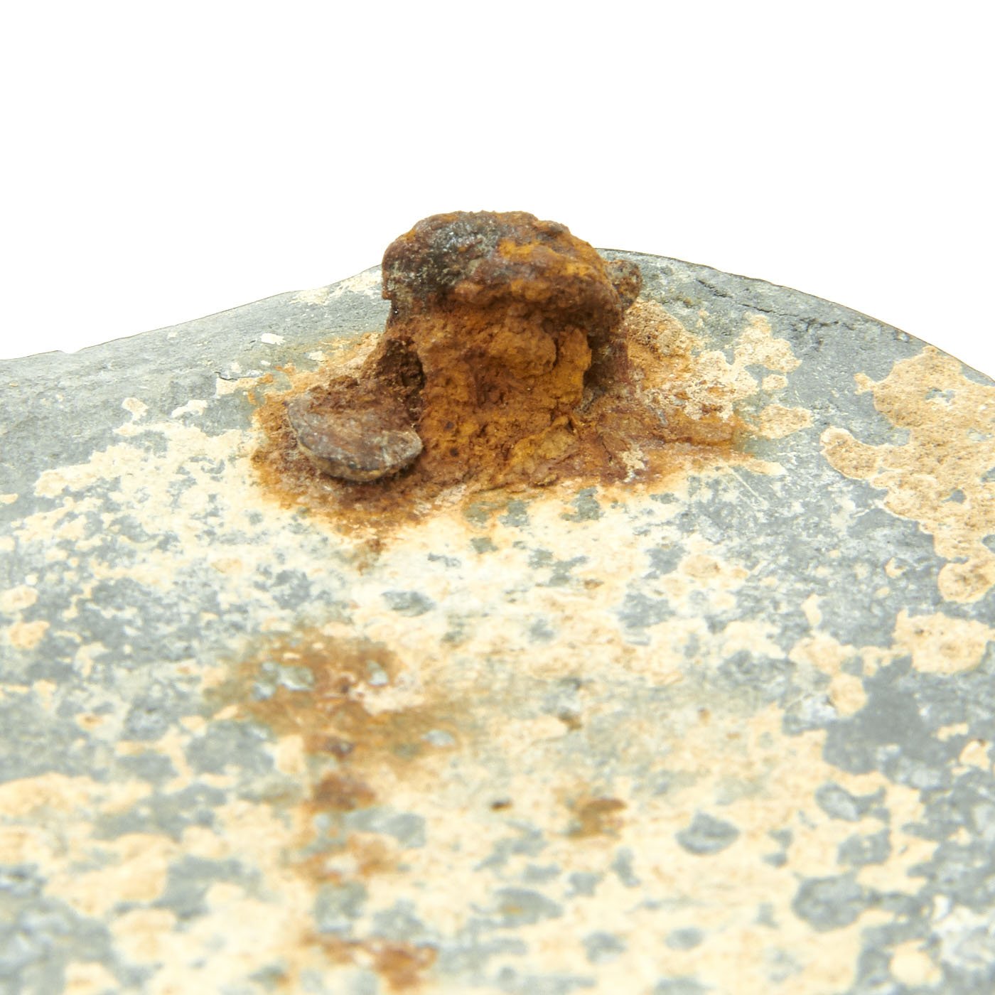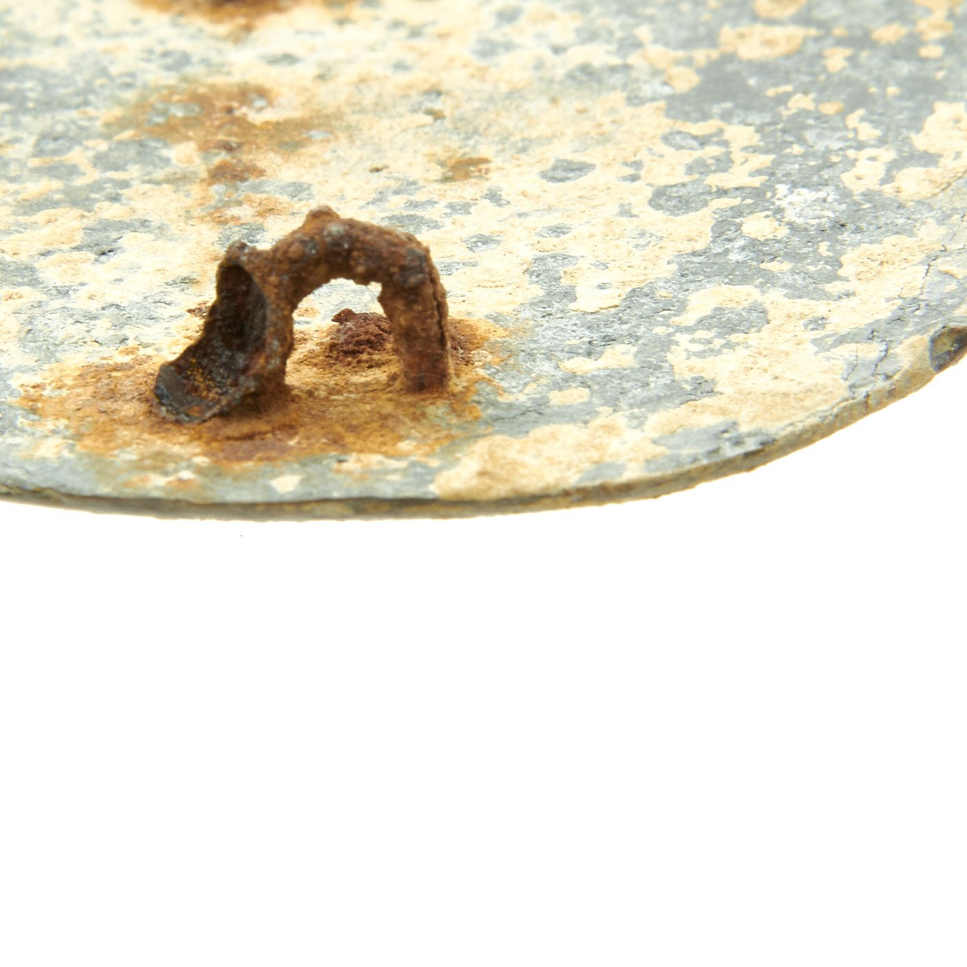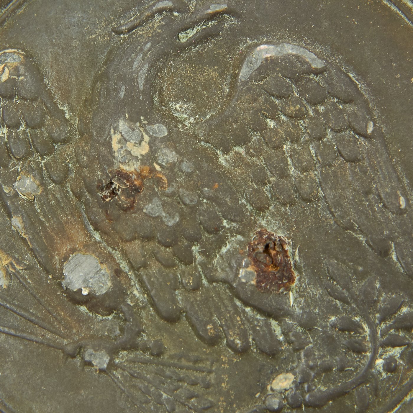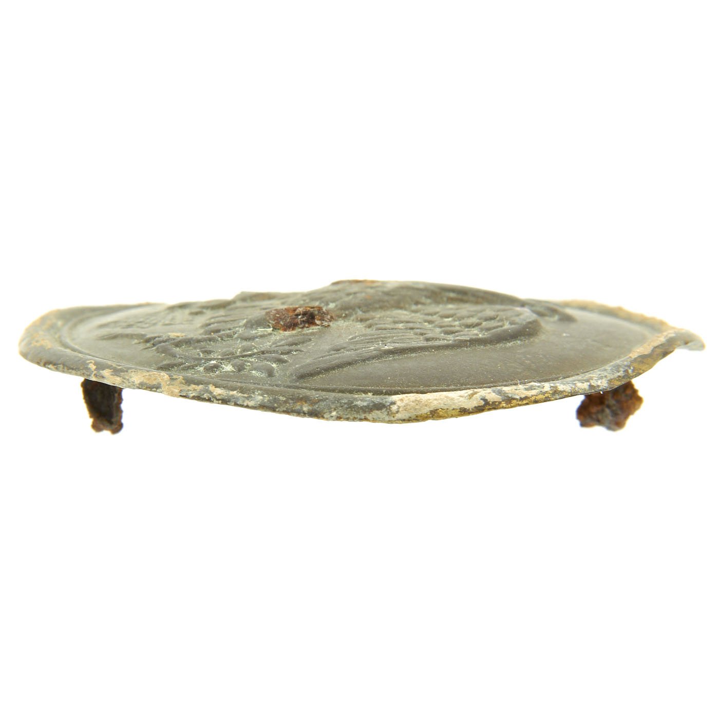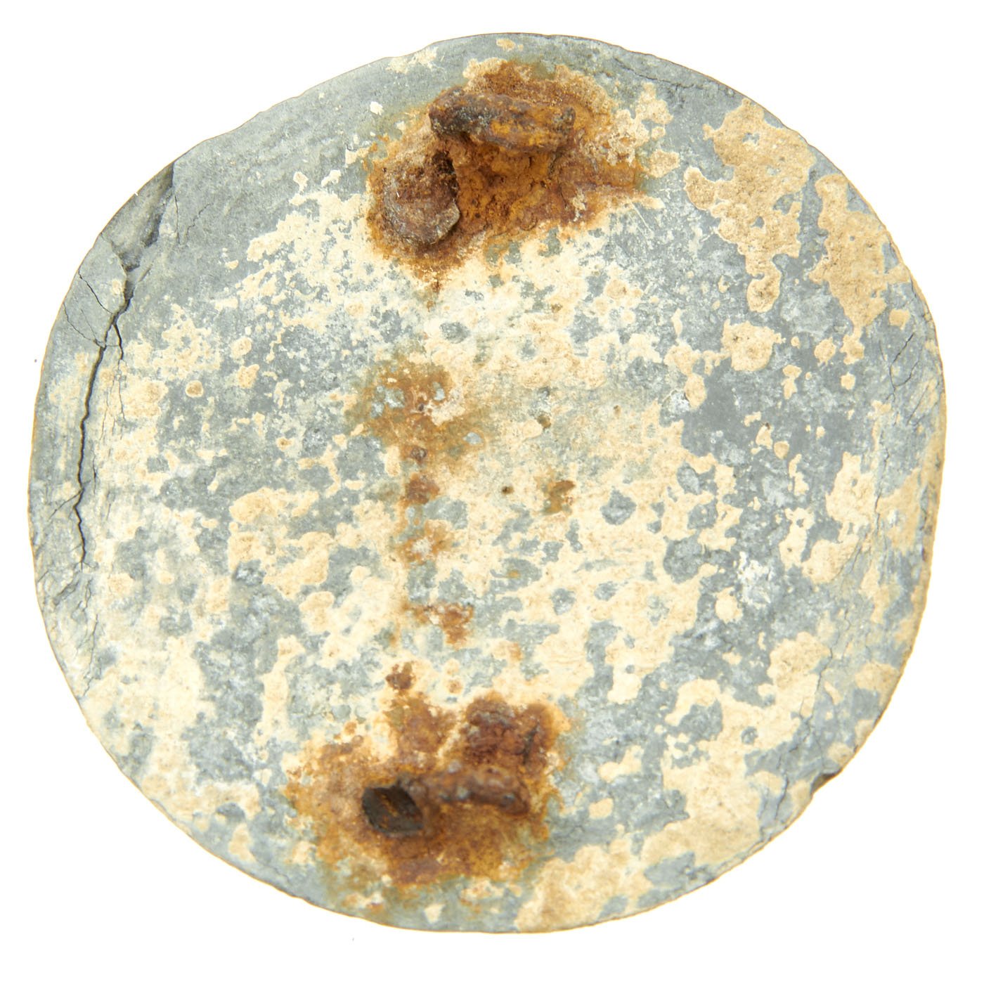 Both mounting loops are still attached but are rusty. The front brass face retains surprisingly crisp details and has aged wonderfully. Minor defects, dents, dings and a slight bend, typical of excavated Civil War relics.