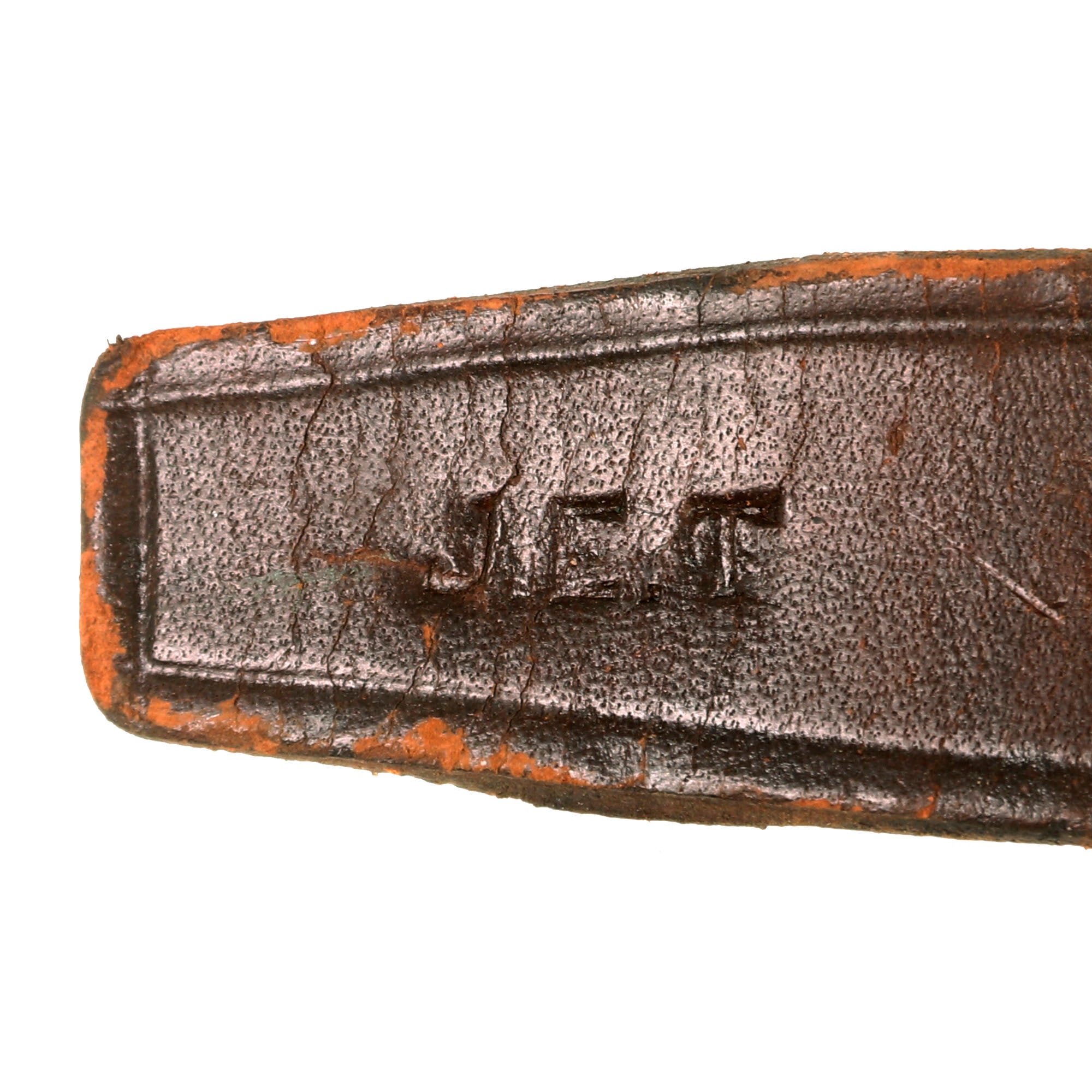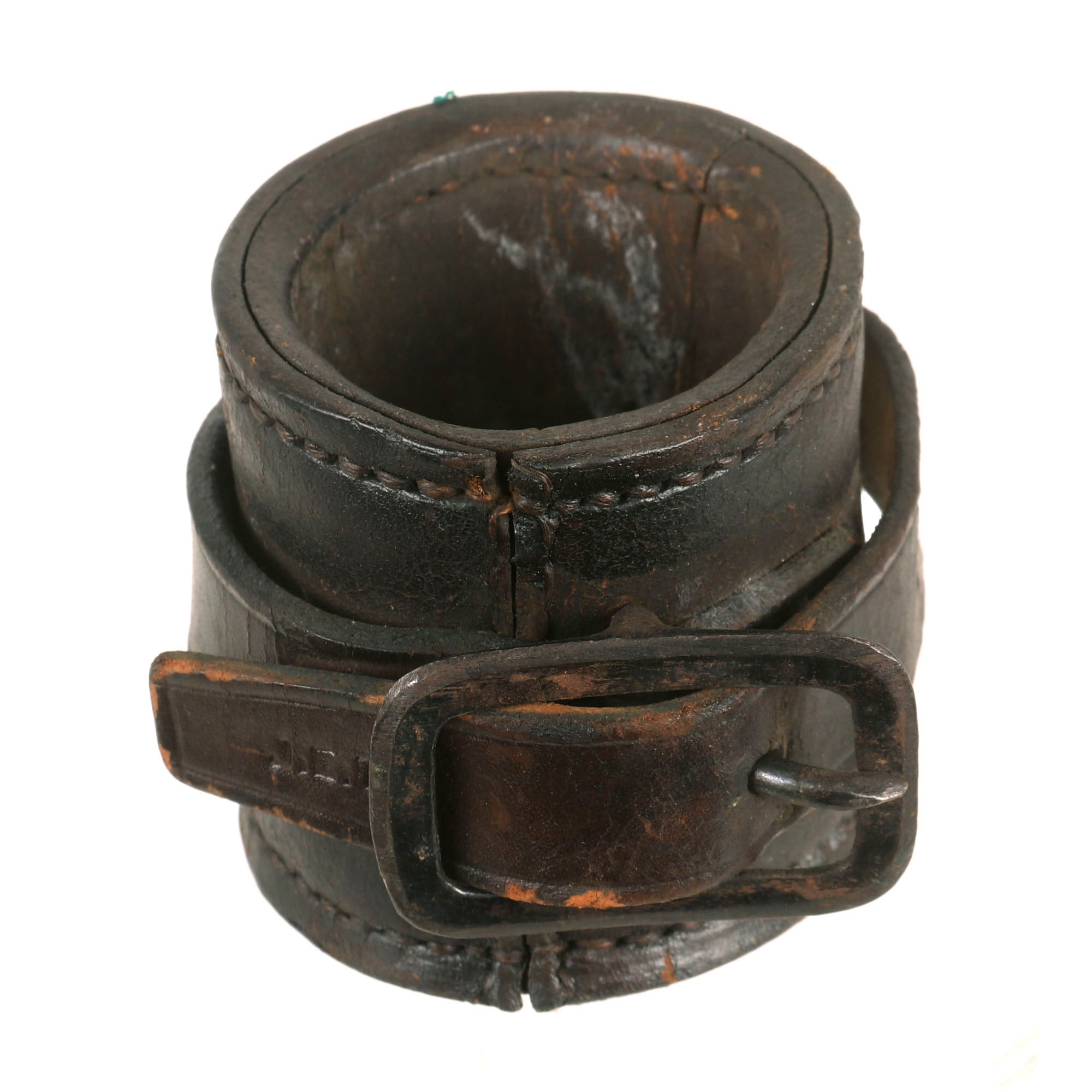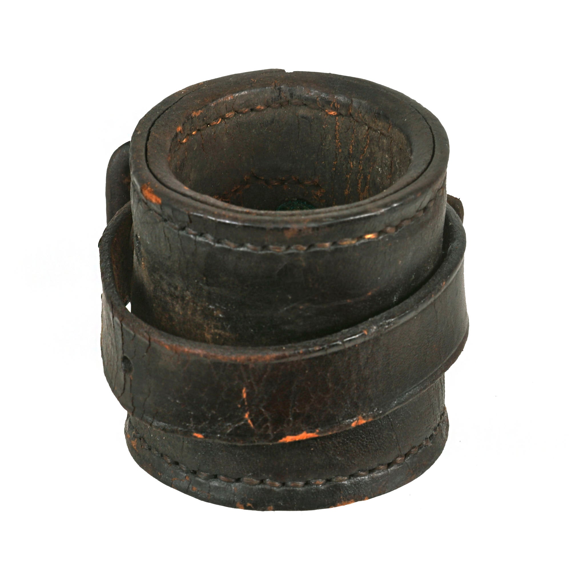 The leather band is a correct and genuine Civil War US issue cavalry carbine thimble. It is a socket of thick sewn leather with a leather strap and buckle stitched to the outside. Strap end stamped JET. These were buckled to the D-ring on the lower right side of the saddle. When riding, the trooper carried his carbine suspended from the carbine sling over his shoulder with the barrel pointing down and thrust through the thimble to keep it from swinging wildly around while the horse was in motion. The leather is worn, dry and cracked but is in otherwise very good display condition.