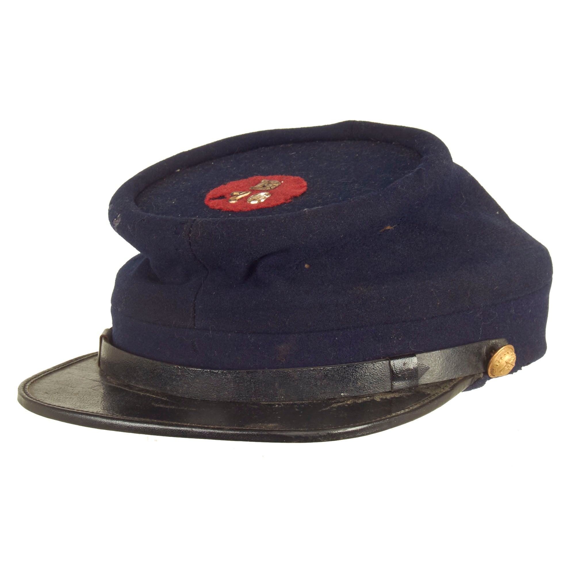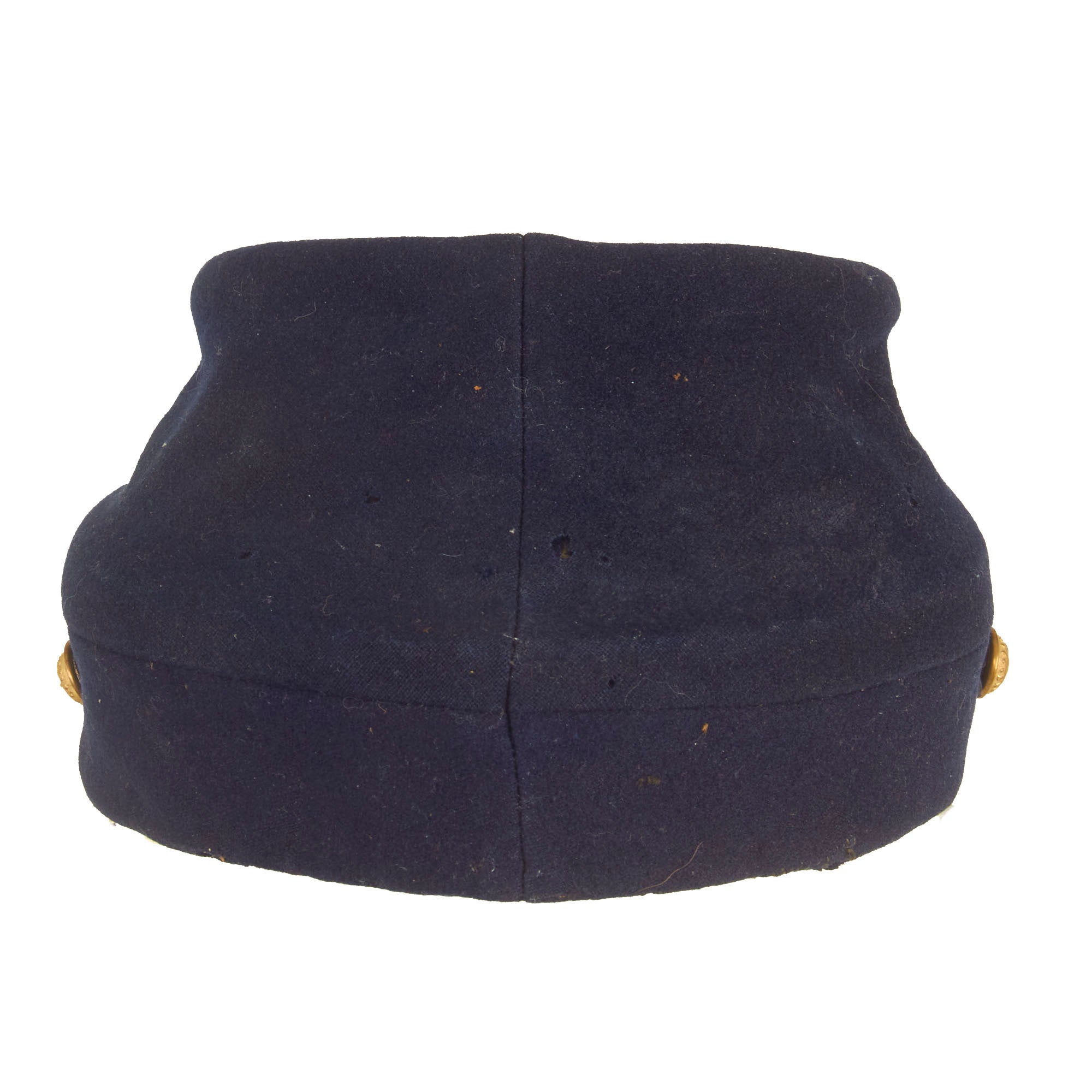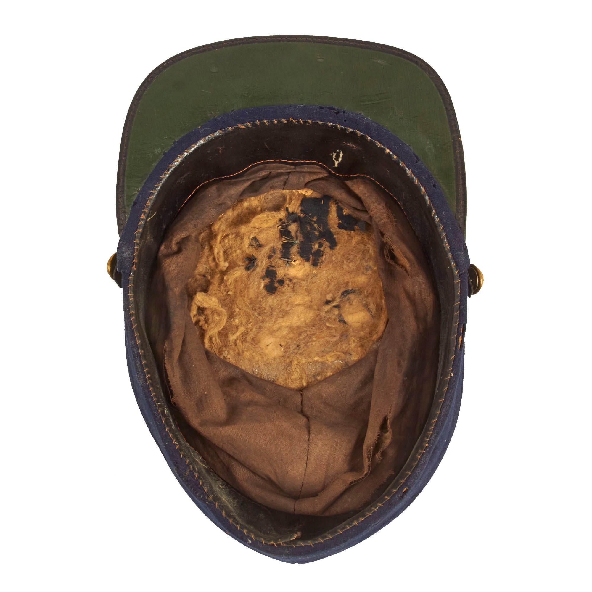 Original Item: Only One Available. This is a fantastic Civil War Union Federal Chasseur Pattern Kepi that features fabric of very fine blue wool broadcloth. The crown stands nearly 3 ¼” high at the front, 5” at the rear seam and the top is 5 ¼” in diameter, stiffened with a pasteboard beneath the lining. The body of the cap meets a band of wool seamed only at the rear and stiffened with leather. The cap's interior is lined with lovely brown cotton and is still mostly intact but does have fraying present on the top. The pressed paper type sweatband is 1 5/8" wide and is presented with cracks with a rather brittle feel to it. The flat visor is original to the hat, and composed of tarred leather and is still completely attached. The leather chinstrap is secured on the side with two New York buttons.