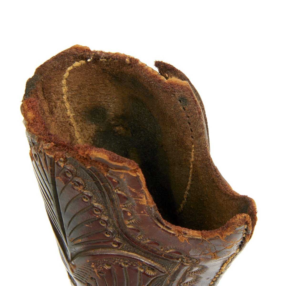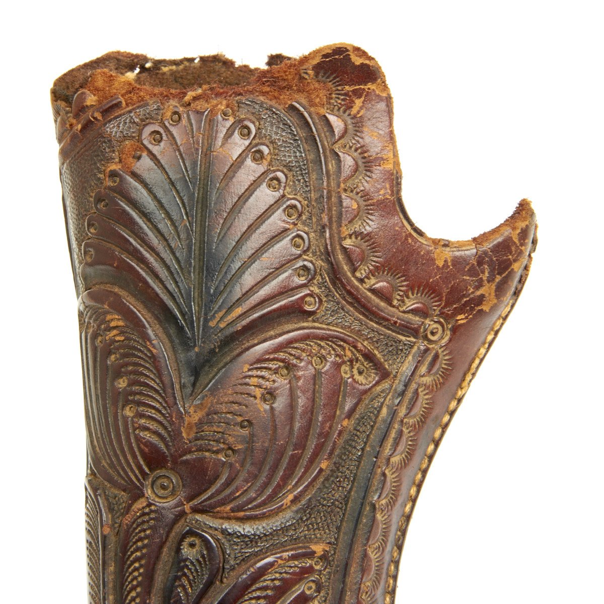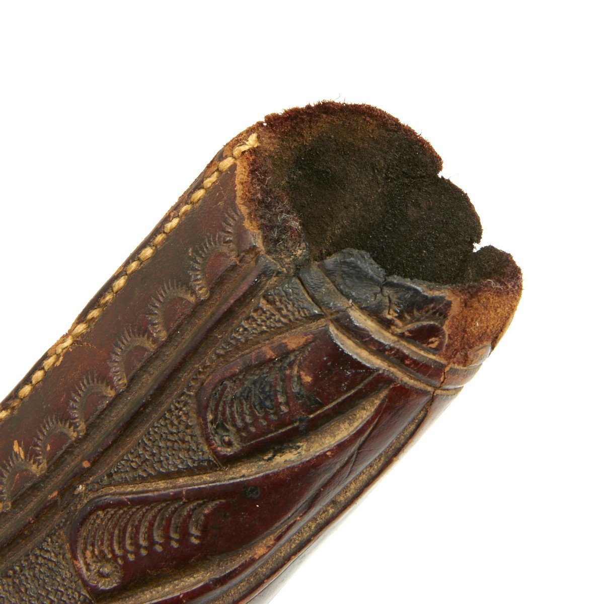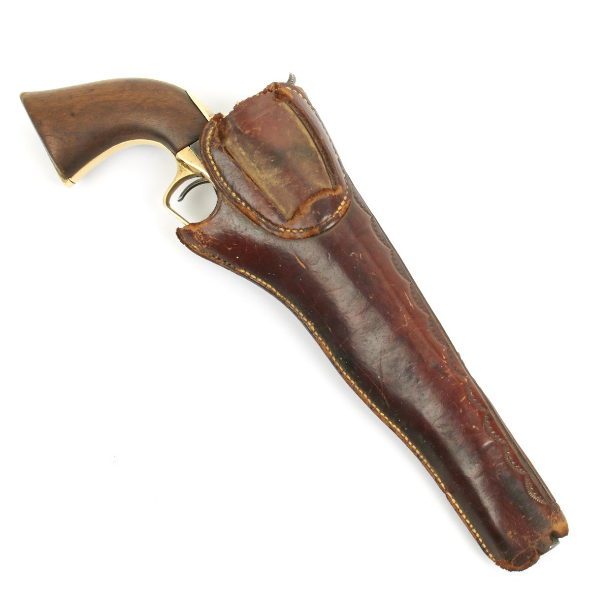 Also included is an original vintage Colt Slim Jim holster, nicely emossed with designs, shows wear and minor damage but still very sturdy. This gun has been inside the holster a long time, which is exactly how we found it.