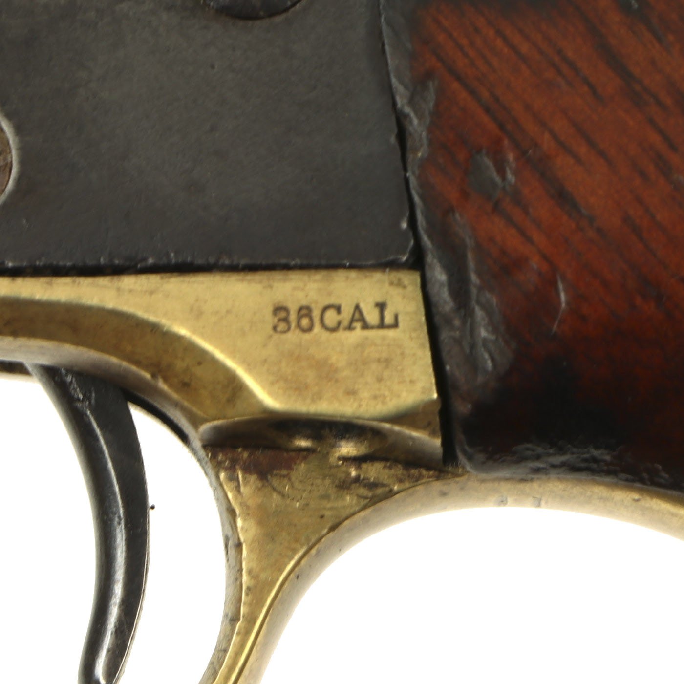 The revolver looks to have seen service during the war, and possibly after. Overall the metal finish is a worn gray patina, with a bit of light pitting in a few areas. The COLTS PATENT marking is still visible on the left side of the frame, and the trigger guard still has the correct 36 CAL marking. The bore shows clear lands and grooves, however also fouling and areas of oxidation. The revolver cycles correctly, with good indexing and cylinder lock up. It can however be a bit finicky, as with any revolver of this age. The grip scales are in very good condition, with a lot of the original "piano varnish" finish present.
