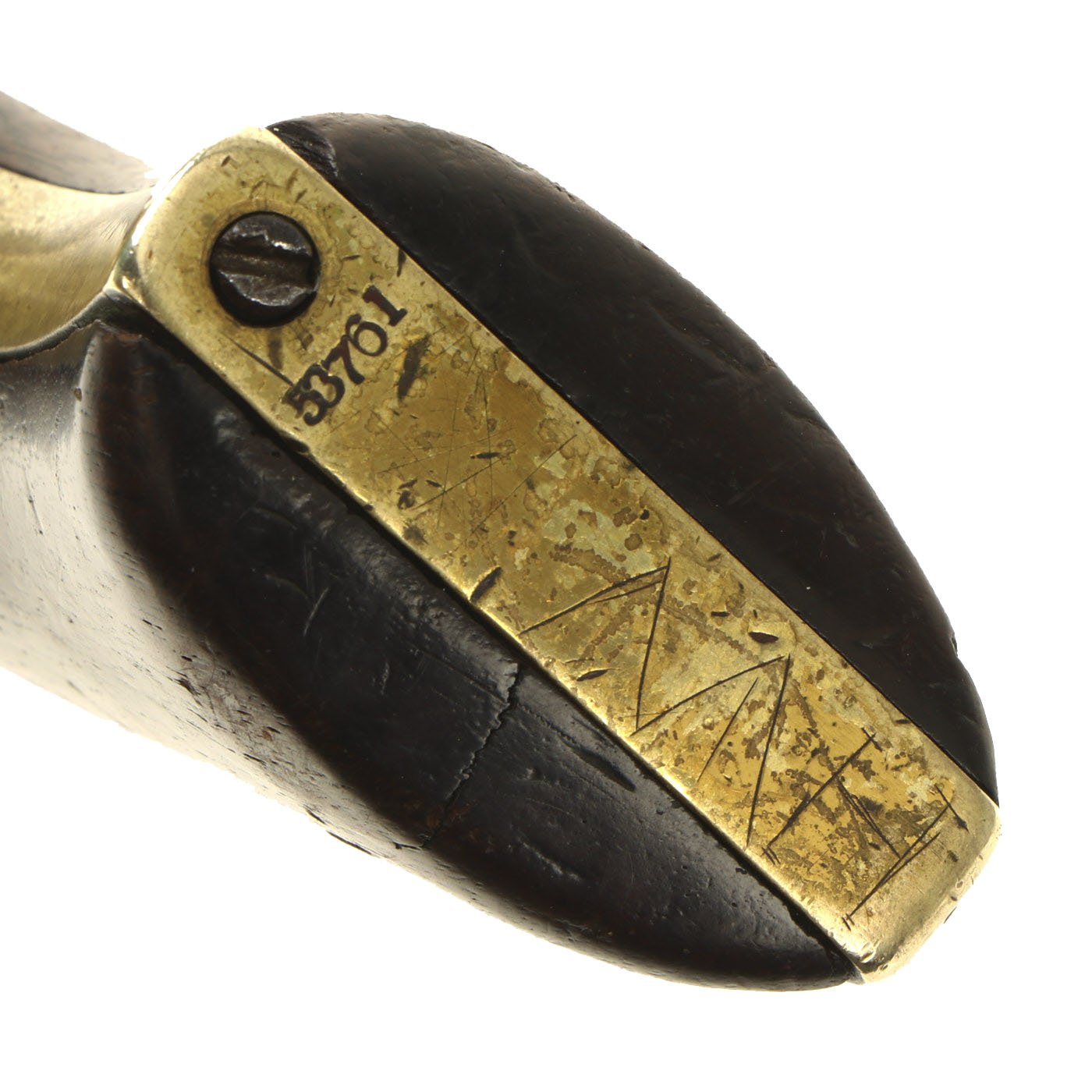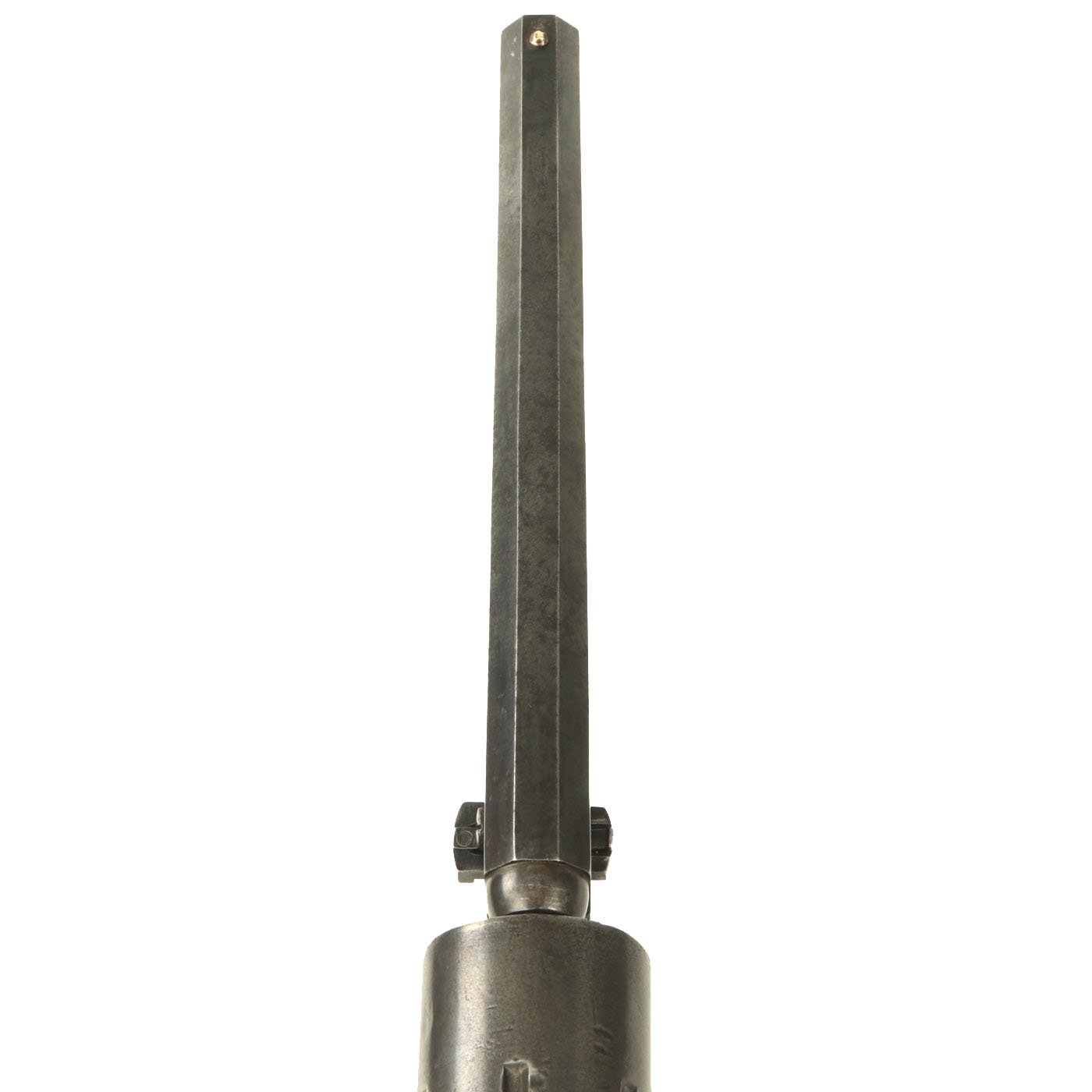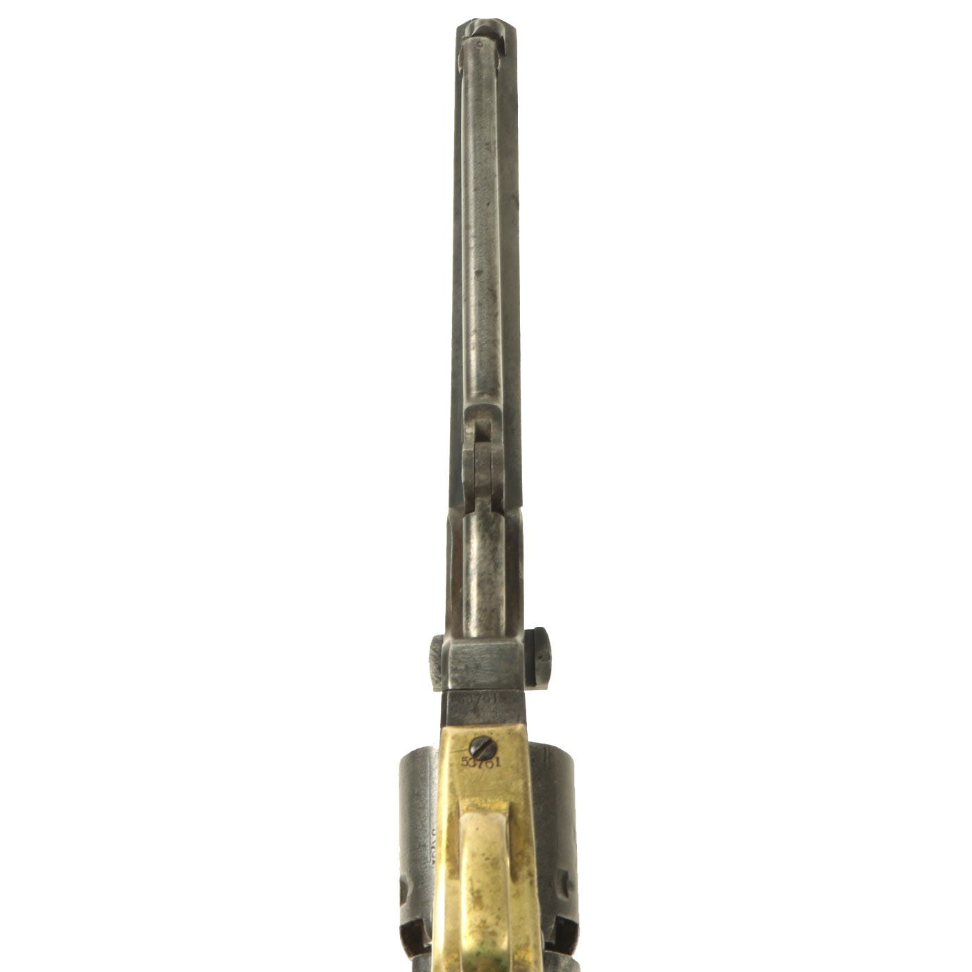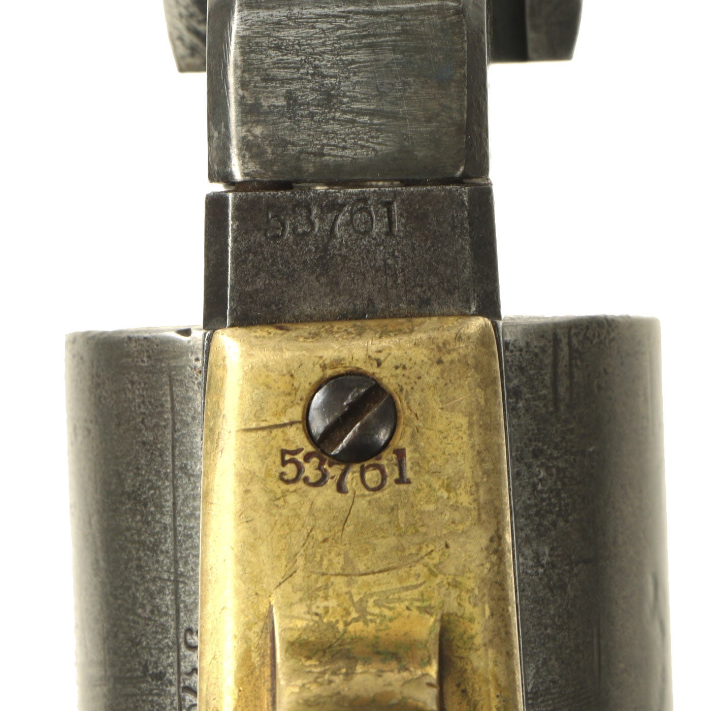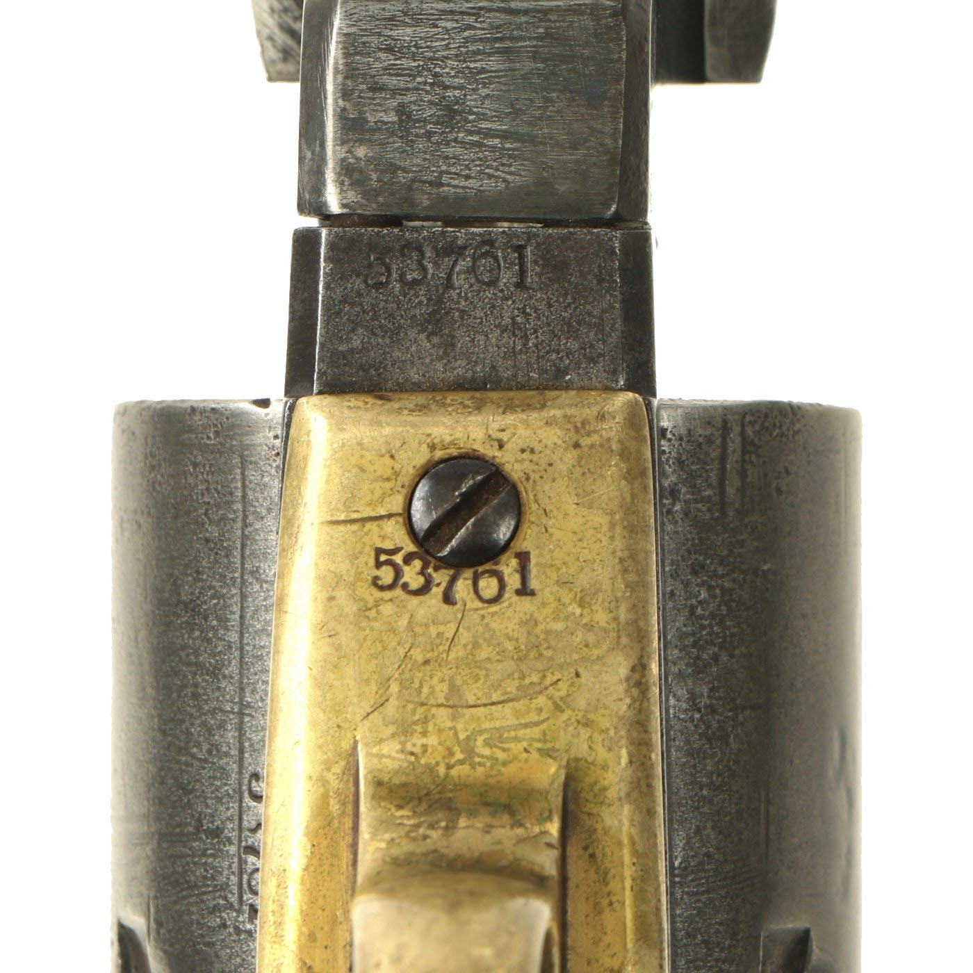 This very nice example features a standard 7 1/2" barrel and serial number 53761 on the frame, trigger guard, grip frame, cylinder axis pin, and cylinder! The barrel wedge is an unmarked arsenal replacement, and the barrel itself is marked with an arsenal P proof and 761 under the loading rammer. The barrel seems to have been replaced with an unmarked barrel during arsenal servicing. Serial number records indicate production in 1856, so this was made years before the outbreak of the Civil War. However, it looks to have seen long service, and with the arsenal repairs, it almost certainly saw action during the conflict. It is marked with U.S. under the COLTS PATENT marking on the frame, so it was definitely a military issued revolver.
