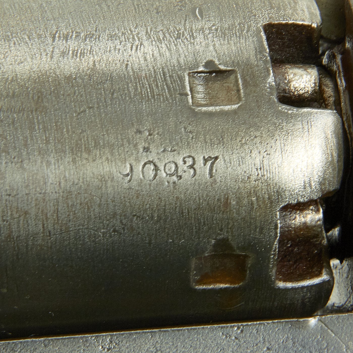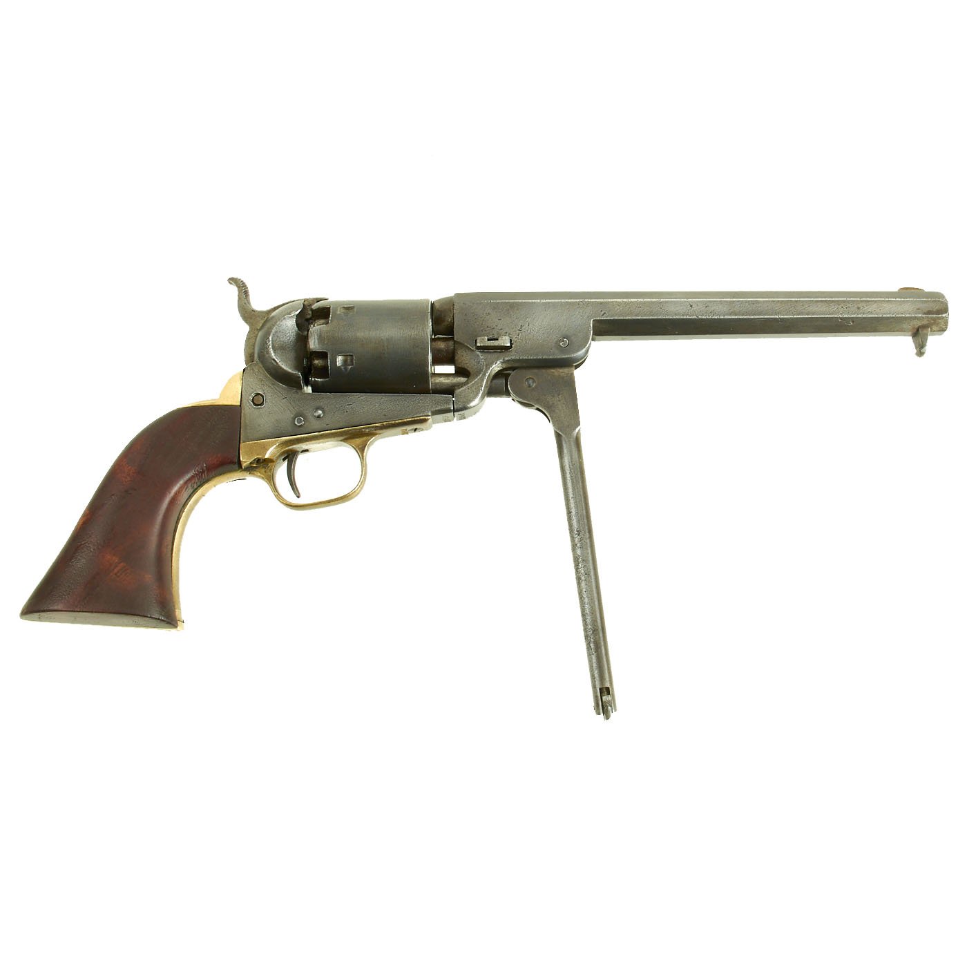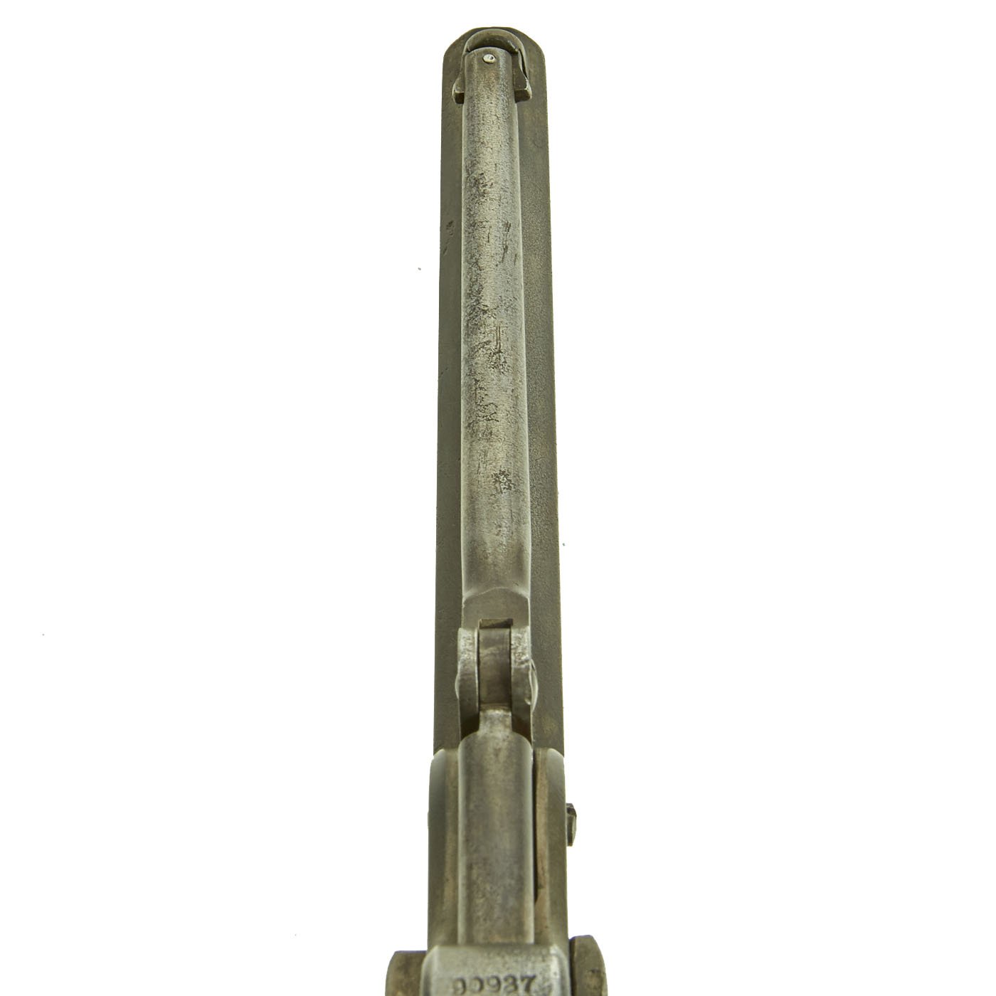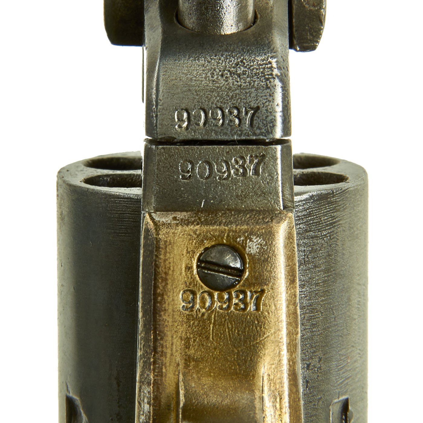 This very nice example features a 7½" barrel and matching serial number 90937 on almost every part, including barrel, frame, trigger guard, loading rammer, cylinder, barrel wedge, and cylinder axis pin! Only the grip frame is not matching, and has no number at all, probably due to being worn away.