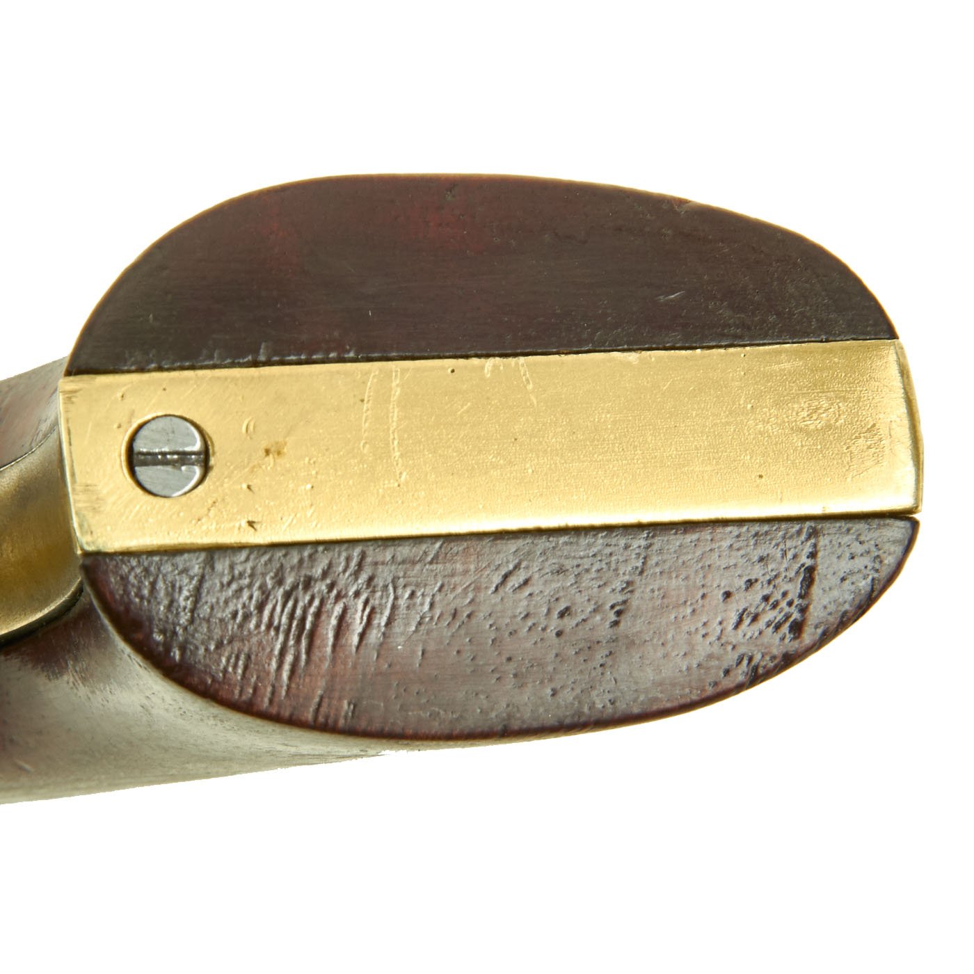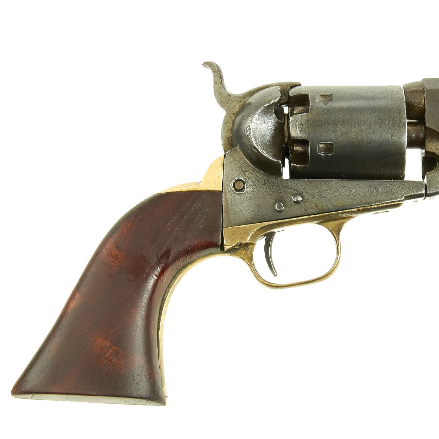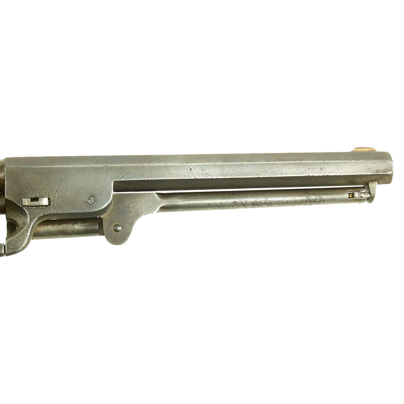 This Colt Navy revolver dates from just before the civil war, and looks to have seen service during the war, and possibly after. Overall the metal finish is a worn gray patina, though there is no major rust or damage, as shown. The bore shows clear lands and grooves, however also wear and areas of past oxidation. The revolver cycles correctly, though as with any revolver of this age, it can be finicky, as they were when new. Tipping the revolver forward results in it cycling more consistently.
