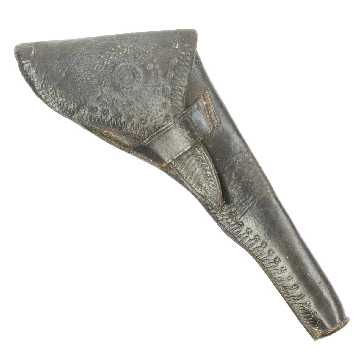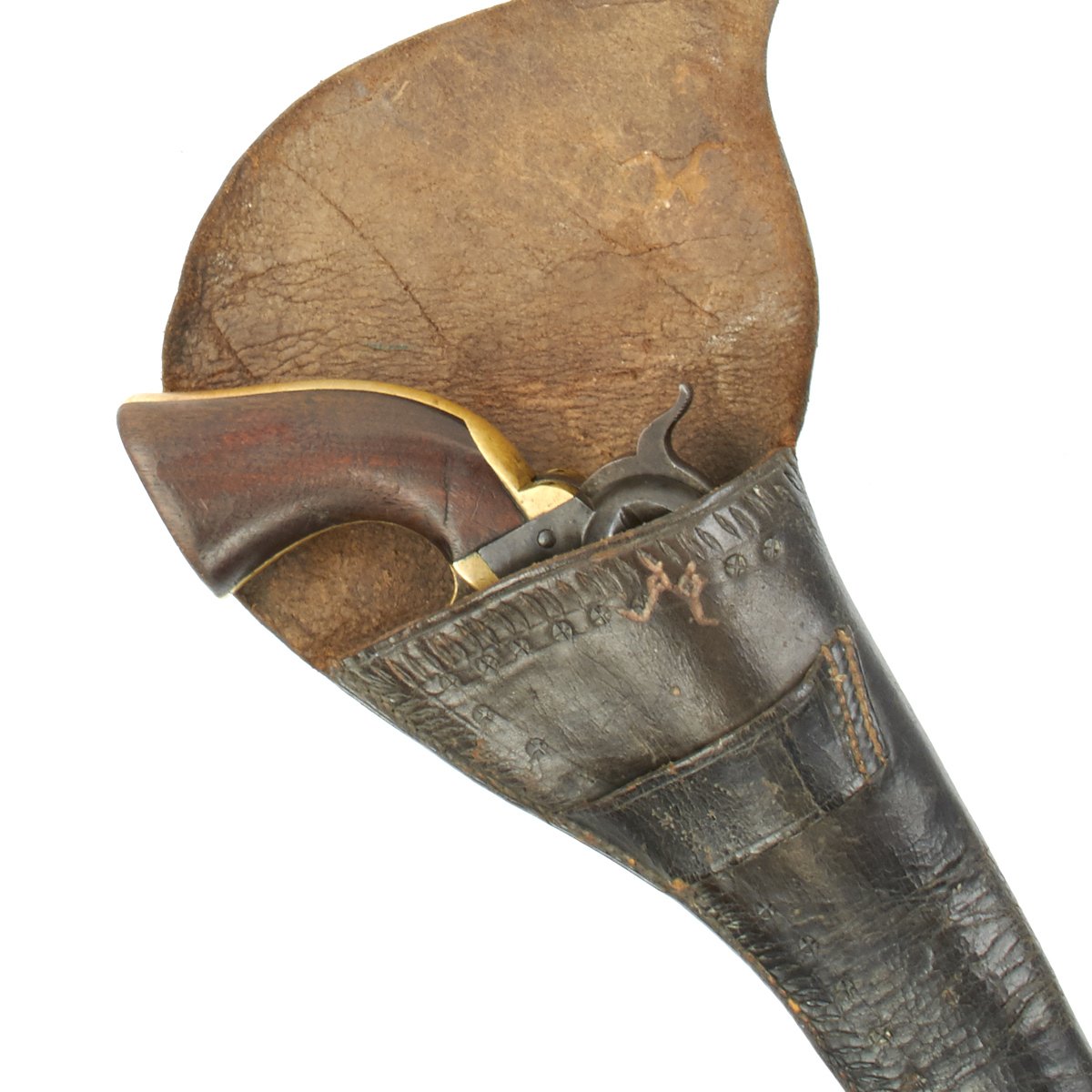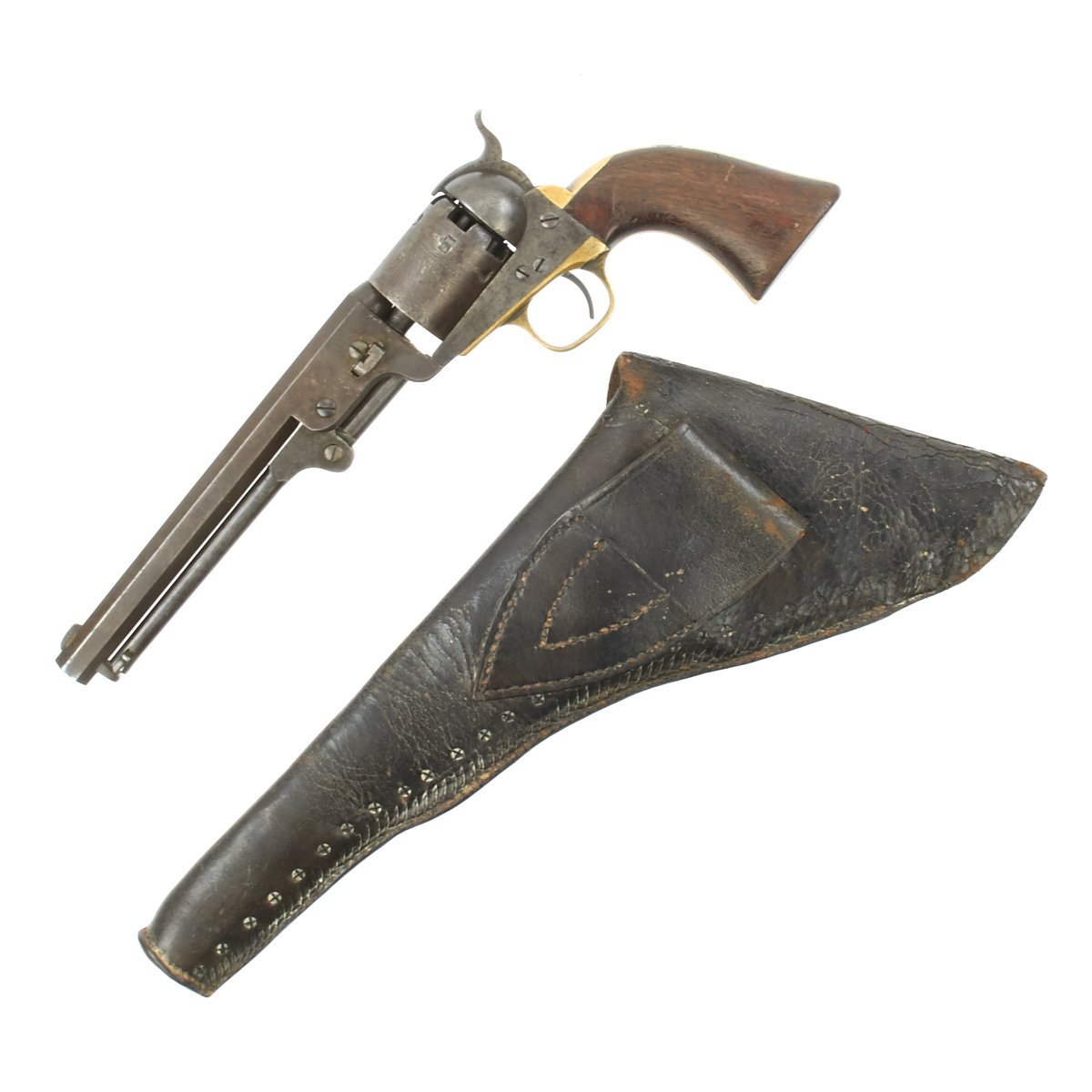 Original Item: Only One Available. This looks like it has come straight out of the attic! 156 years old with very low mileage and a great embossed tooled leather flap holster! The Colt Navy Model 1851 Percussion Revolver in .36 caliber was widely used by both sides in the U.S. Civil War. The Colt Revolving Belt Pistol of Naval Caliber (i.e., .36 cal), later known as the Colt 1851 Navy or Navy Revolver, is a cap and ball revolver that was designed by Samuel Colt between 1847 and 1850. Colt first called this Revolver Ranger model; but the designation Navy quickly took over. It remained in production until 1873, when revolvers using fixed metallic cartridges came into widespread use.