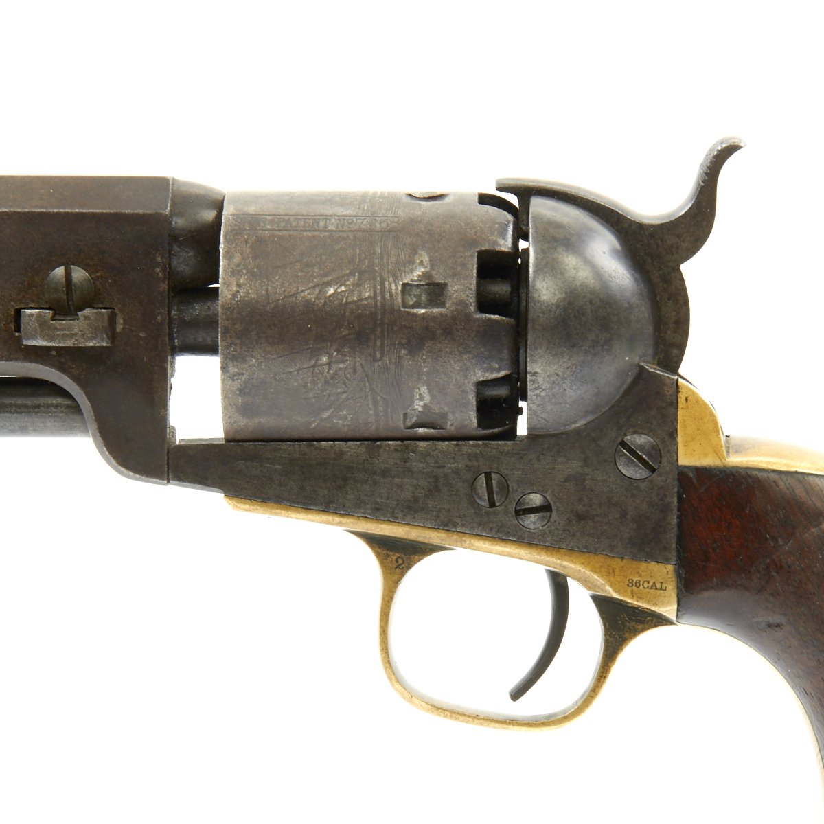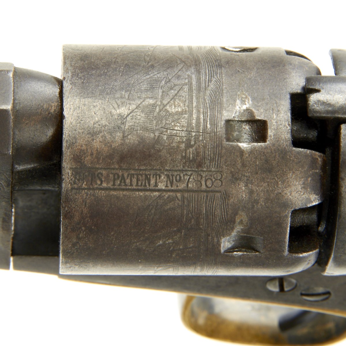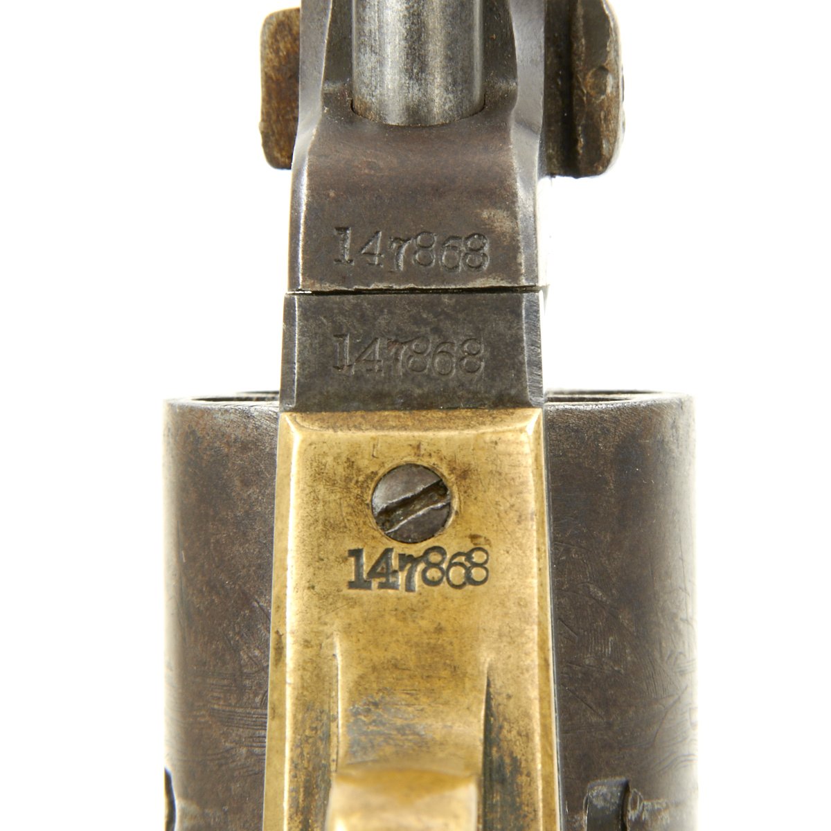 This very nice example is in choice condition, and has matching serial numbers 147868 on all parts including barrel, frame, grip, trigger guard and cylinder (marked 7868)! There is also most of the original "Naval Engagement" engraving on the cylinder! The water, ships, and sails are all there and easily visible. It's very rare to see one in this condition!