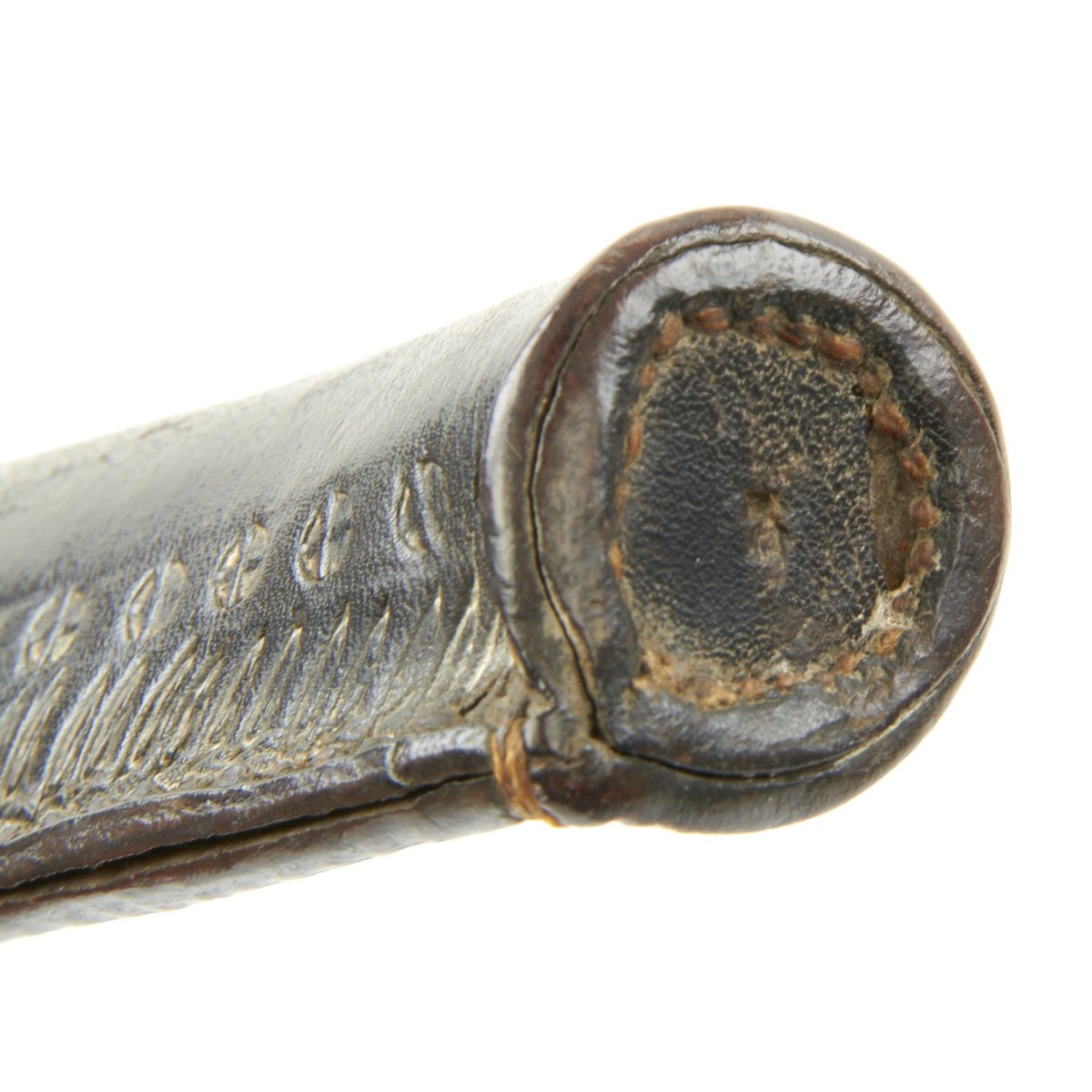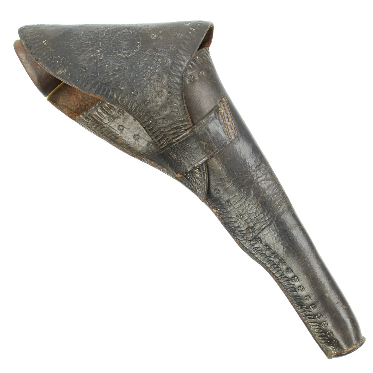 This Colt Navy revolver dates from the middle of the civil war, and is still in tight excellent working condition and retains all matching numbers. It comes with a very nice original period tooled embossed leather flap holster, which is in very nice condition. The leather is supple, and all the stitching intact. The surface has been worked very nicely with embossed designs, making it very attractive.