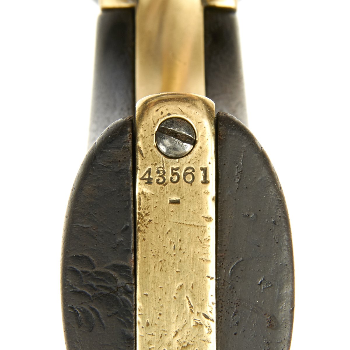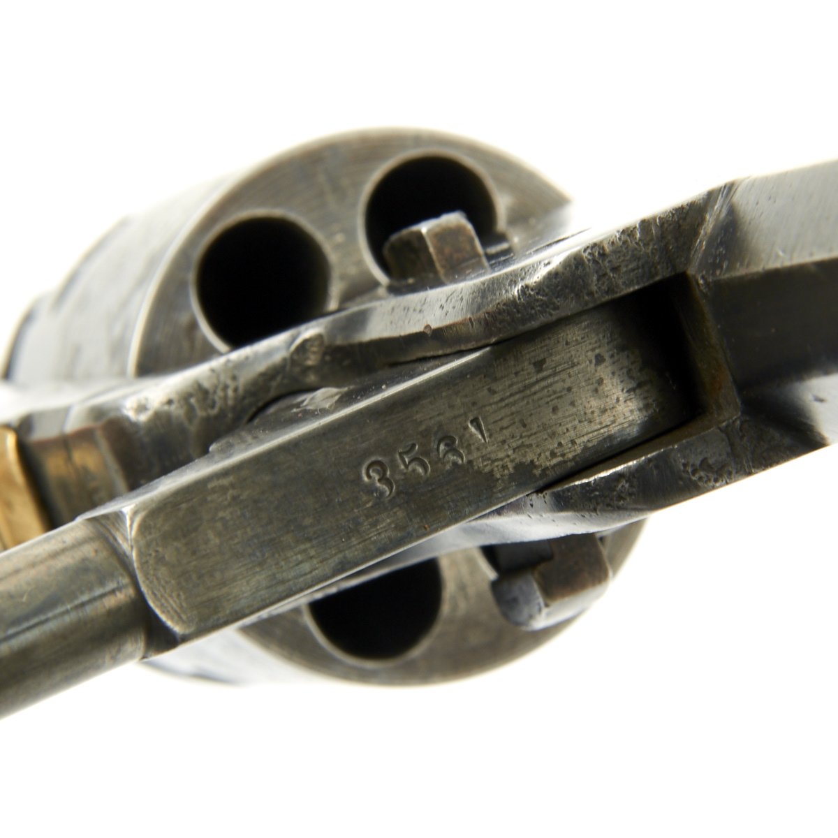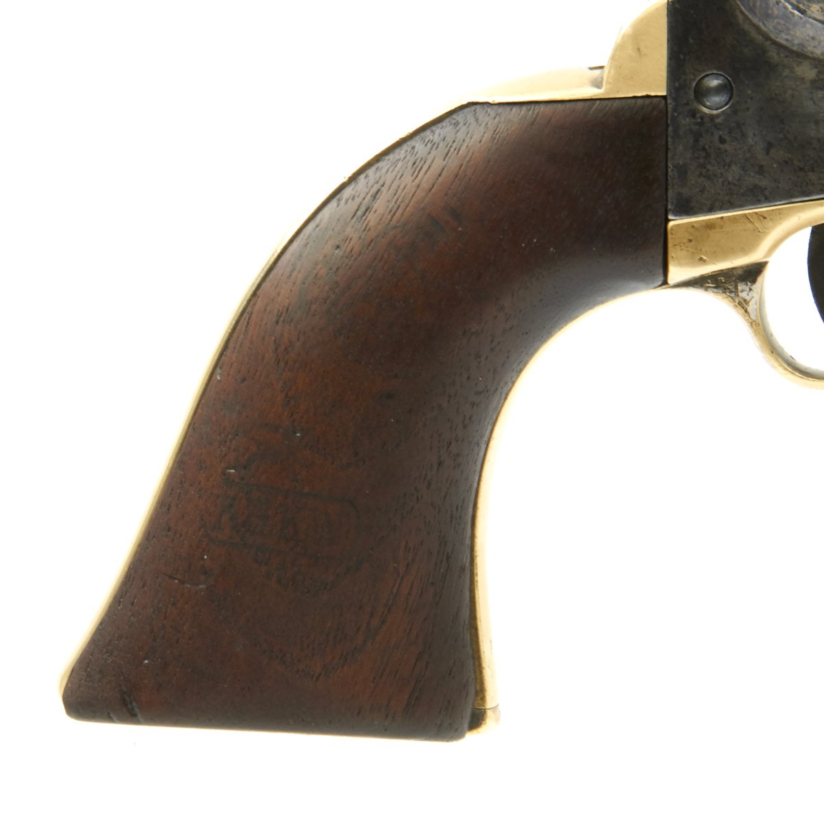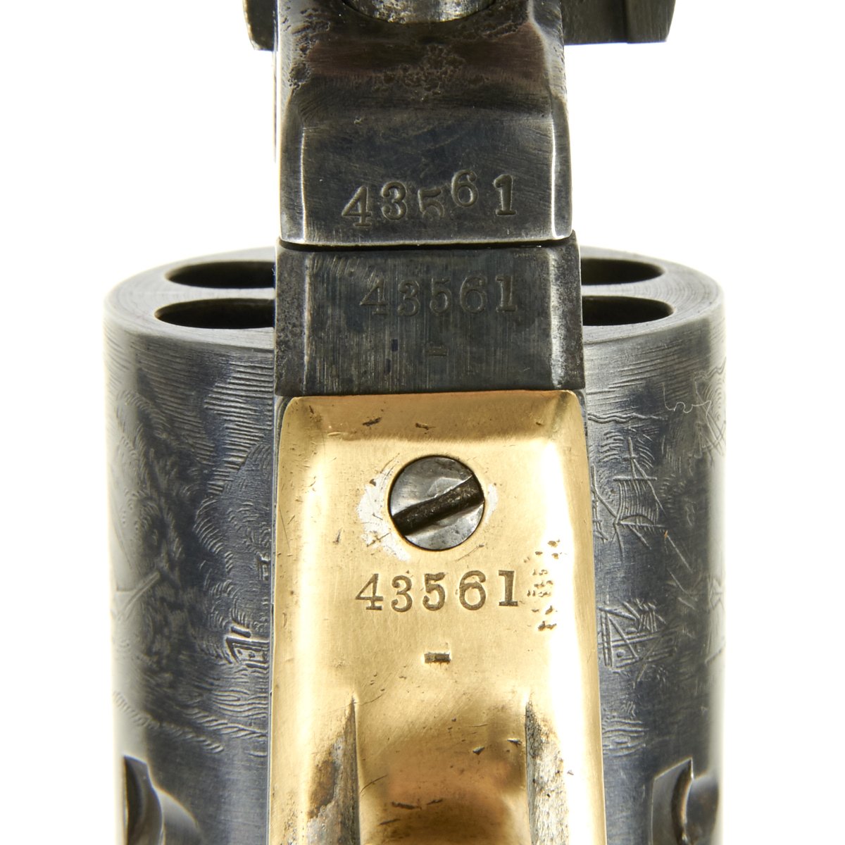 This very nice example is in choice condition, and has matching serial numbers 43561 on all parts including barrel, frame, grip, barrel wedge, trigger guard and cylinder! This indicates production in 1855, according to Colt firearms records. There is also most of the original "Naval Engagement" engraving on the cylinder! The water, ships, and sails are all there and easily visible. It's very rare to see one in this condition!