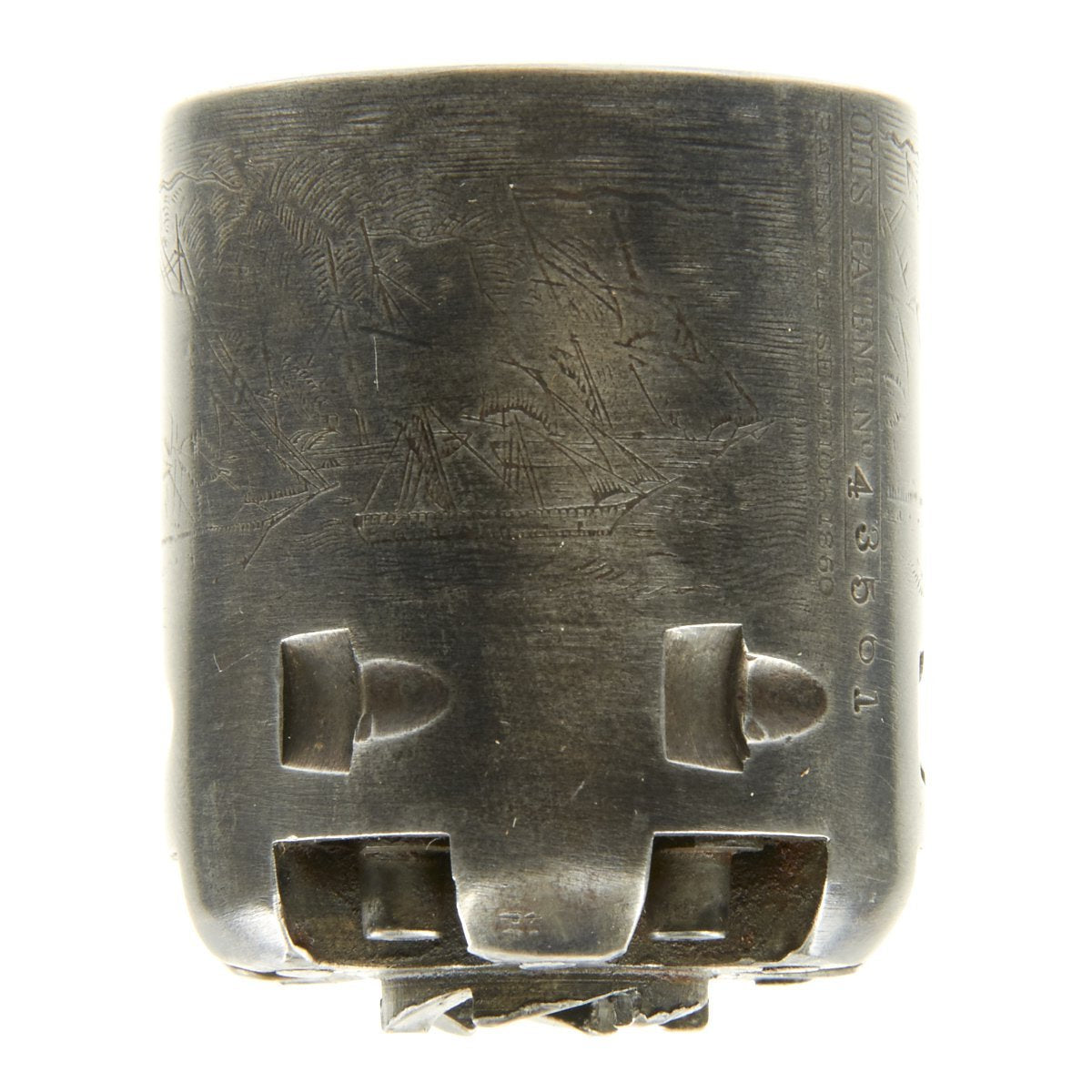 The cylinder of this revolver is engraved with a scene of the victory of the Second Texas Navy at the Battle of Campeche on May 16, 1843. The Texas Navy had purchased the earlier Colt Paterson Revolver, but this was Colt's first major success in the gun trade; the naval theme of the engraved cylinder of the Colt 1851 Navy revolver was Colt's gesture of appreciation. The engraving was provided by Waterman Ormsby. Despite the "Navy" designation, the revolver was chiefly purchased by civilians and military land forces.