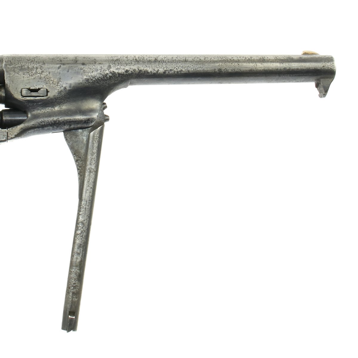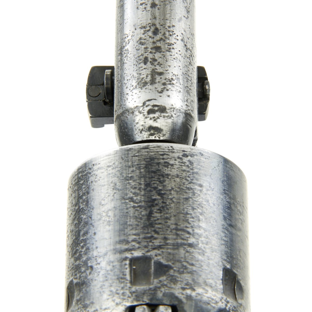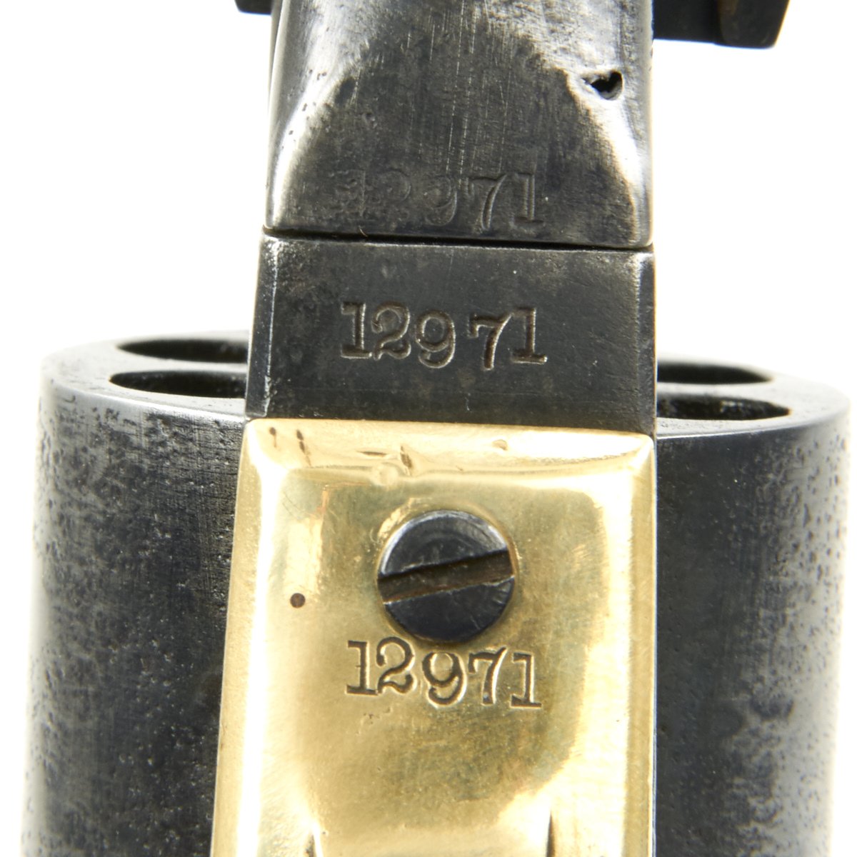 Our example has a Serial Number of 12971, and was actually made in 1863. It is in the expected 36 caliber and was almost certainly used in the Civil War. It shows much use, its finish mostly worn away leaving minor scattered pits. However the revolver is totally original and is still tight in the action, with proper cylinder advance and lockup. Serial number matches on barrel, frame, trigger guard, and grip bottom strap, but is worn and unreadable on the cylinder. Only traces of the original markings on the top of the barrel can be seen, but the action still has a clear COLTS / PATENT on the left side plate.