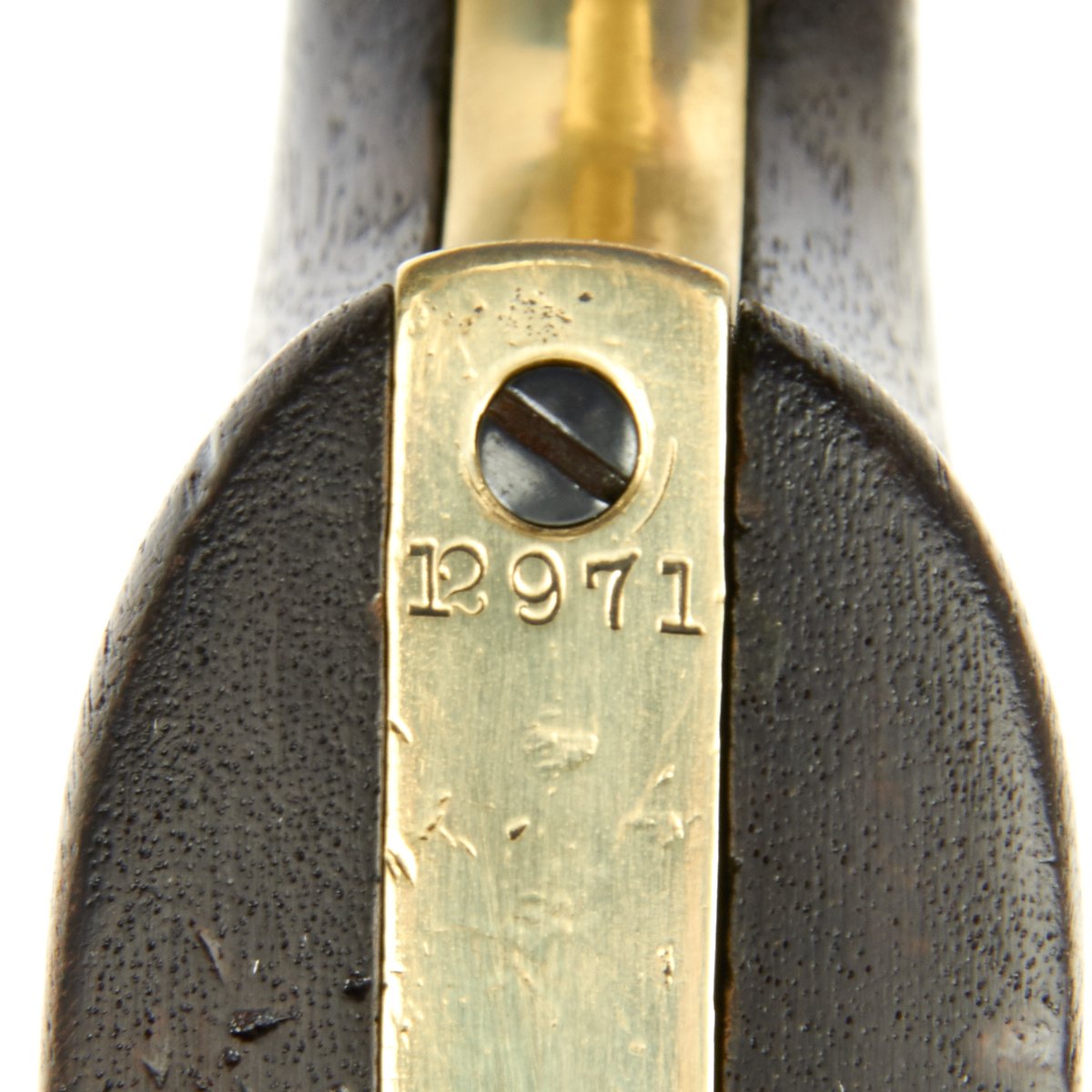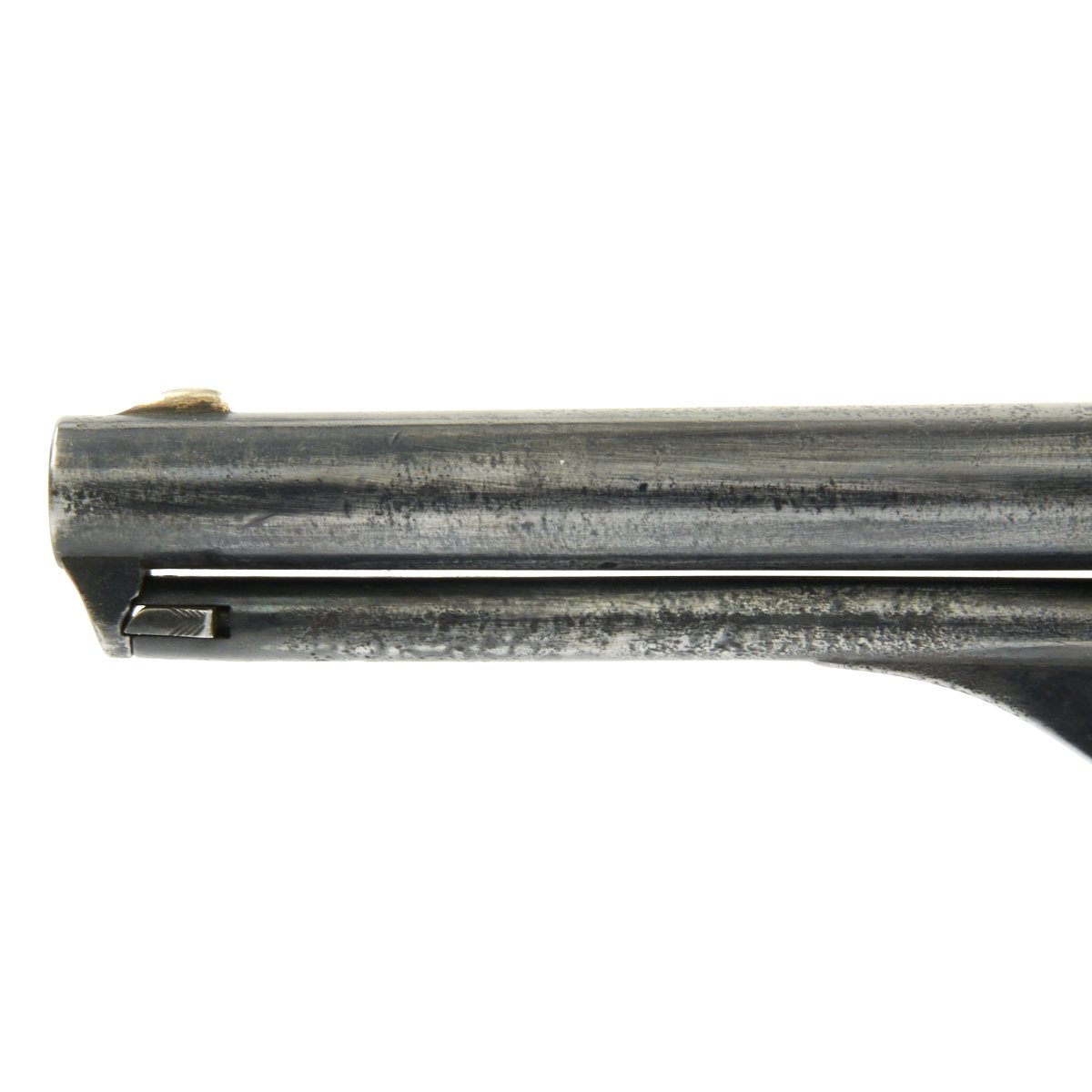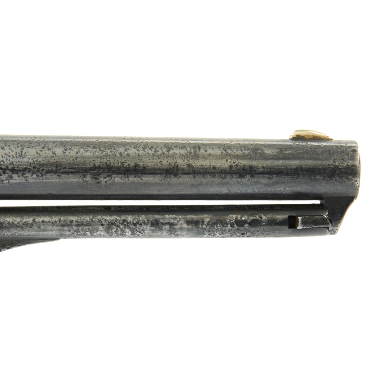 Our example has a Serial Number of 12971, and was actually made in 1863. It is in the expected 36 caliber and was almost certainly used in the Civil War. It shows much use, its finish mostly worn away leaving minor scattered pits. However the revolver is totally original and is still tight in the action, with proper cylinder advance and lockup. Serial number matches on barrel, frame, trigger guard, and grip bottom strap, but is worn and unreadable on the cylinder. Only traces of the original markings on the top of the barrel can be seen, but the action still has a clear COLTS / PATENT on the left side plate.