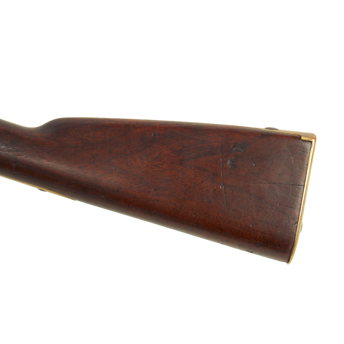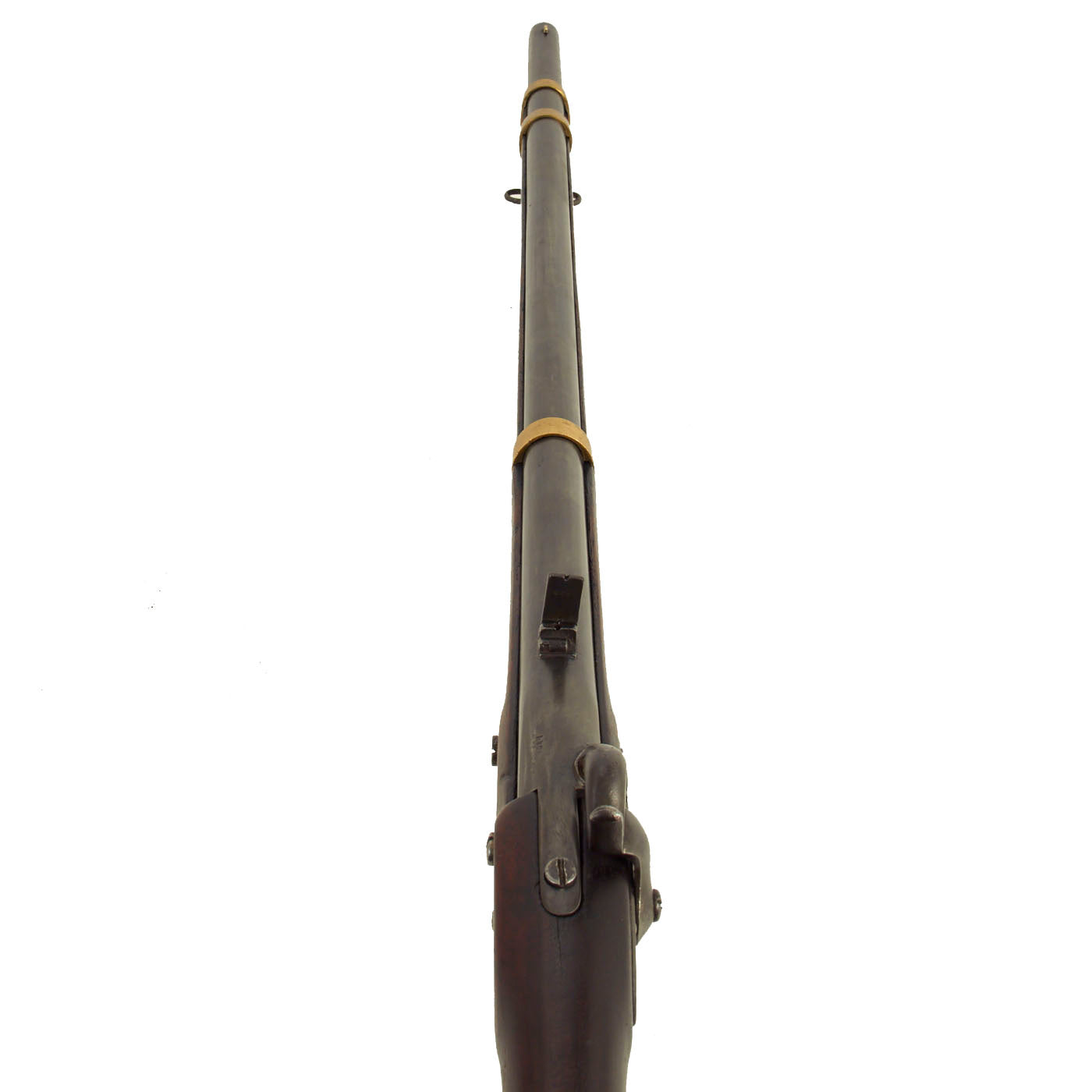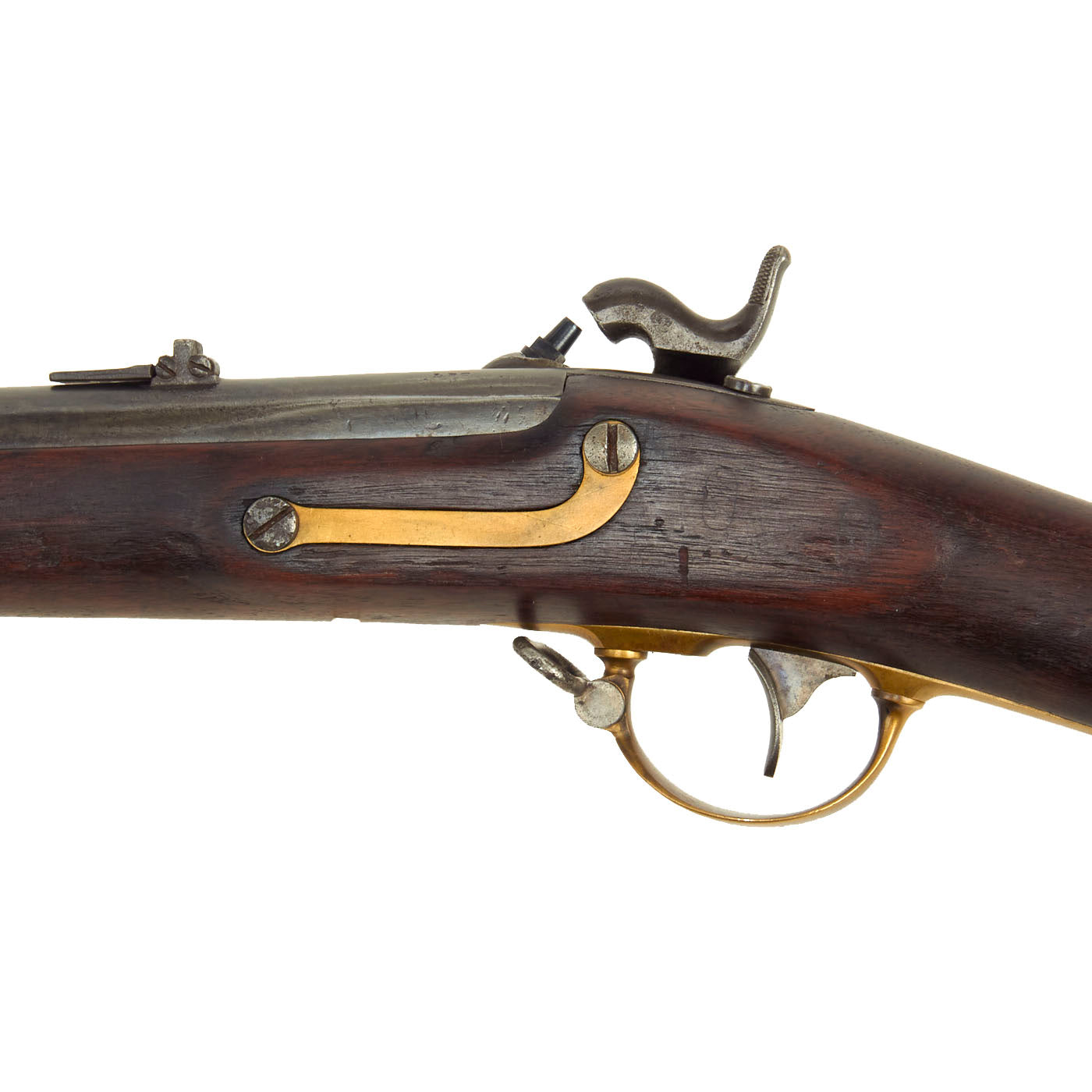 This example is very nice service used condition, a real nice example of this type, and still retains the Colt 1855 Rear sight, though it is slightly damaged. The front bayonet lug ring is often removed, as it was on this example. The lock plate is marked ROBBINS / & / LAWRENCE / U.S. under the hammer, with WINDSOR VT / 1850 across the lock plate tail. It is also marked with number 398 on the underside of the barrel by the nose cap, which would usually match the number on the bayonet ring. It shows no signs of further alteration after it was converted to .58, and really looks nice!