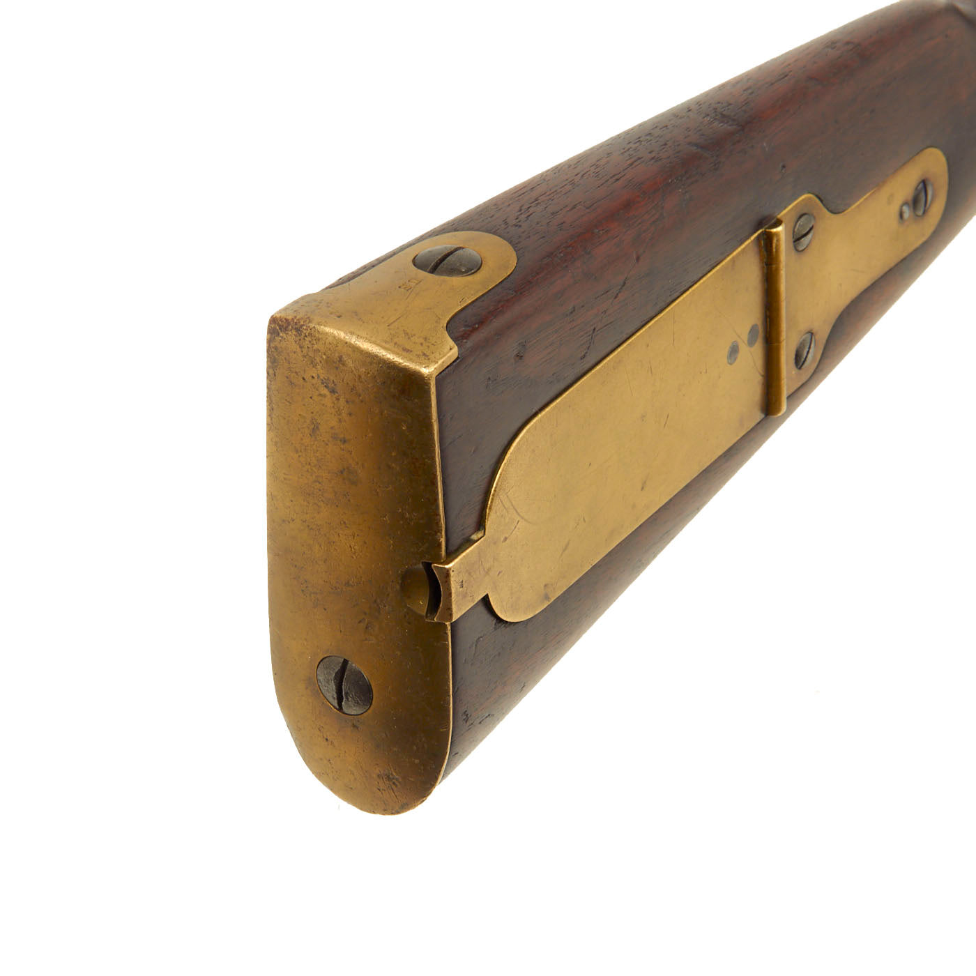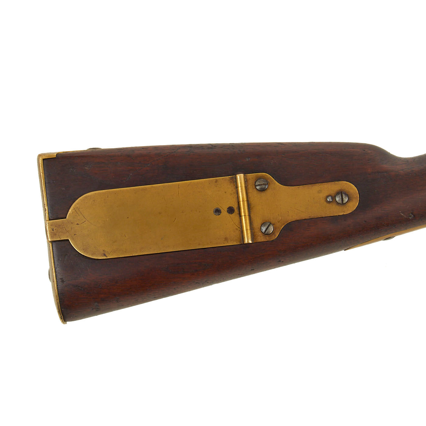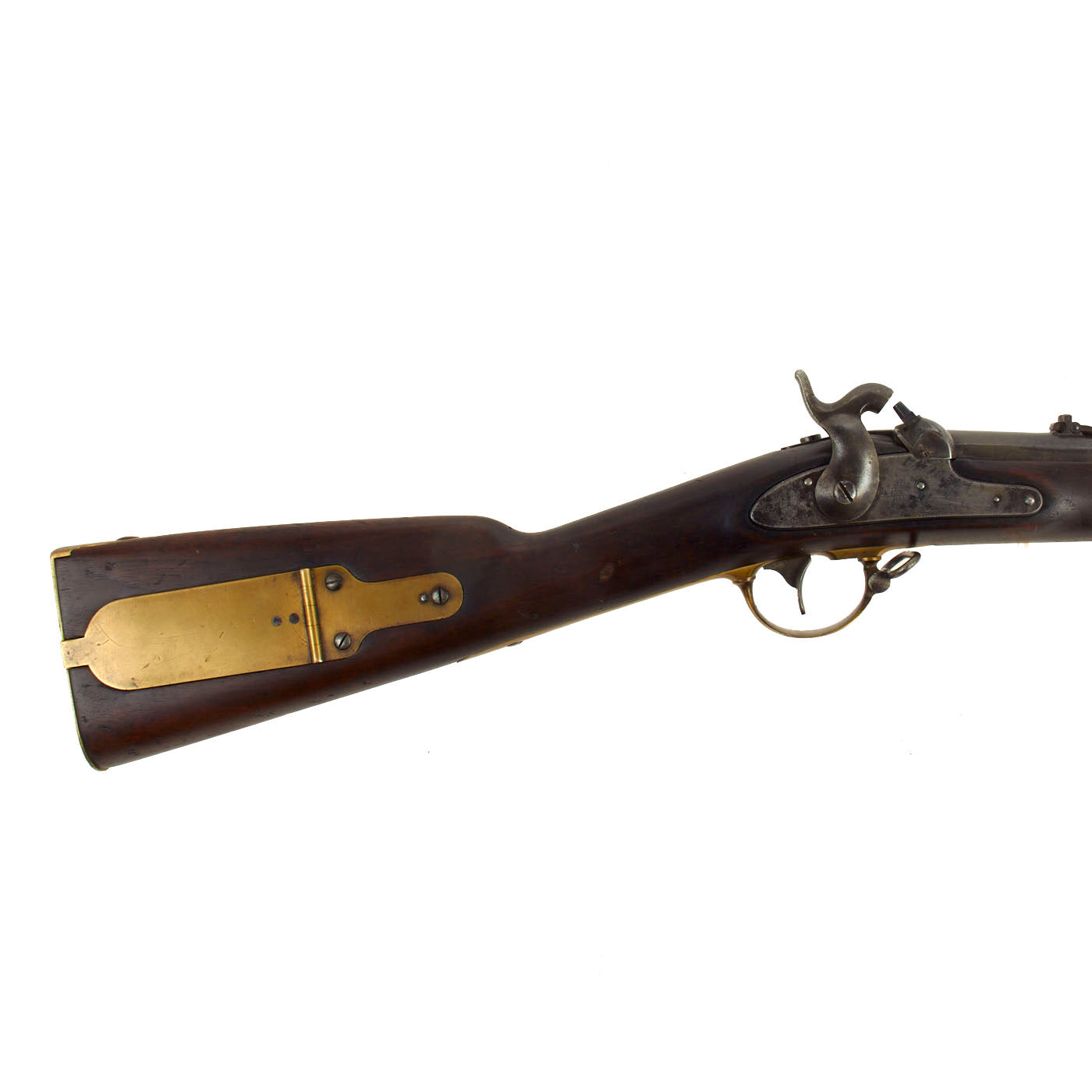 The weapon is fully brass mounted including a brass patch box to the Butt, which was used for storage of patches and sometimes bullets, as well as spare cap nipples. This way if the nipple broke or was clogged, it could easily be replaced. It was also used to store tools such as the clearing worm and Springfield multi-tool, however the box compartment is empty on this example unfortunately.