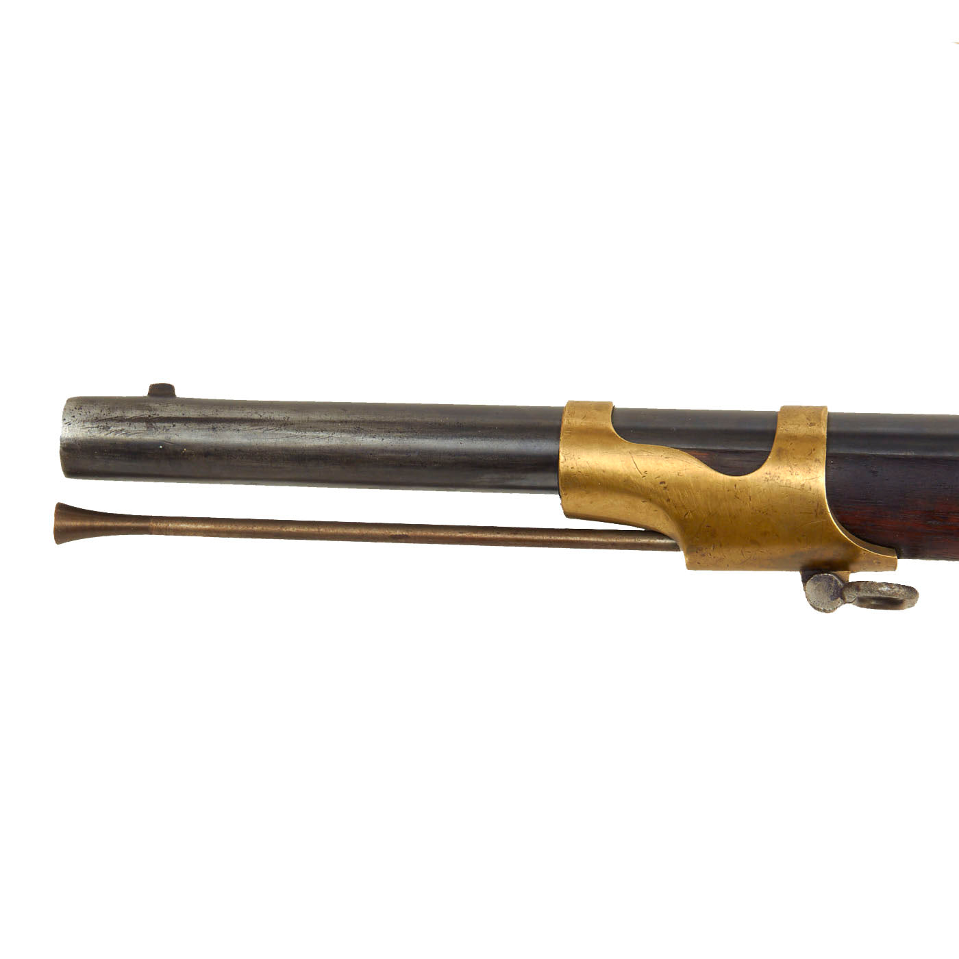 The stock on this rifle has a lovely red brown color, and has a very nice finish, with the expected wear from age. There are no cracks or other major damage that we can see. Both sling swivels are still present, as is the original brass tipped ramrod, which has intact threading on the other end. It does however look to have had the front end turned down at some point. The lock functions correctly, holding at half cock and firing at full. We checked the bore, and the rifling is still clear, showing moderate wear from service, with dirt and fouling in the grooves. Previous examples we have had were so used that they were almost smoothbore, so this is definitely a very good example!