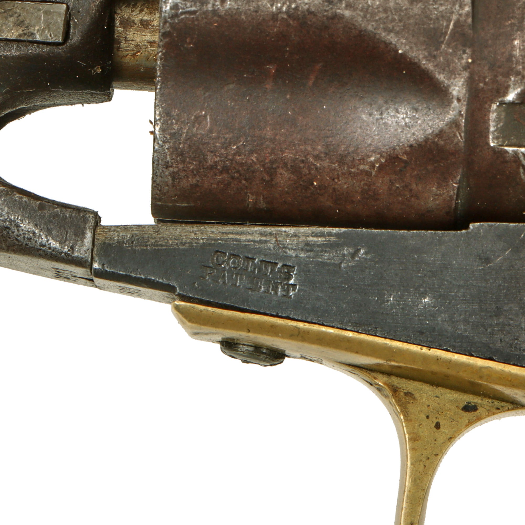 The cylinder still has the original PAT SEPT 10th 1850 marking inside one of the flutes, and the frame is correctly marked COLTS PATENT. There is also a clear 36CAL stamped on the left side of the trigger guard, which we do not often see. As we usually see, along with the serial number, the "safety pins" on the back of the cylinder are also completely gone. Top of the barrel still has the original Colt markings clearly visible: