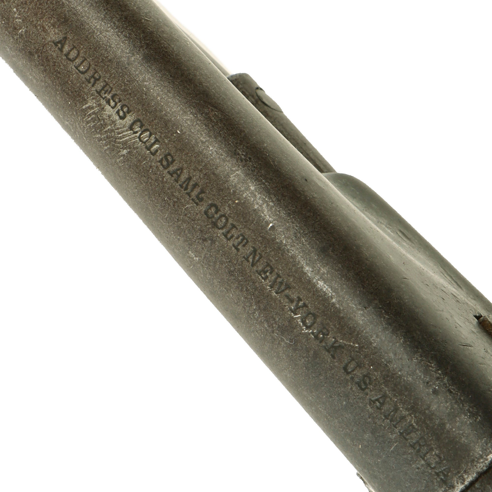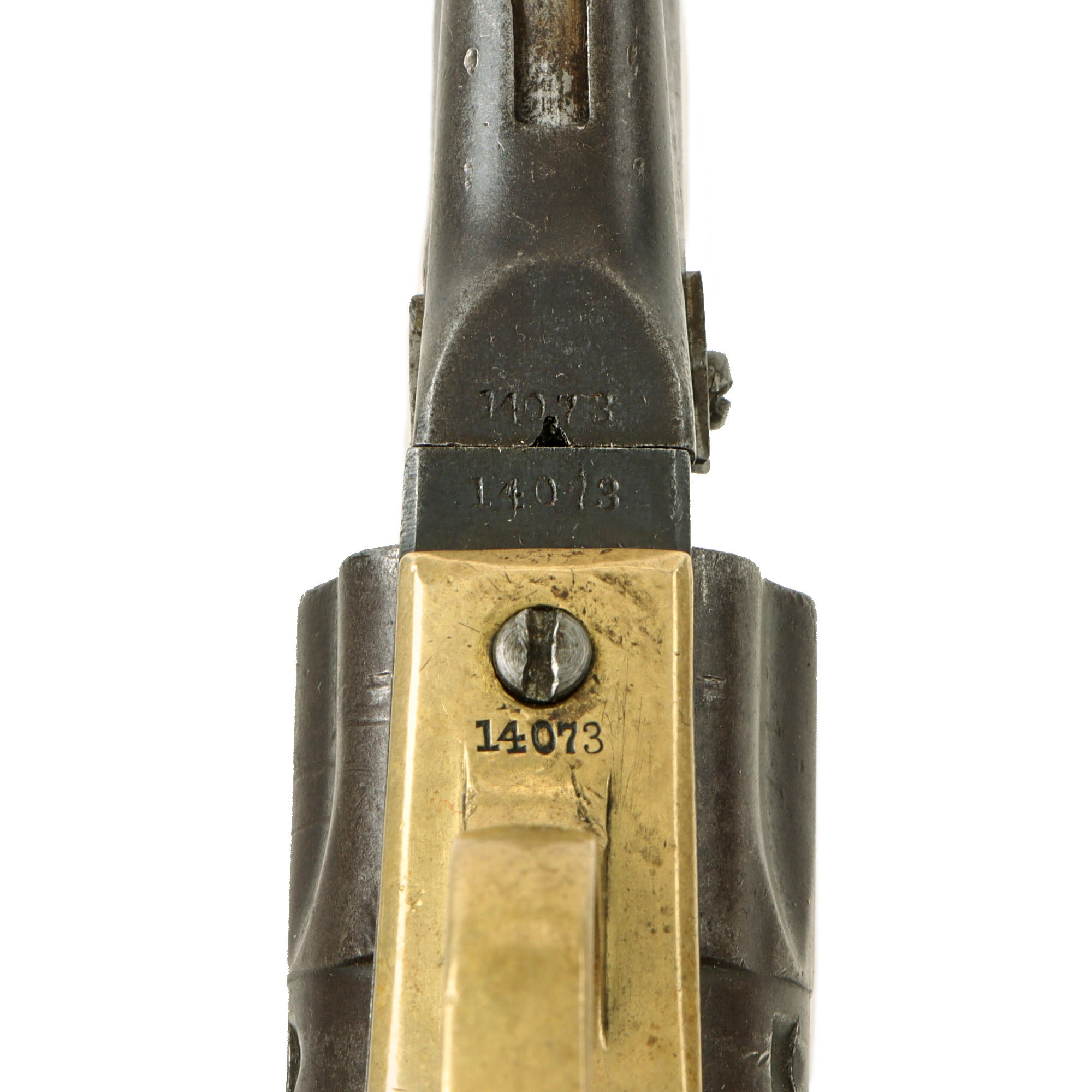 Even with the longer shorter 6 ½" barrel, this lovely example would have been perfect in that role, and is offered in very good used condition. The revolver has matching serial number 14073 on most parts, including the barrel, frame, and trigger guard. The cylinder arbor pin has been repaired, which removed the serial number, and the barrel wedge is a fabricated replacement. The rear of the cylinder is worn from hammer strikes and fouling, so we are not able to make out any markings on the back. We can see 14??3 on the grip frame, which looks to have been inlet with a dovetail to attach some kind of hand grip or stock to. The serial number indicates production in 1862, according to Colt firearms records, during the height of the Civil War, and most likely was used during the conflict.