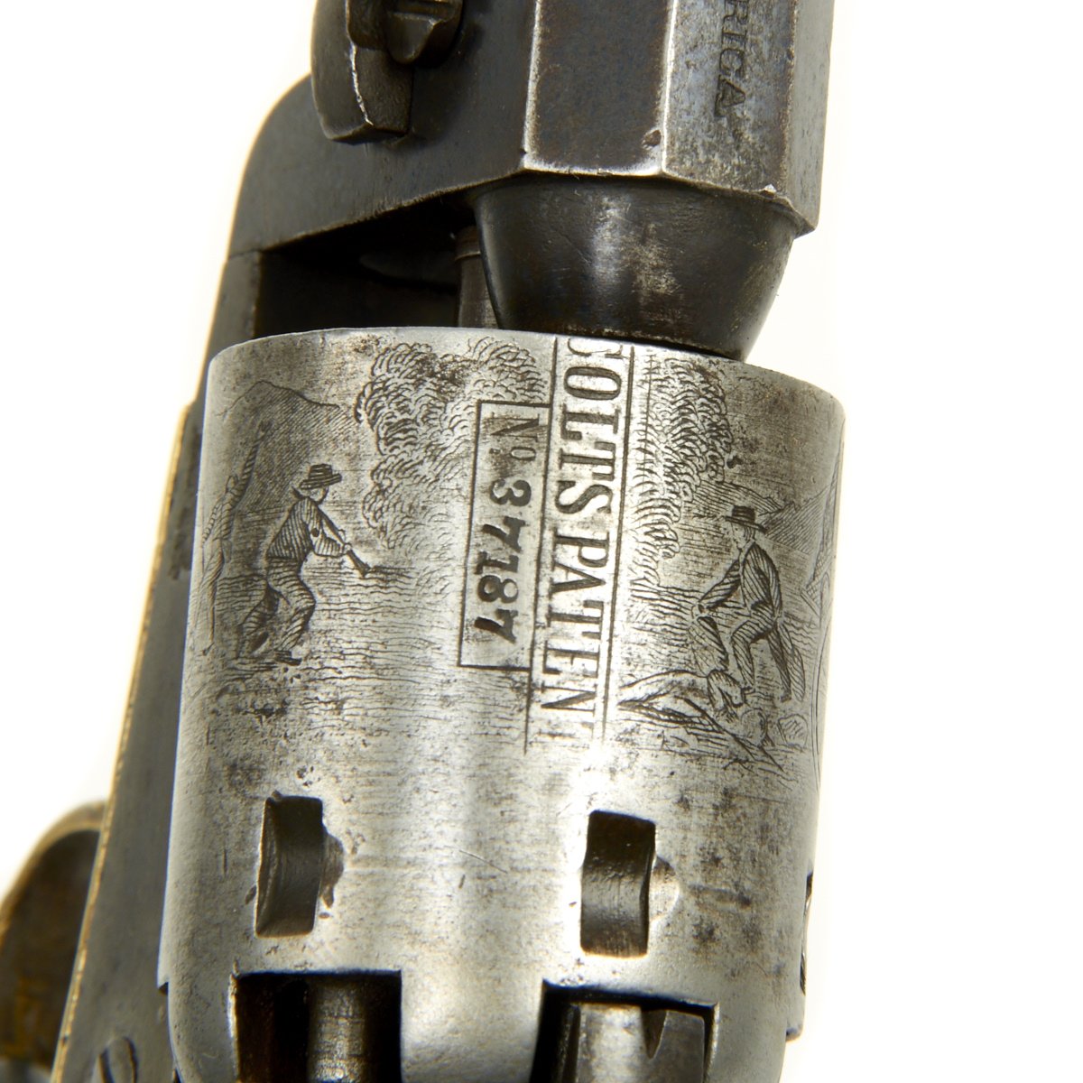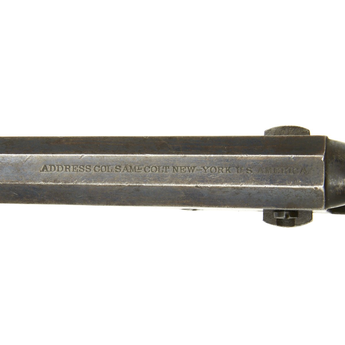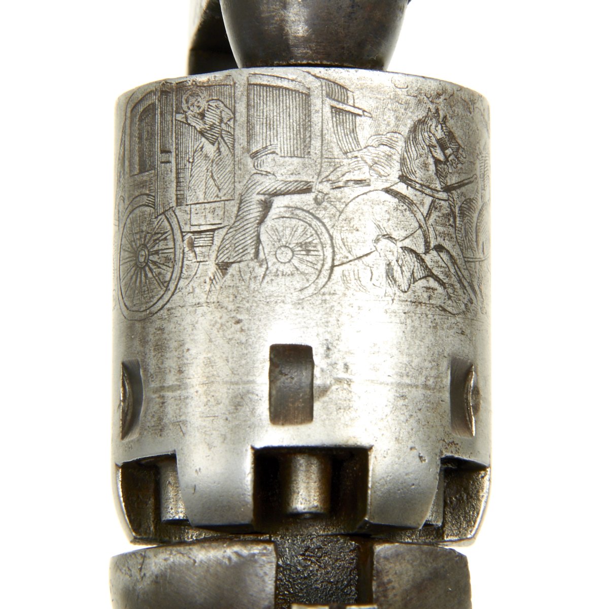 Most importantly, the original "Stagecoach Robbery" cylinder engraving can still be seen, and is almost completely intact! The COLT'S PATENT marking is intact as well, and the engraving throughout the cylinder is crisp. Appears to be in perfect functioning condition and is nicely marked in a line across the top of the octagonal barrel-