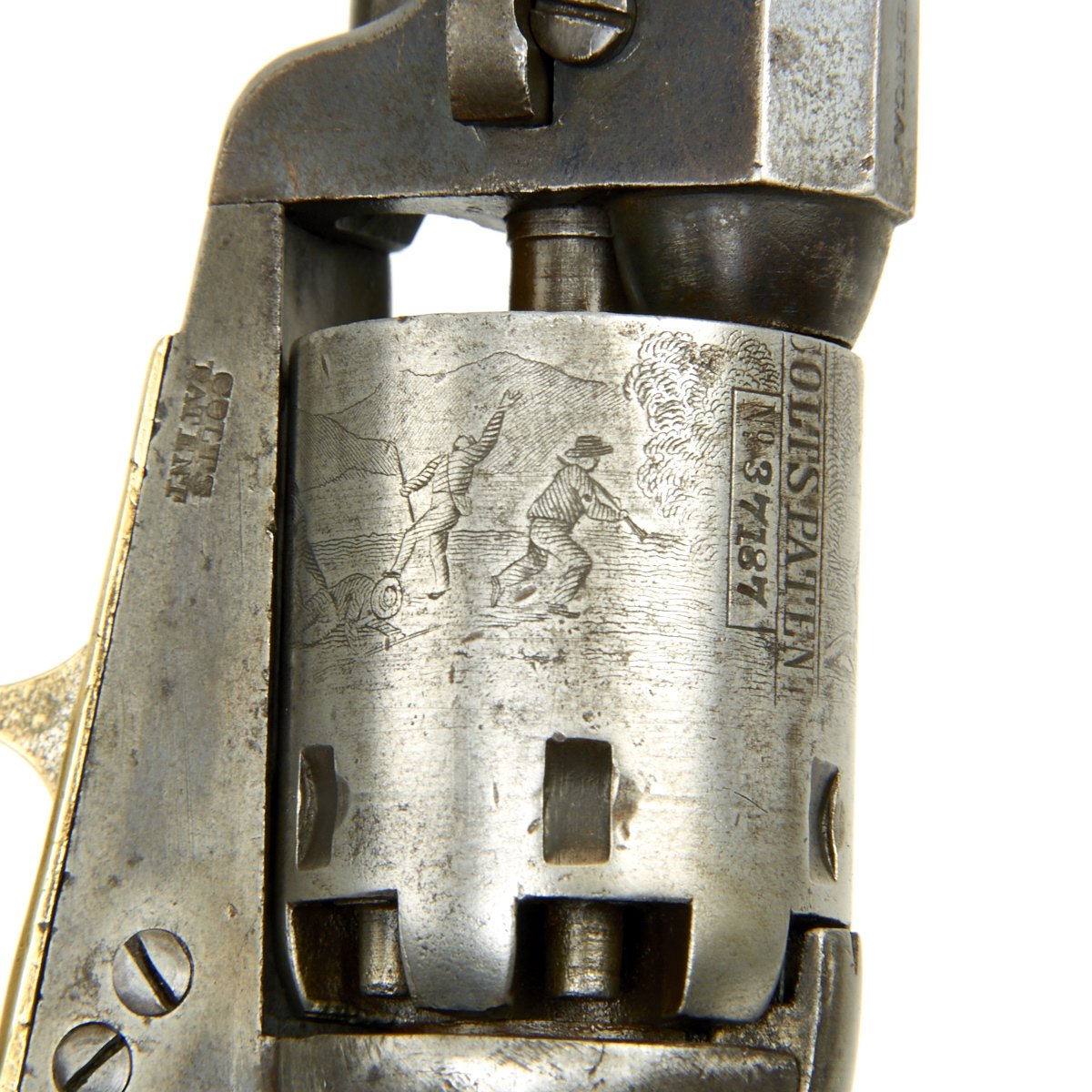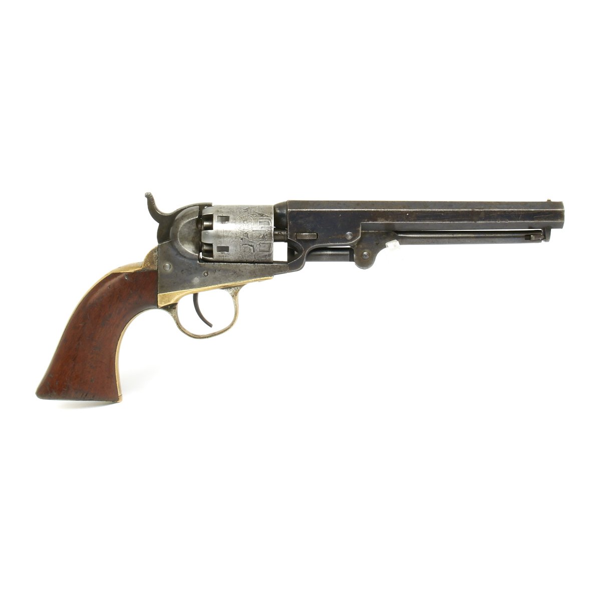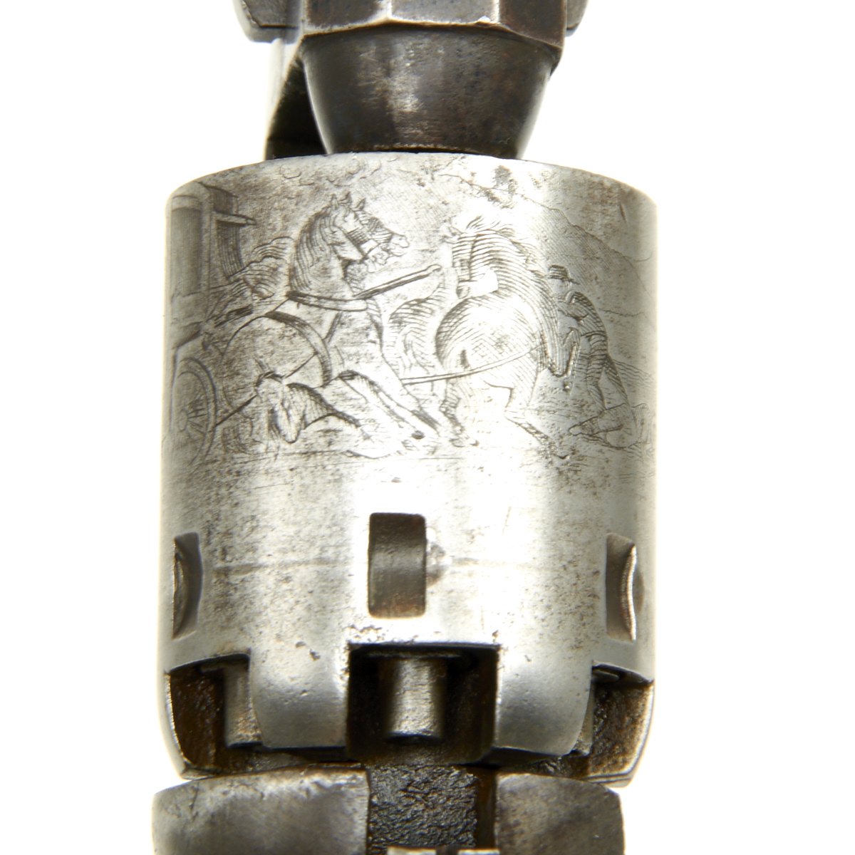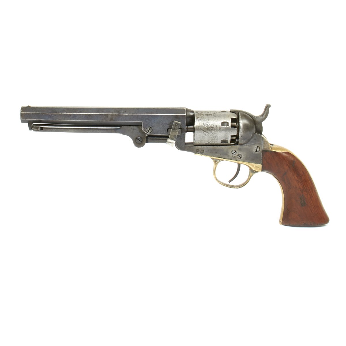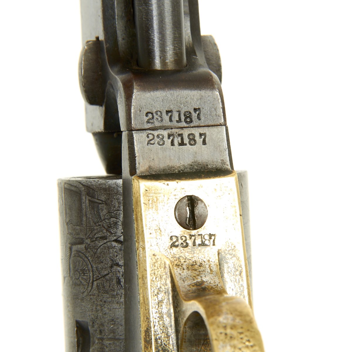 Six shot percussion, .31 caliber with a special order 6" barrel, with all serial numbers matching. In nice tight condition with an excellent finish throughout. A lot of the original case hardening can still be seen. Brass trigger guard and grip frame is marked is marked .31cal, and there are even traces of the original nickel plating on parts.