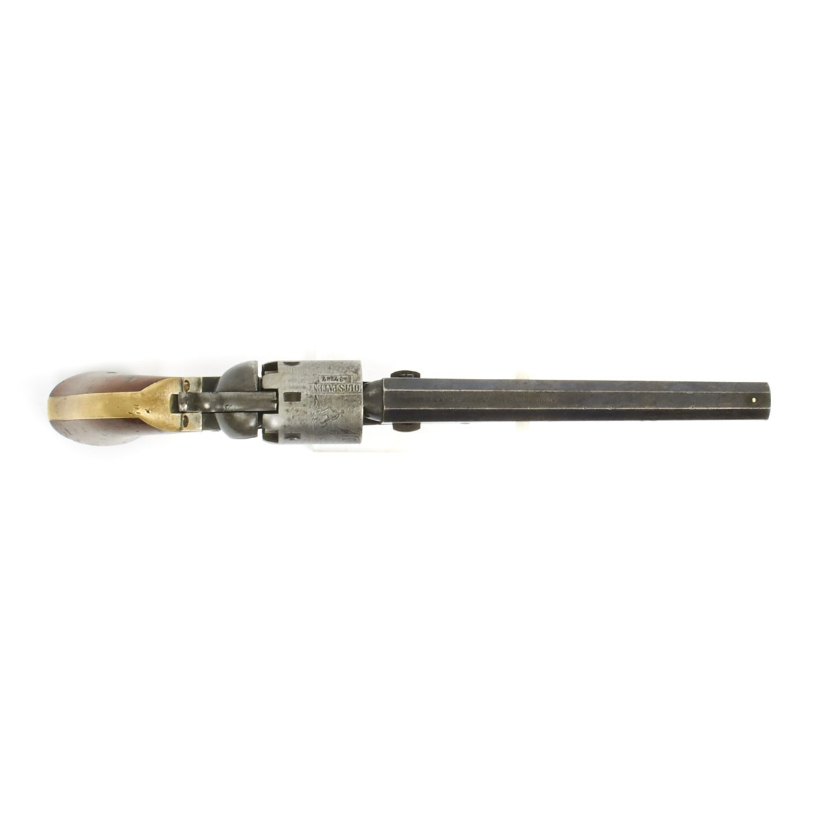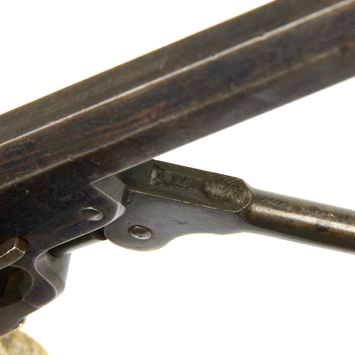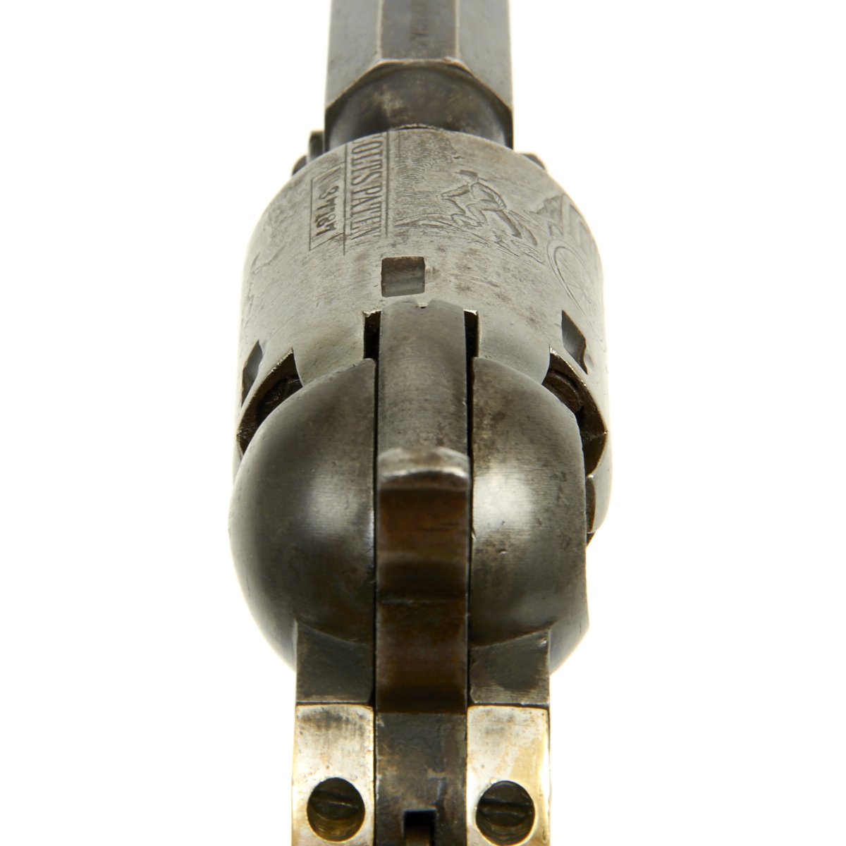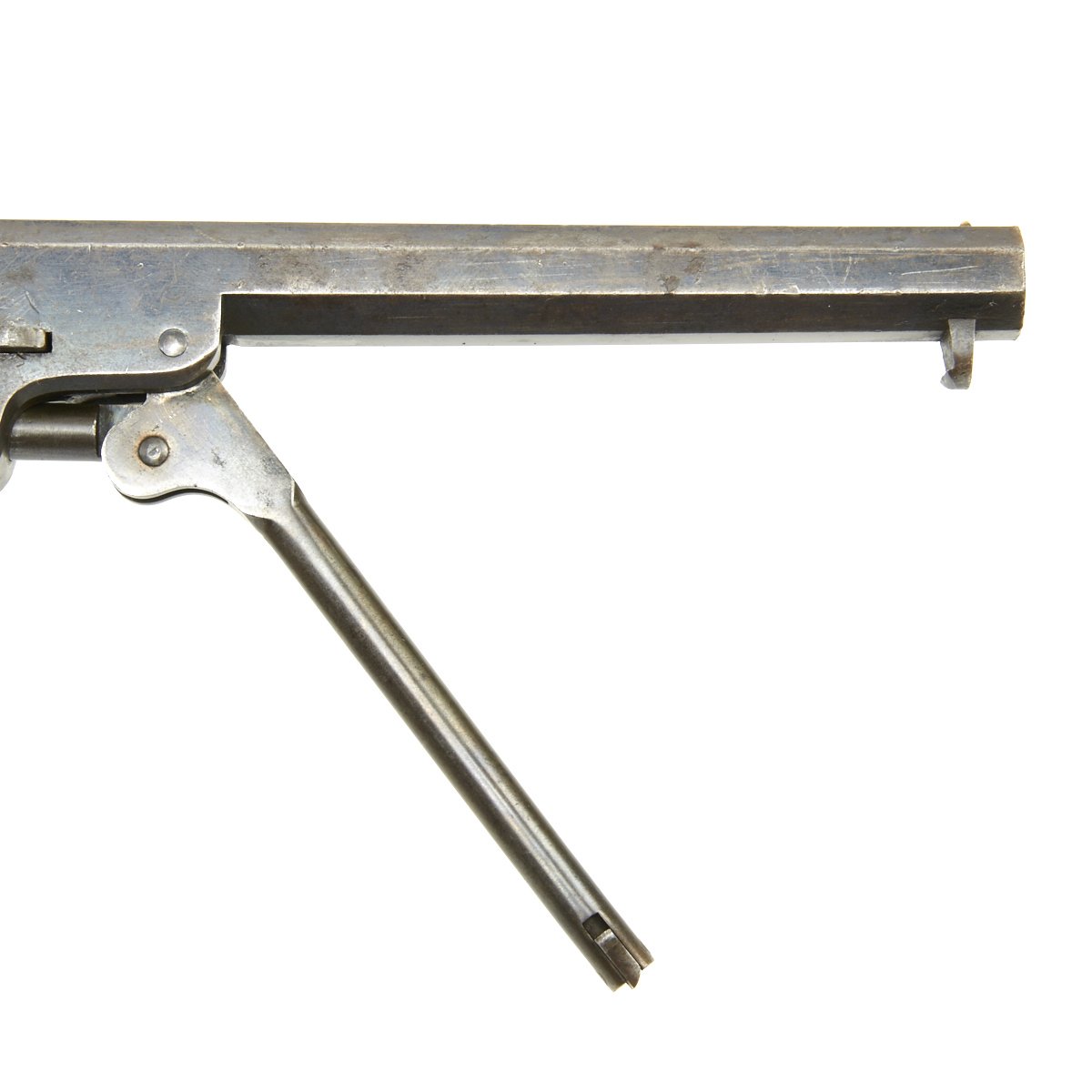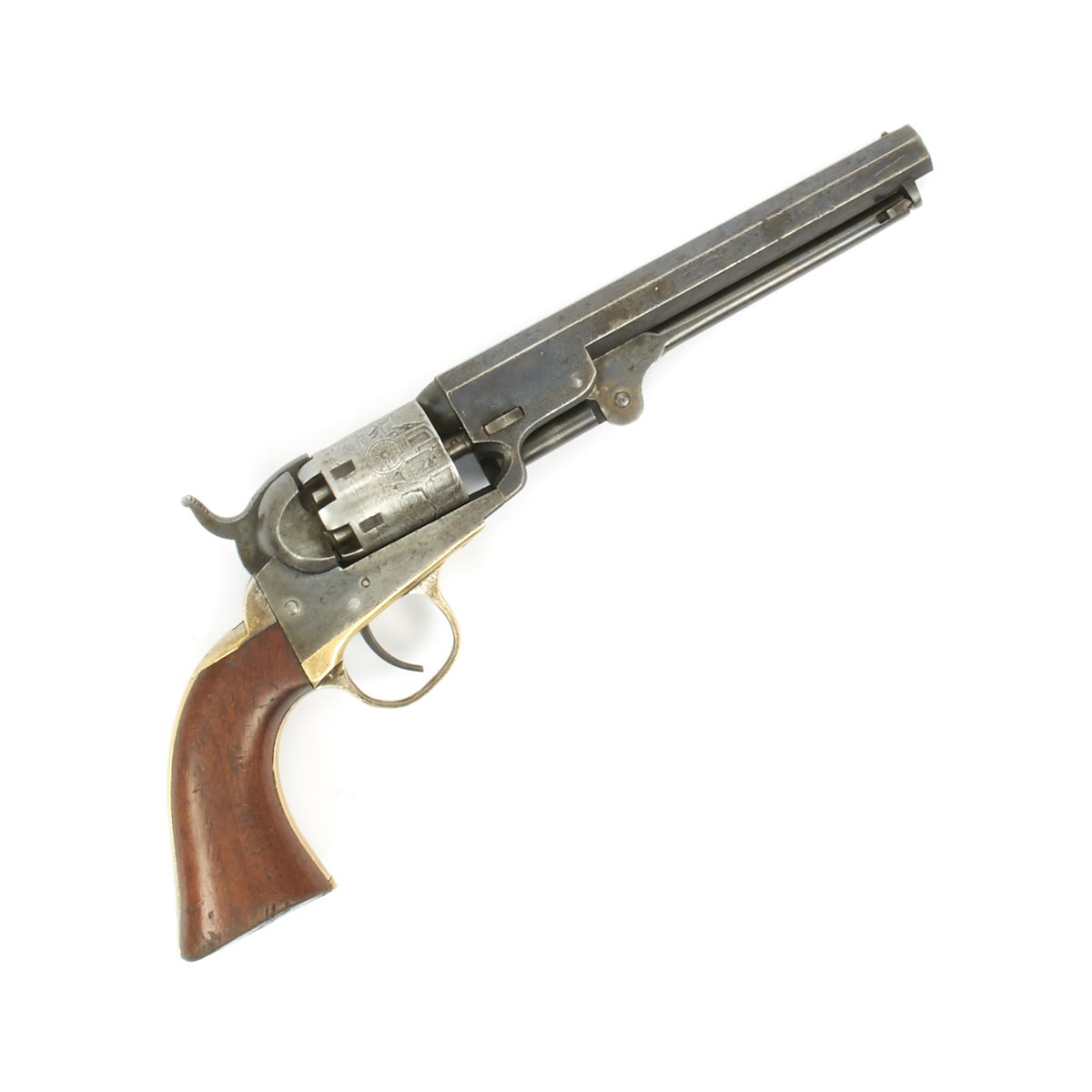Six shot percussion, .31 caliber with a special order 6" barrel, with all serial numbers matching. In nice tight condition with an excellent finish throughout. A lot of the original case hardening can still be seen. Brass trigger guard and grip frame is marked is marked .31cal, and there are even traces of the original nickel plating on parts.