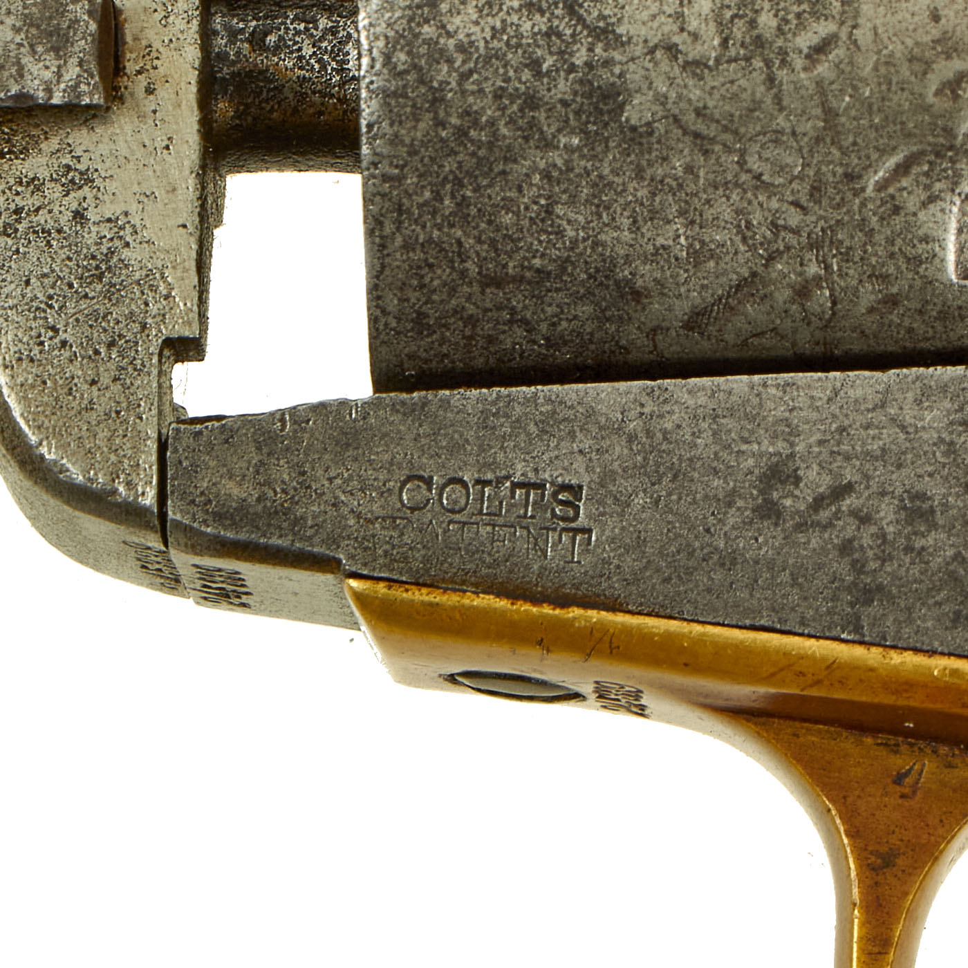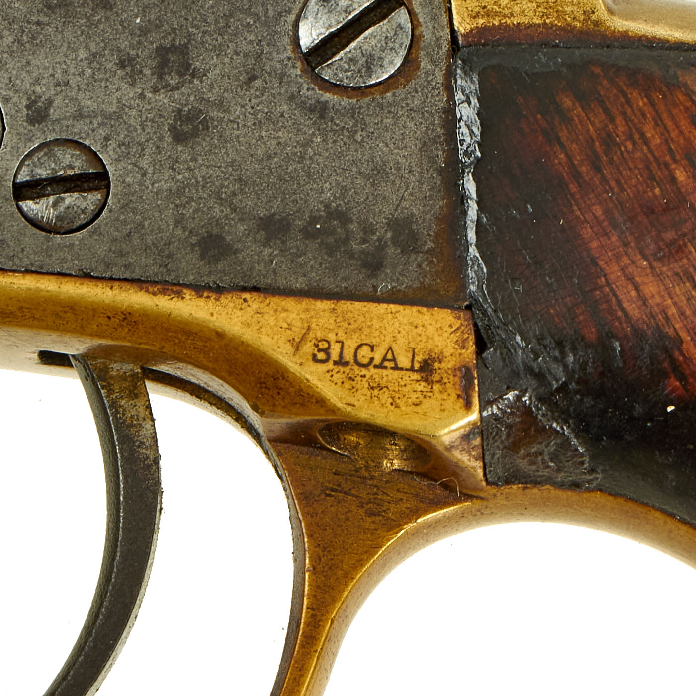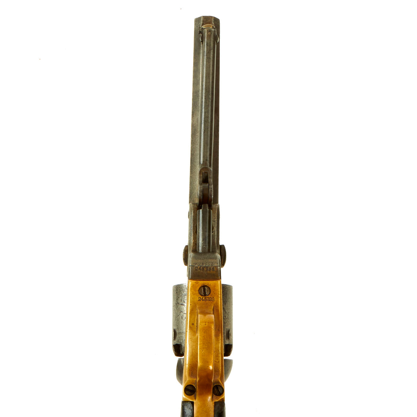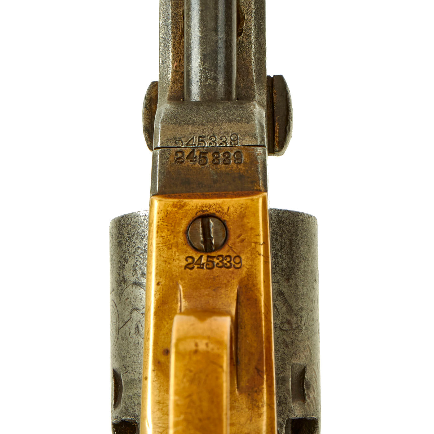 Original Item: Only One Available. The Colt "Pocket Percussion" Model 1849 revolvers in .31cal are essentially scaled down versions of the larger Navy Model 1851 in .36cal, and were developed concurrently. The serial Number 245339 can be found on the barrel, frame, trigger guard, and grip frame. The cylinder and barrel wedge are marked with 45339, while the cylinder arbor pin is marked with 533[9]. This makes this a very desirable "ALL MATCHING" example of the M1849 Pocket revolver, without any parts swapped out over the years.