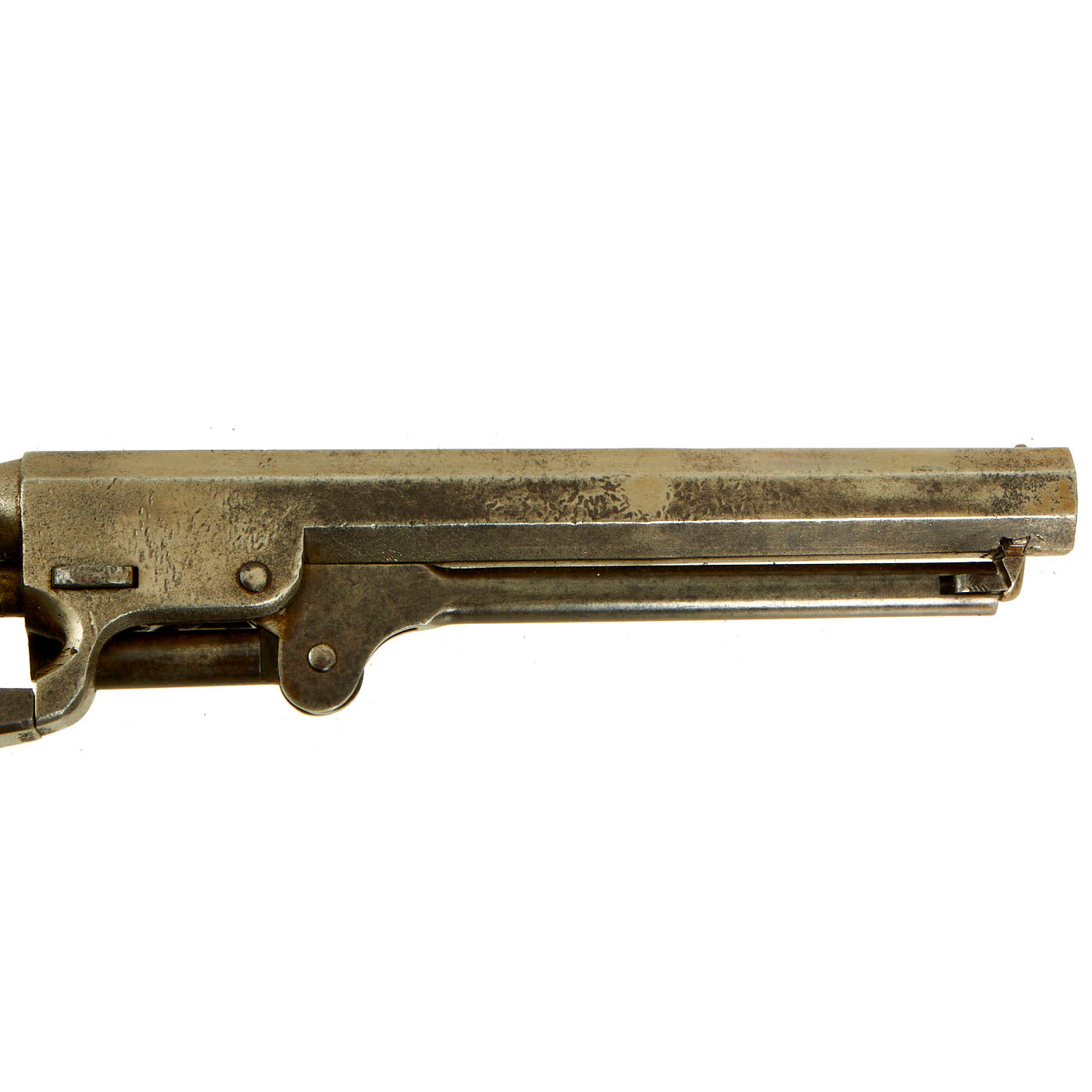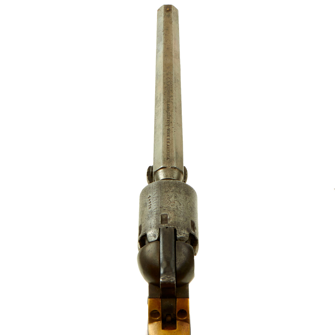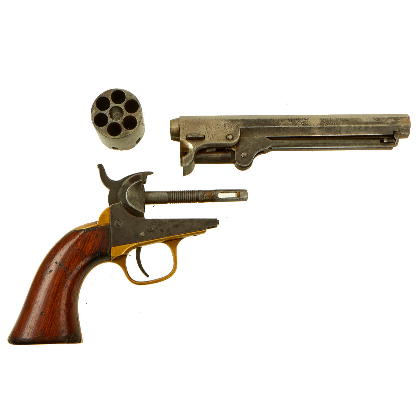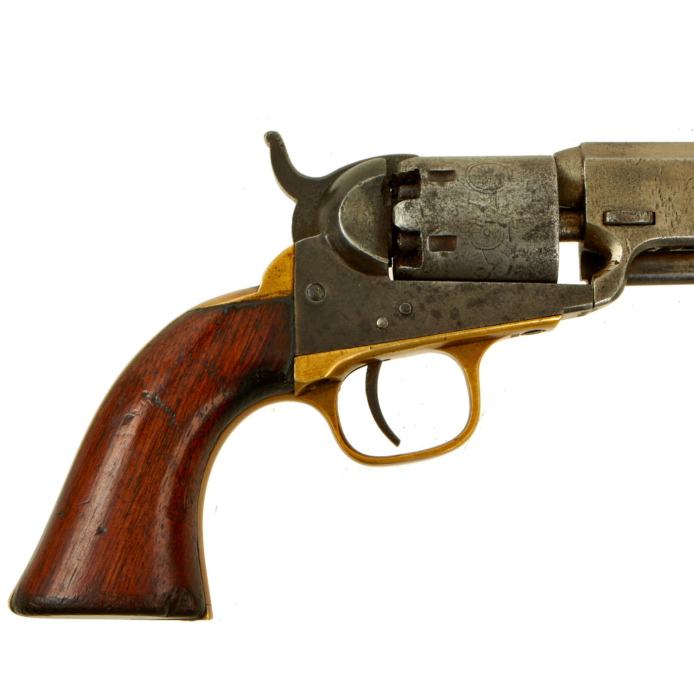 Original Item: Only One Available. The Colt "Pocket Percussion" Model 1849 revolvers in .31cal are essentially scaled down versions of the larger Navy Model 1851 in .36cal, and were developed concurrently. The serial Number 245339 can be found on the barrel, frame, trigger guard, and grip frame. The cylinder and barrel wedge are marked with 45339, while the cylinder arbor pin is marked with 533[9]. This makes this a very desirable "ALL MATCHING" example of the M1849 Pocket revolver, without any parts swapped out over the years.
