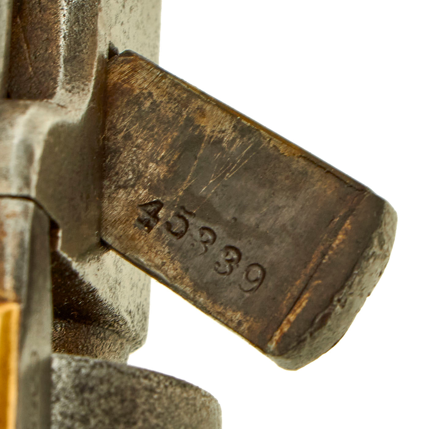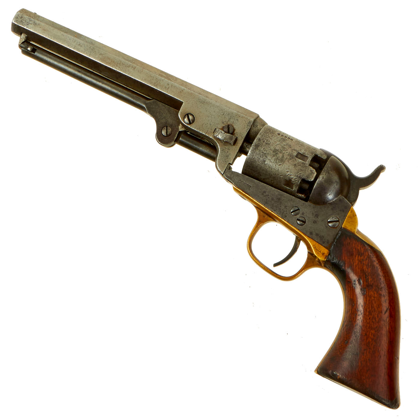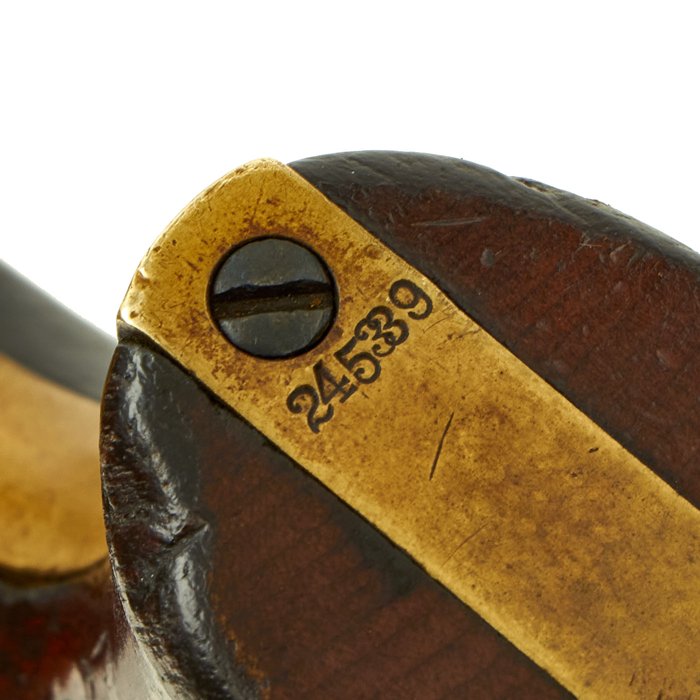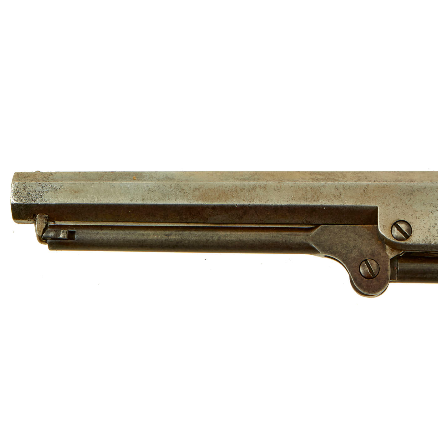 Original Item: Only One Available. The Colt "Pocket Percussion" Model 1849 revolvers in .31cal are essentially scaled down versions of the larger Navy Model 1851 in .36cal, and were developed concurrently. The serial Number 245339 can be found on the barrel, frame, trigger guard, and grip frame. The cylinder and barrel wedge are marked with 45339, while the cylinder arbor pin is marked with 533[9]. This makes this a very desirable "ALL MATCHING" example of the M1849 Pocket revolver, without any parts swapped out over the years.