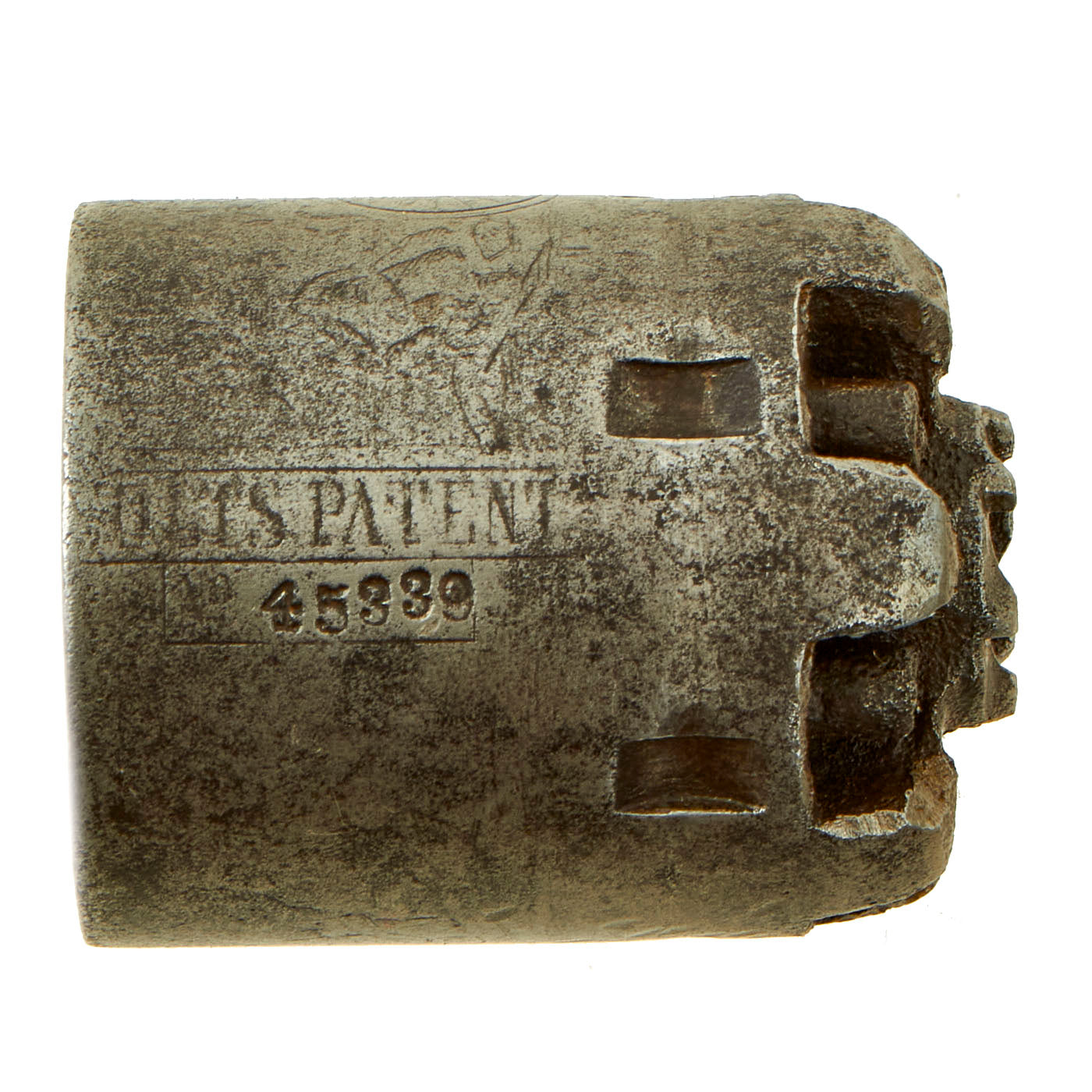 The revolver functions well, with solid indexing and a firm cylinder lockup. We did not notice any of the usual finicky behavior we often see with revolvers of this age. There is just a bit of play in the barrel/frame connection, and it does look like the barrel / frame connection may have been adjusted at one point to keep the fit tight. The bore is in very good condition for a percussion revolver, with clear lands and grooves and a partly bright finish. There is oxidation and wear on the interior, and also a light ring about half day down the bore. The brass front sight is still present and in very good condition. All 6 cap nipple cones are intact and clear, though they do show some oxidation and powder burn to the exterior.