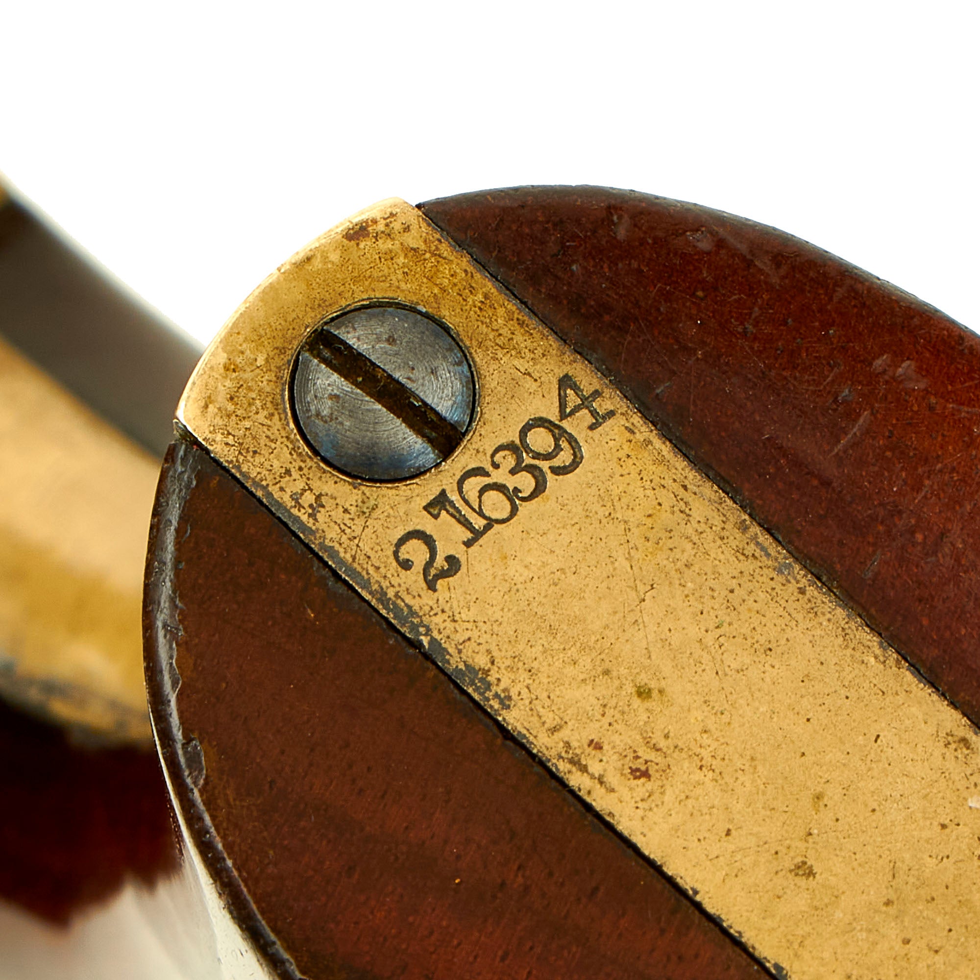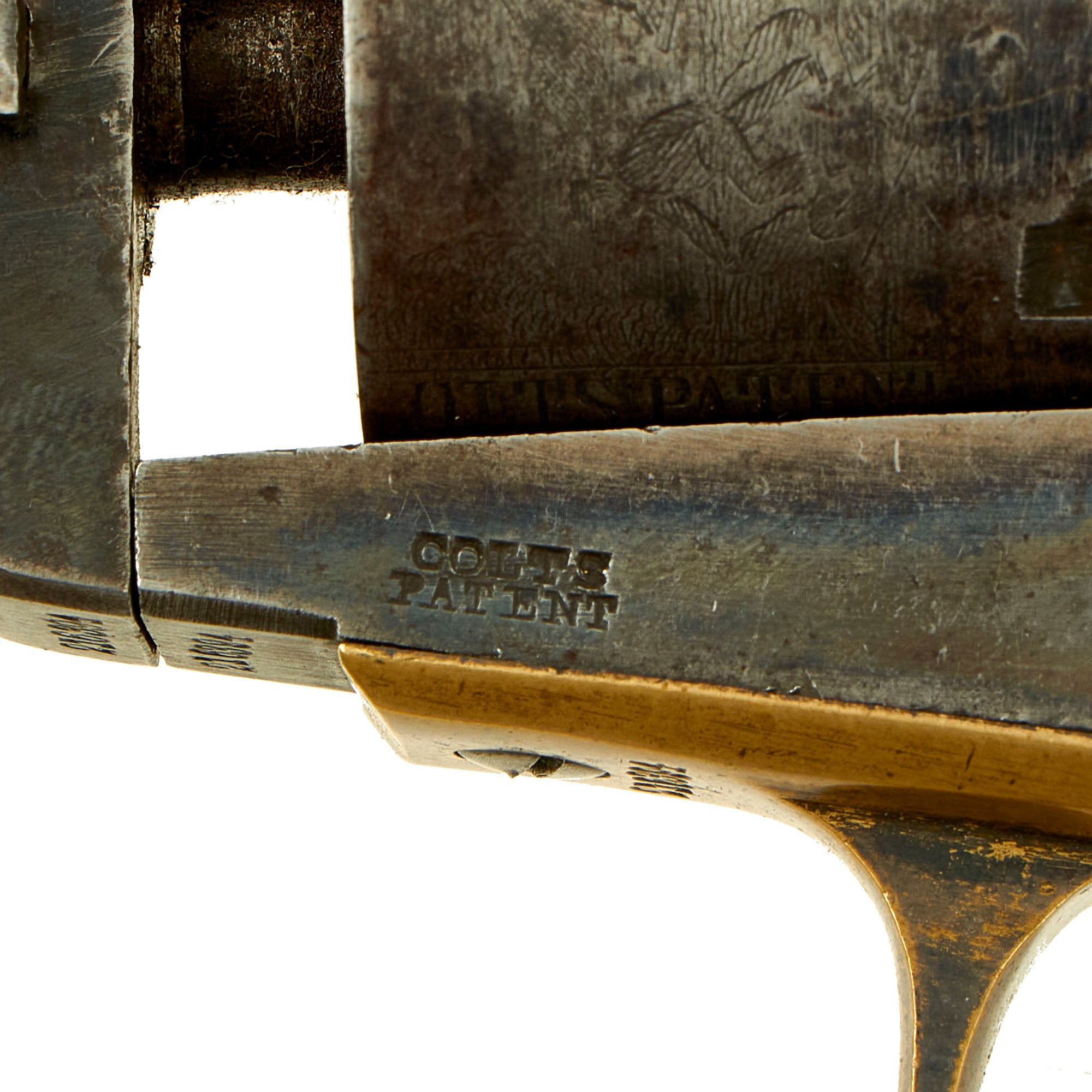 It also has the correct COLTS PATENT on the left frame under the cylinder, though there is no "31CAL" marking on the trigger guard, which is not uncommon. The walnut grips are in excellent condition, with a lovely color and very little damage or wear. They still have about 95% of the original "Piano Varnish" finish that was applied to these at the factory, with just some light wear on the bottom corners where usually seen. There is still a bit of the original plating on the brass grip frame and trigger guard, with the rest faded to a lovely mustard patina.