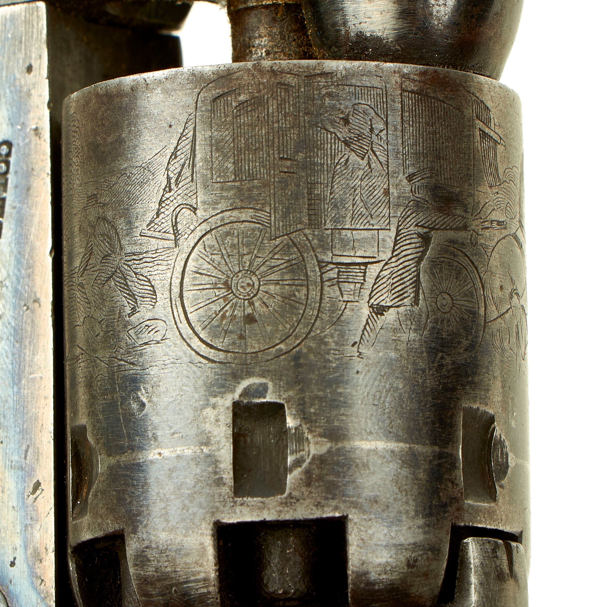 The serial number indicates indicates the year of manufacture as 1862, during the middle of the U.S. Civil War, so it almost certainly saw service during the conflict. As this revolver has a serial number over 187000, it has a six round .31 caliber cylinder, instead of the previous five. It also features a 4" barrel, and is in nice tight condition with a great finish on the steel, including much bluing on the barrel and original case hardening on the frame. Additionally, over 90% of the original "Stagecoach Robbery" cylinder engraving can still be seen, which is usually completely worn away. The COLT'S PATENT marking is mostly intact as well. Often we see these with the markings completely removed from the cylinder, so this is a real treat!