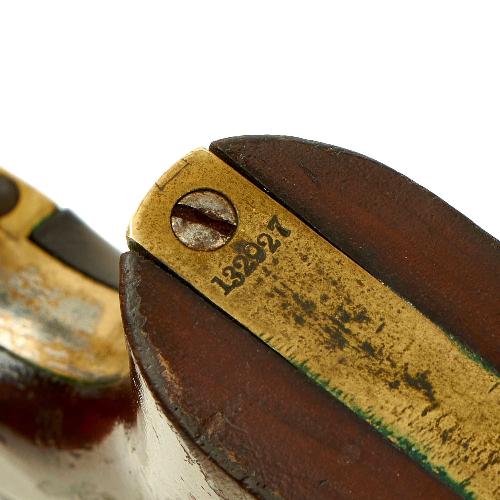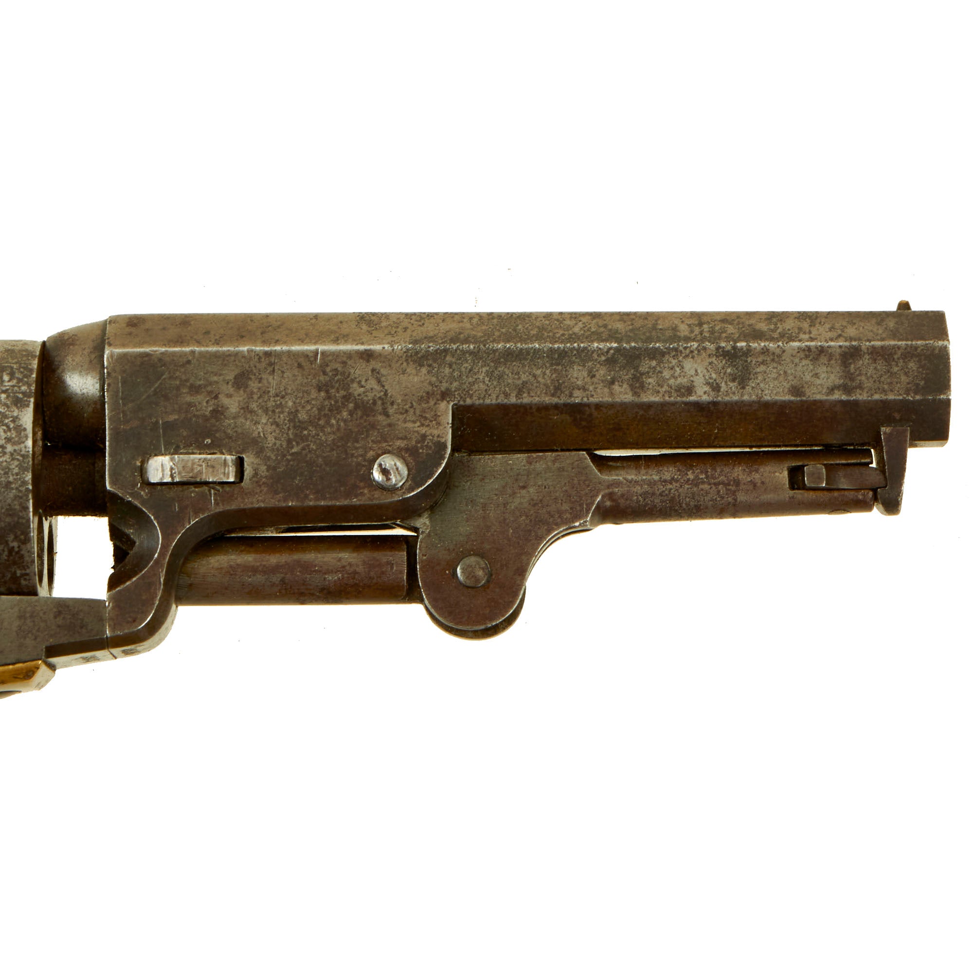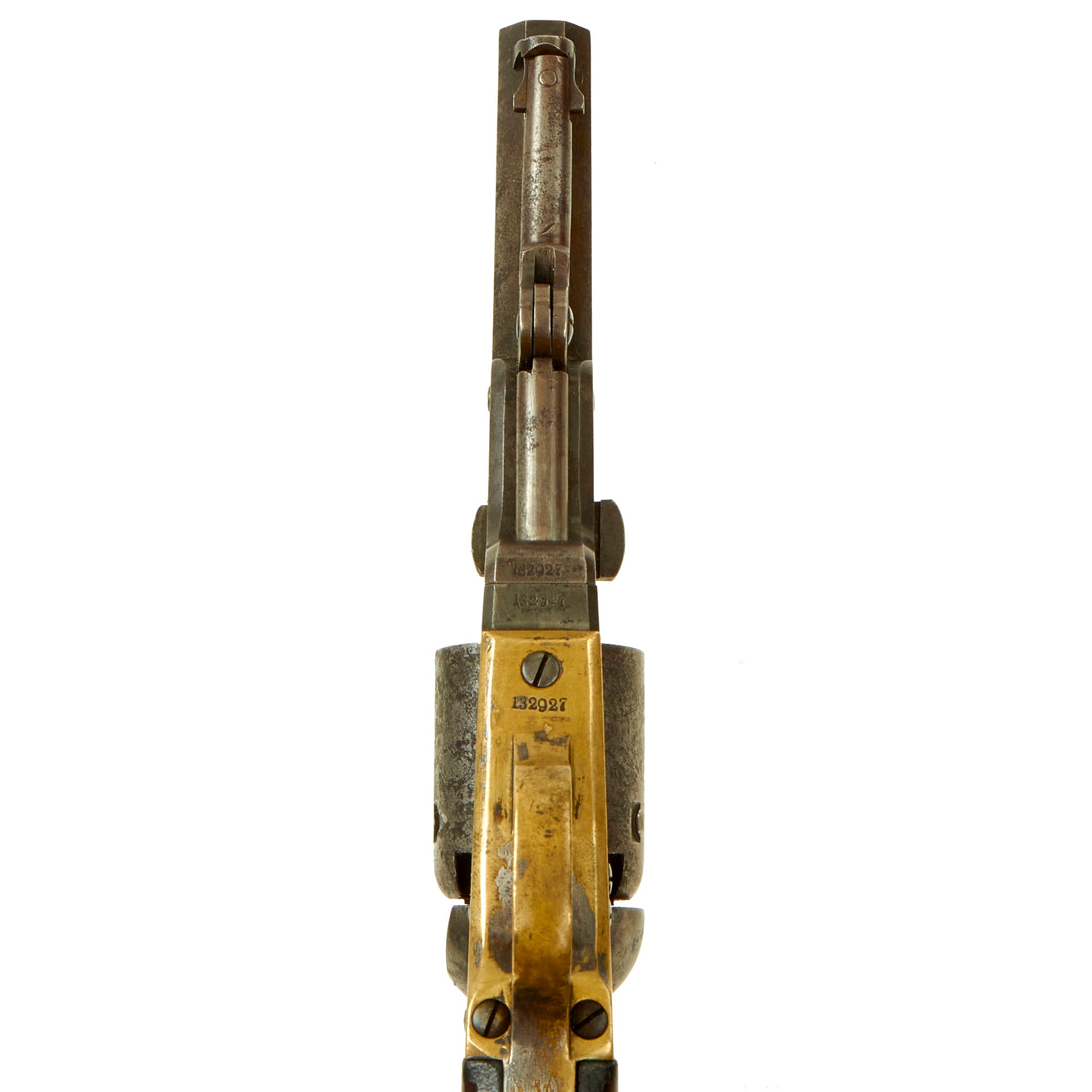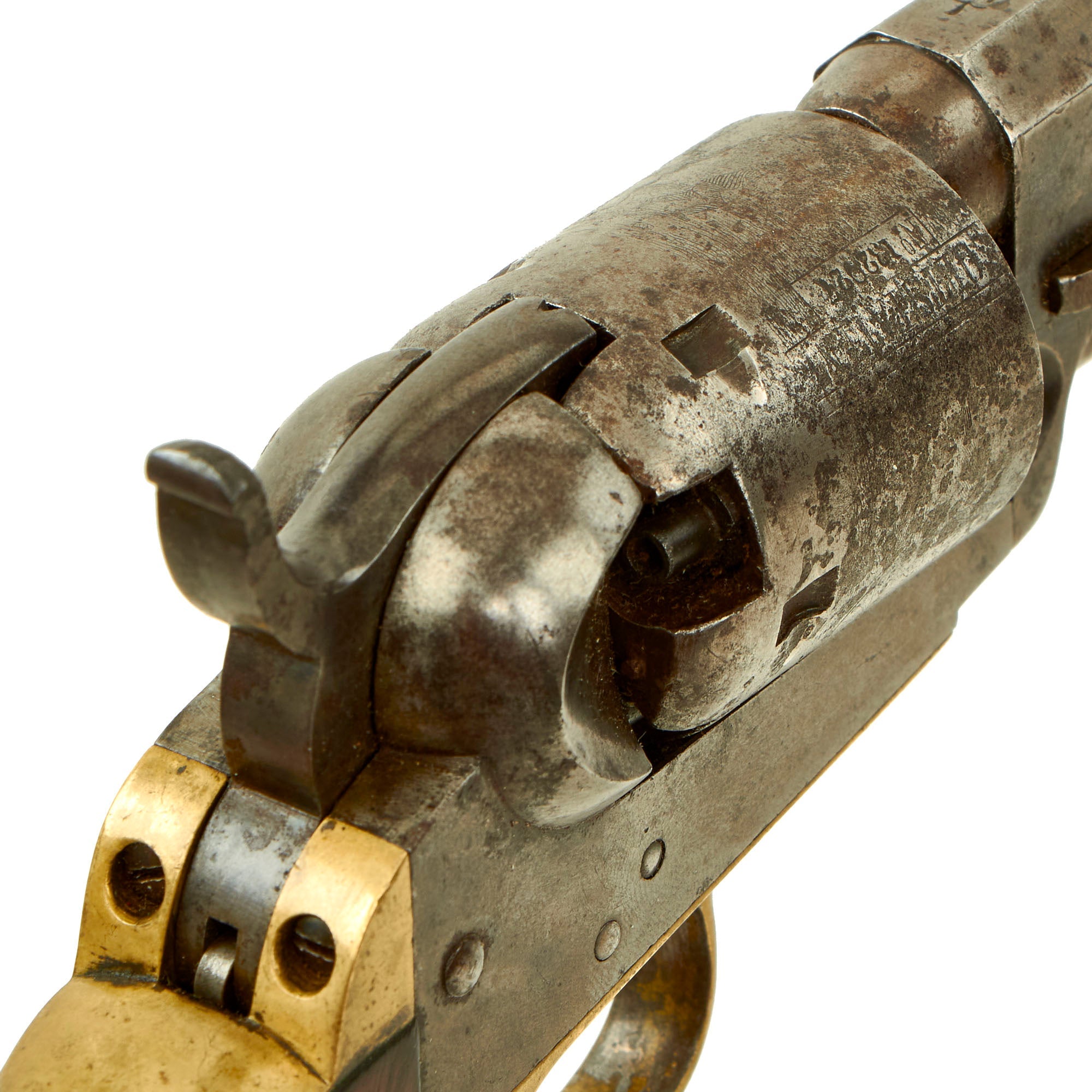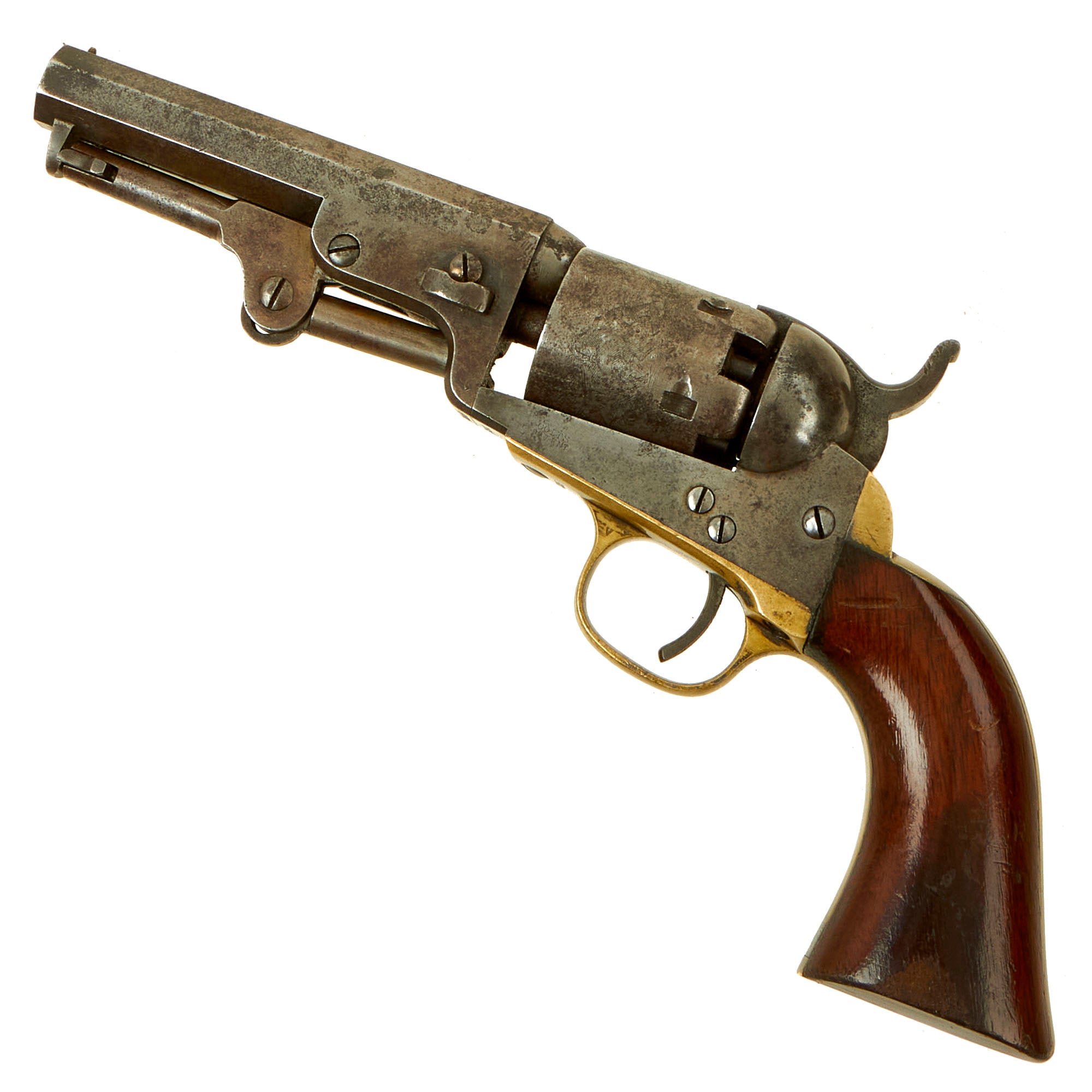 The serial number indicates indicates the year of manufacture as 1857, about 4 years before the start of the U.S. Civil War, so there is a very good chance it saw service during the conflict. Five shot percussion, .31 caliber with a 4" barrel, in nice tight condition with nice aged peppered finish on the steel. It looks like the revolver was stored improperly, allowing some rust to form, which was then cleaned away. There also is still some of the original nickel plating present on the brass grip frame and trigger guard, which is a real rarity.