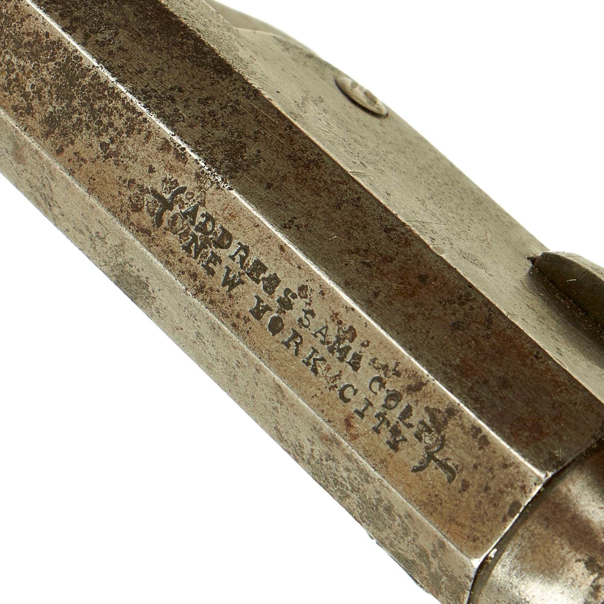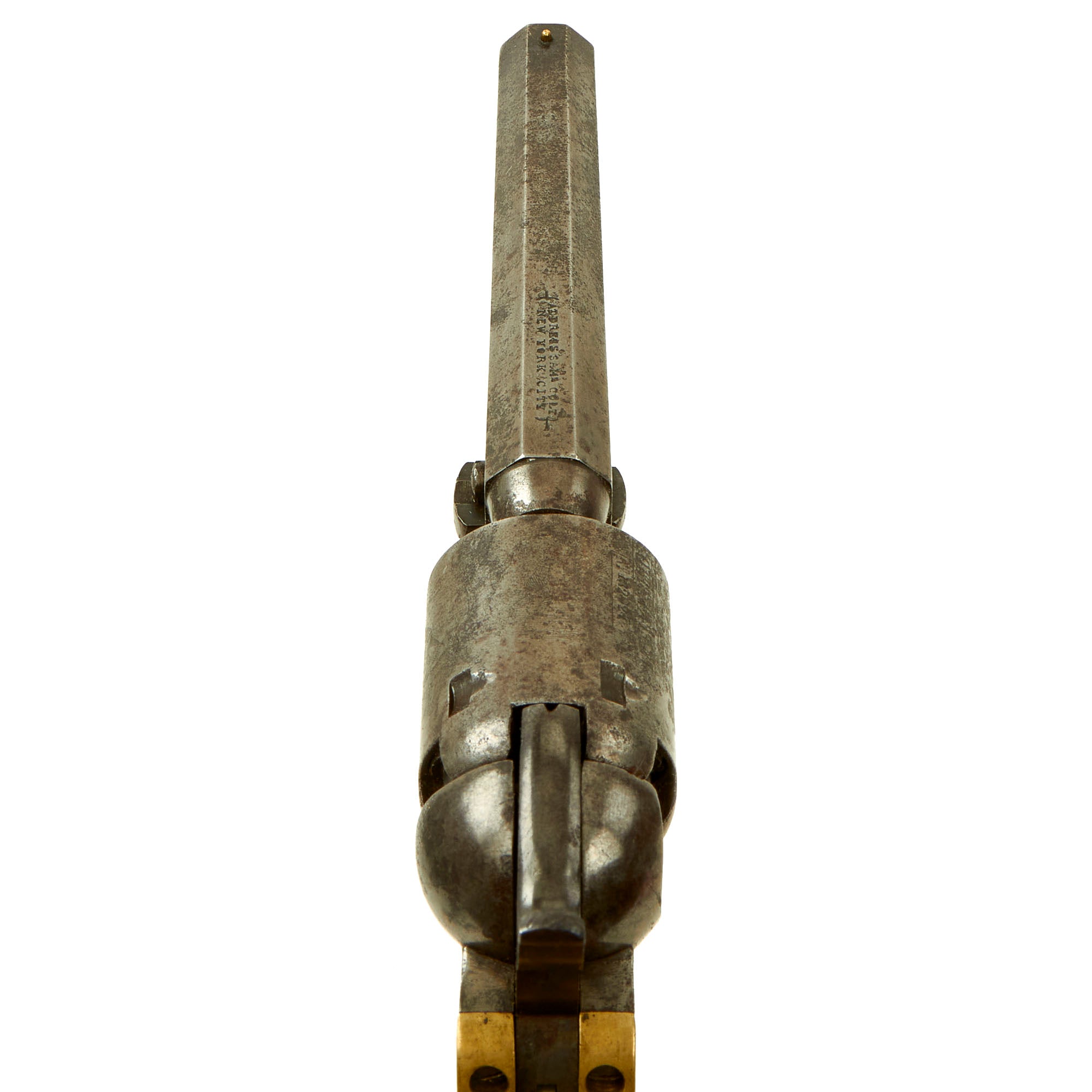 The Colt early two line address is marked in two lines across the top of the octagonal barrel:-