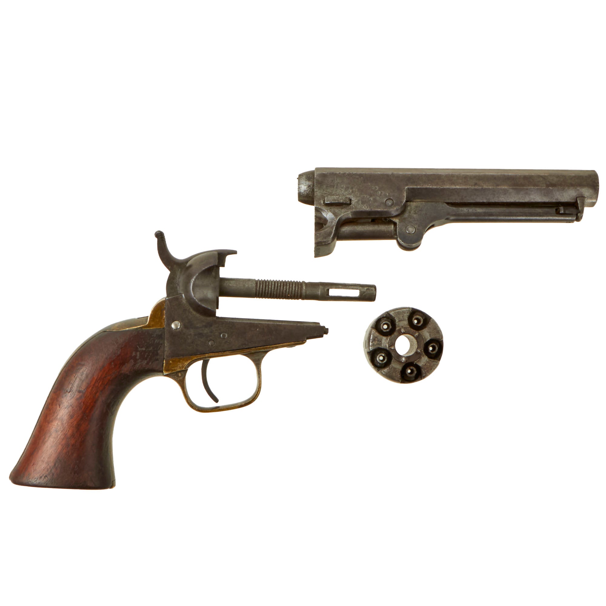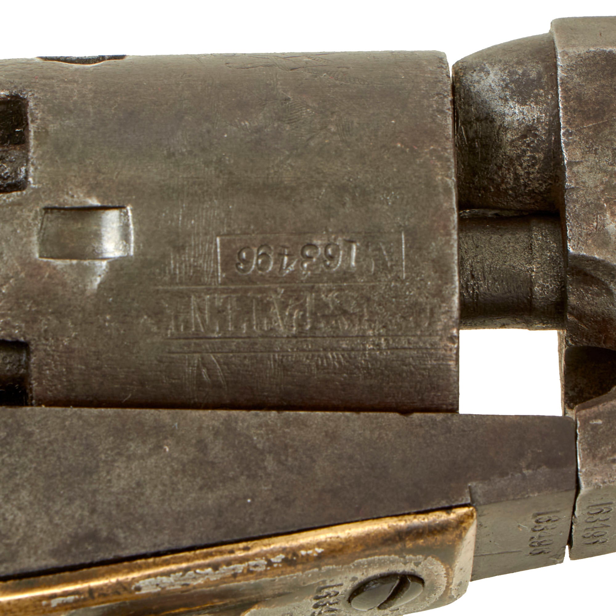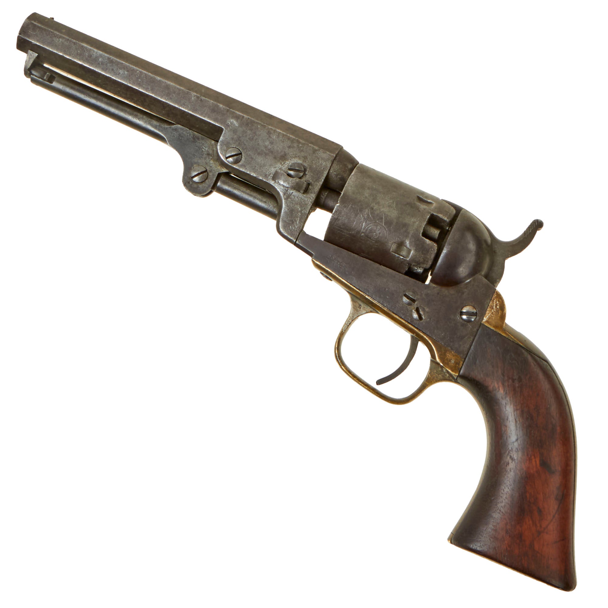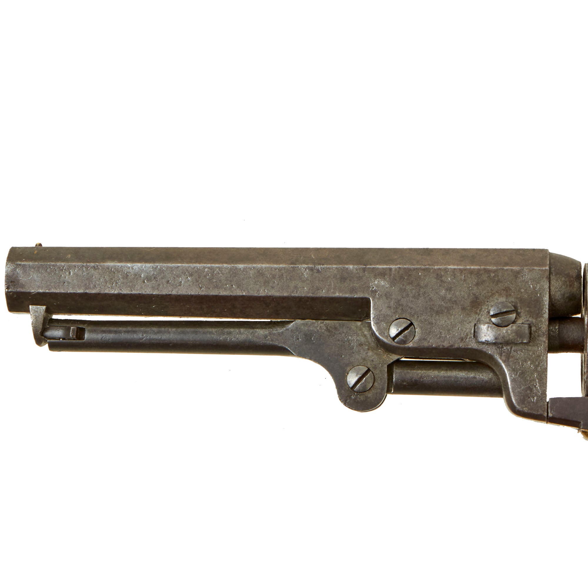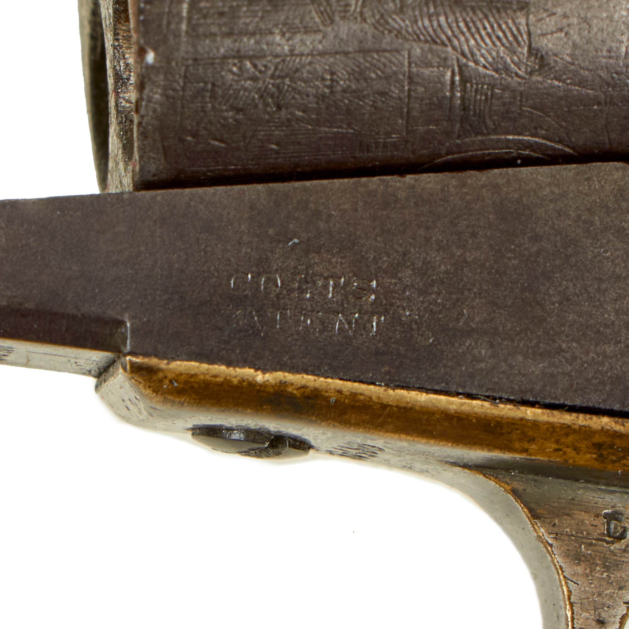 The serial number indicates indicates the year of manufacture as 1860, only a year before the start of the U.S. Civil War, so it almost certainly saw service during the conflict, possibly on either side. Five shot percussion, .31 caliber with a 5" barrel, and is in nice tight condition with a very nice peppery patina on the steel portions. The grip frame and trigger guard show a lovely "mustard" patina, with some areas retaining the original nickel plating. Additionally, about 60% of the original "Stagecoach Robbery" cylinder, which is usually completely worn away. It also still shows the COLT'S PATENT / No. marking next to the serial number. Often we see these with the markings completely removed from the cylinder, so this is a real treat!