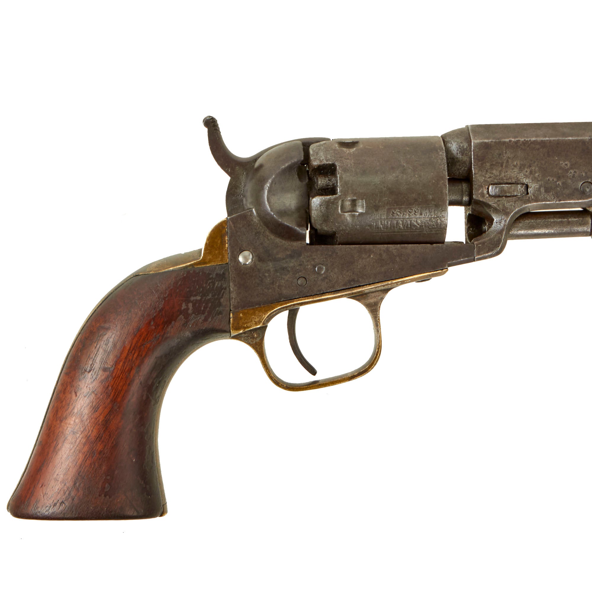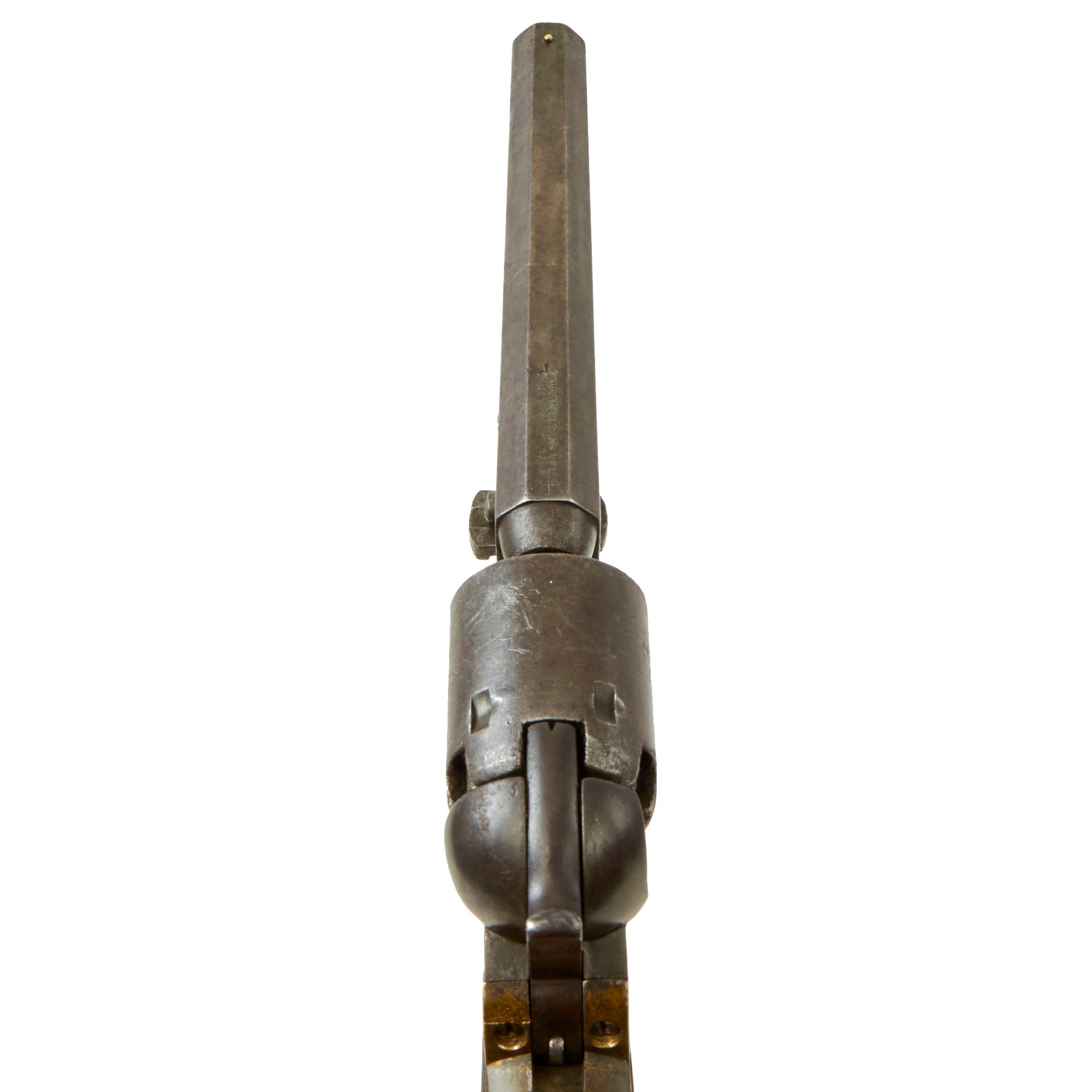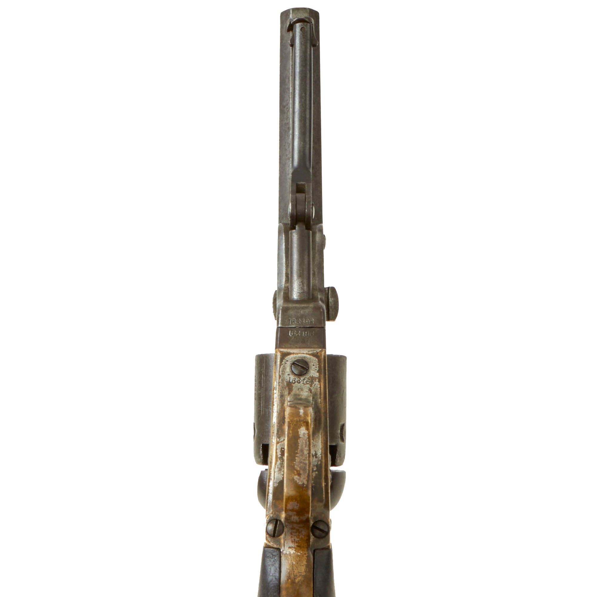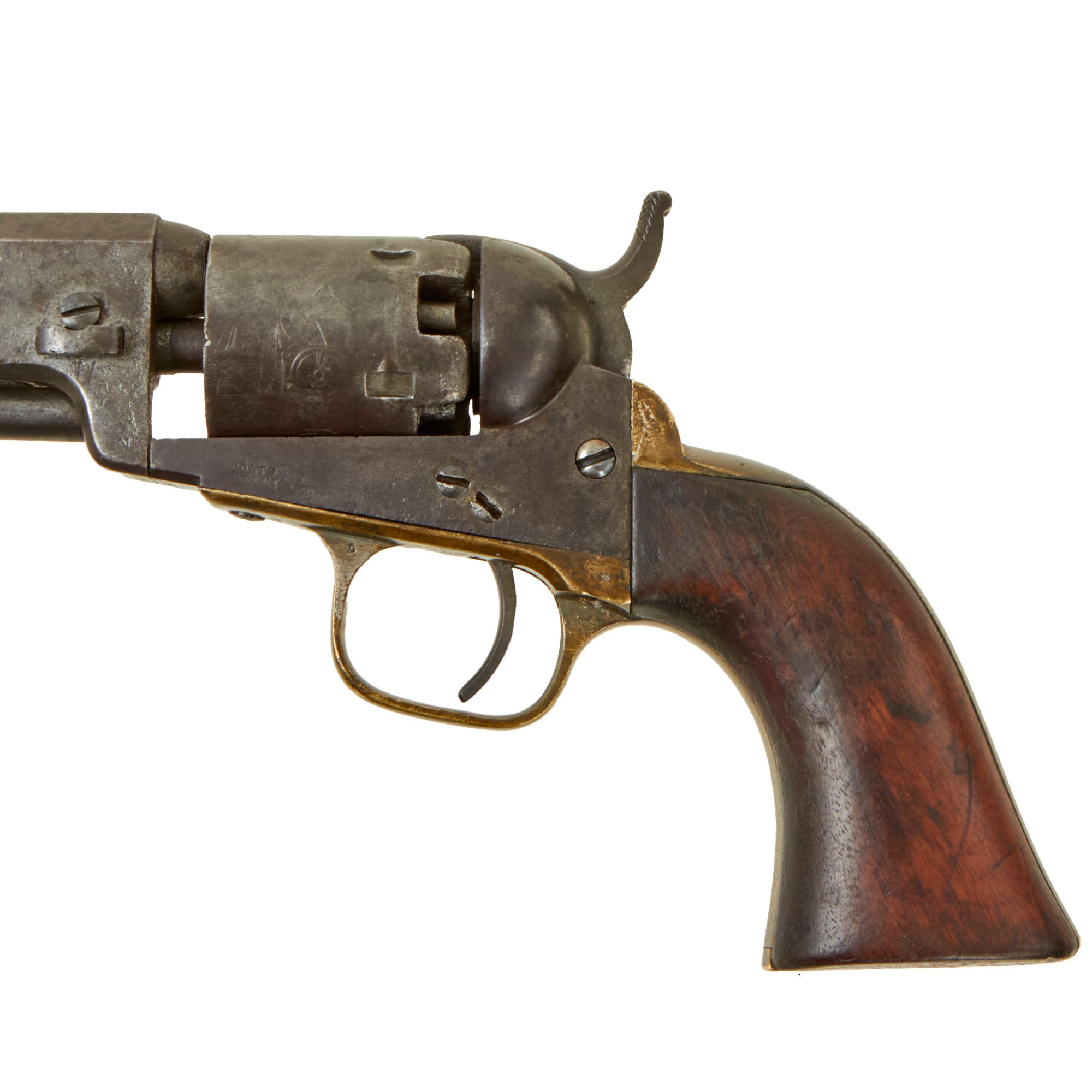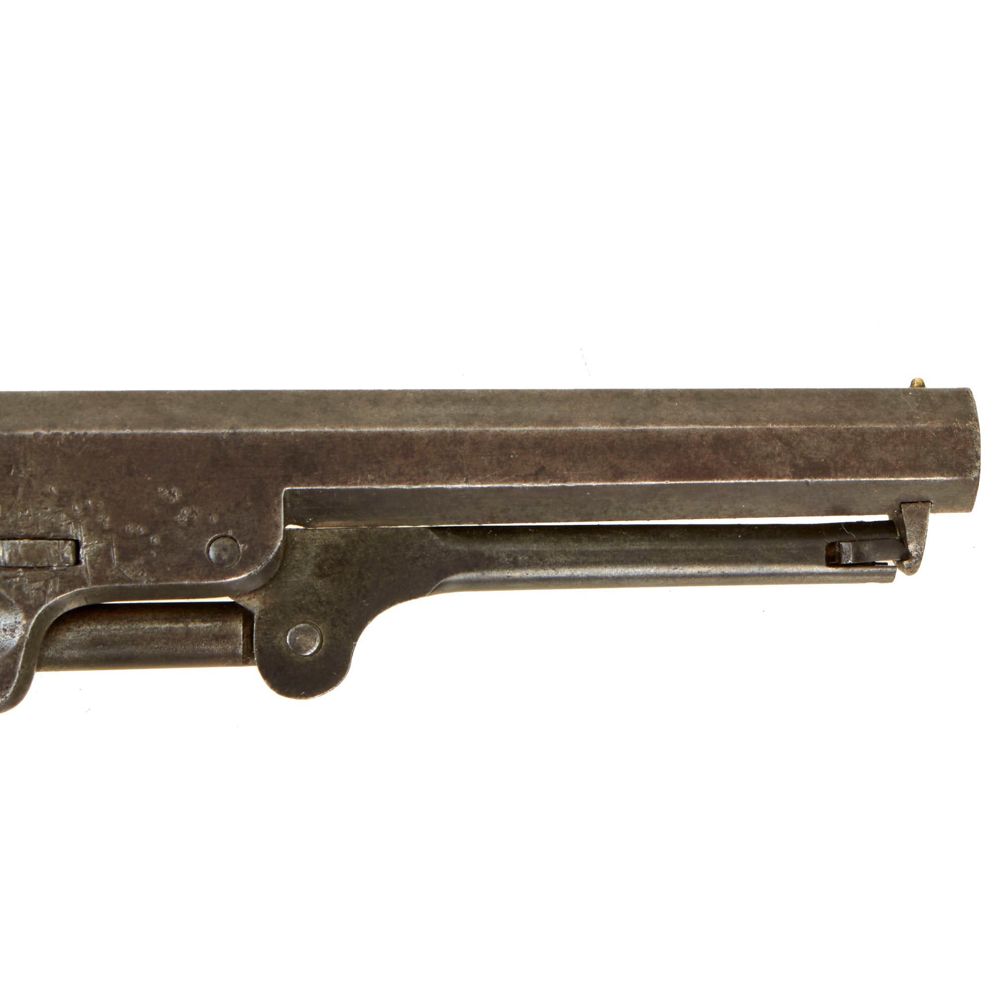 The serial number indicates indicates the year of manufacture as 1860, only a year before the start of the U.S. Civil War, so it almost certainly saw service during the conflict, possibly on either side. Five shot percussion, .31 caliber with a 5" barrel, and is in nice tight condition with a very nice peppery patina on the steel portions. The grip frame and trigger guard show a lovely "mustard" patina, with some areas retaining the original nickel plating. Additionally, about 60% of the original "Stagecoach Robbery" cylinder, which is usually completely worn away. It also still shows the COLT'S PATENT / No. marking next to the serial number. Often we see these with the markings completely removed from the cylinder, so this is a real treat!