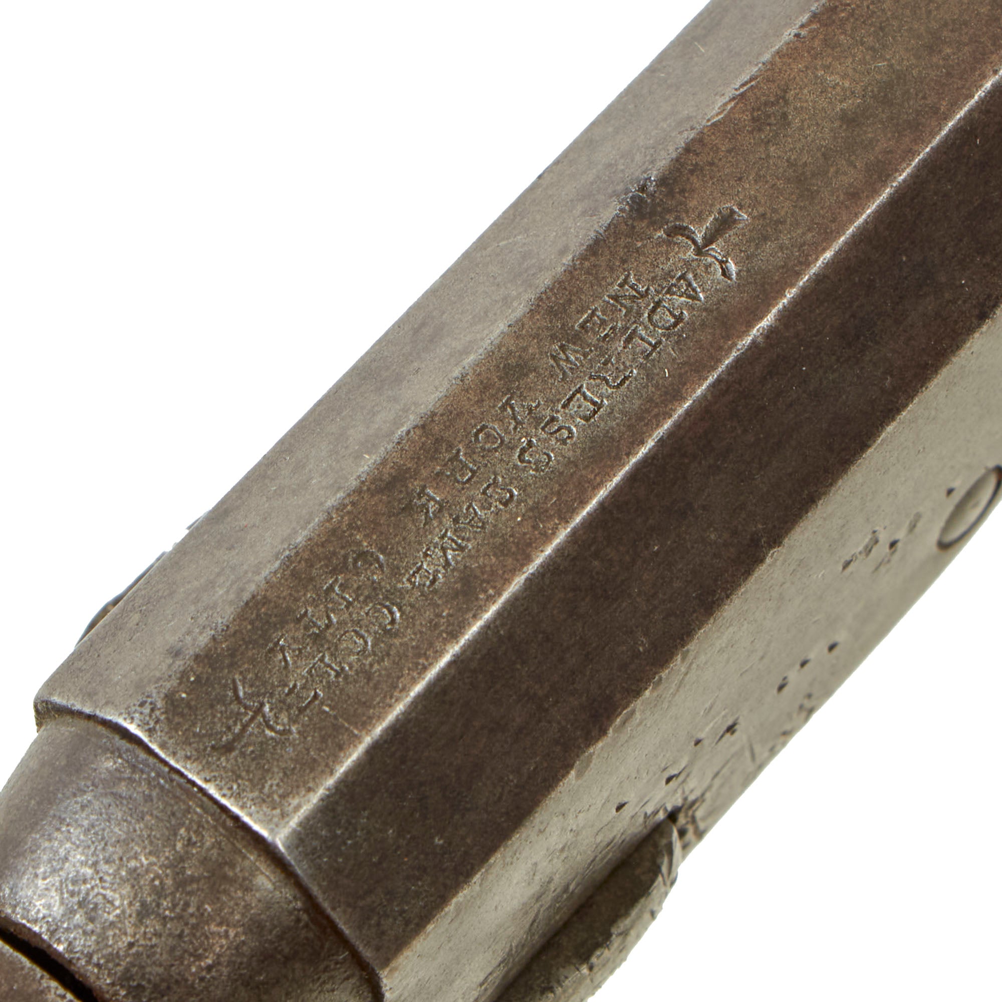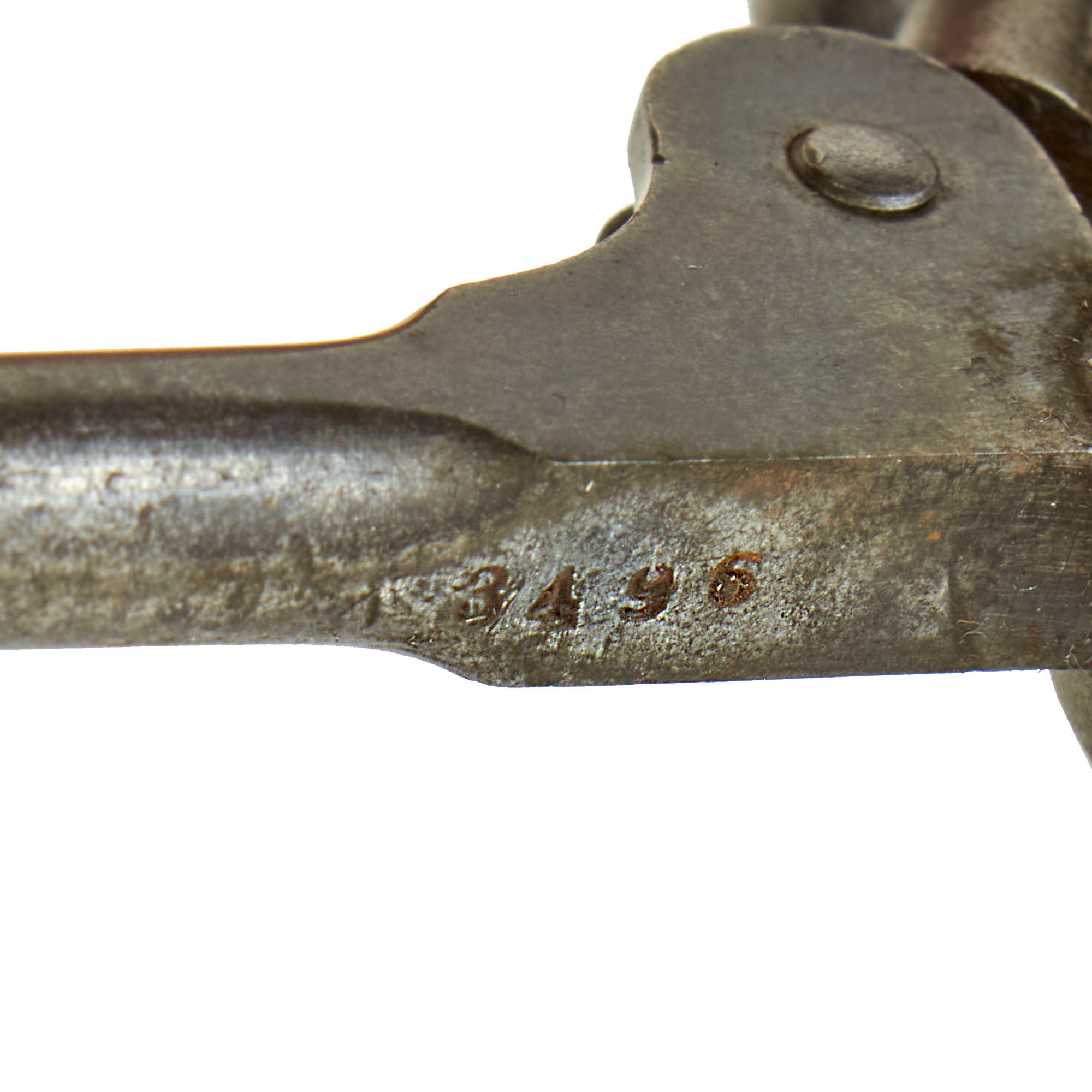 The revolver functions well, with solid indexing and a firm cylinder lockup. The ratchet on the cylinder is a bit worn, so there is one chamber that will not advance all the way, and needs to be rotated into position by hand. The barrel to frame connection is solid, and does not show any signs of alteration to tighten up the joint. The bore is in very good condition, with a bright finish showing clear lands and grooves, which are still crisp! There is some fouling and oxidation near the forcing cone, but the rest is really great. It's very rare to see a percussion era revolver with a bore this good! All five cap nipple cones are clear, showing oxidation and fouling on the exterior from use.