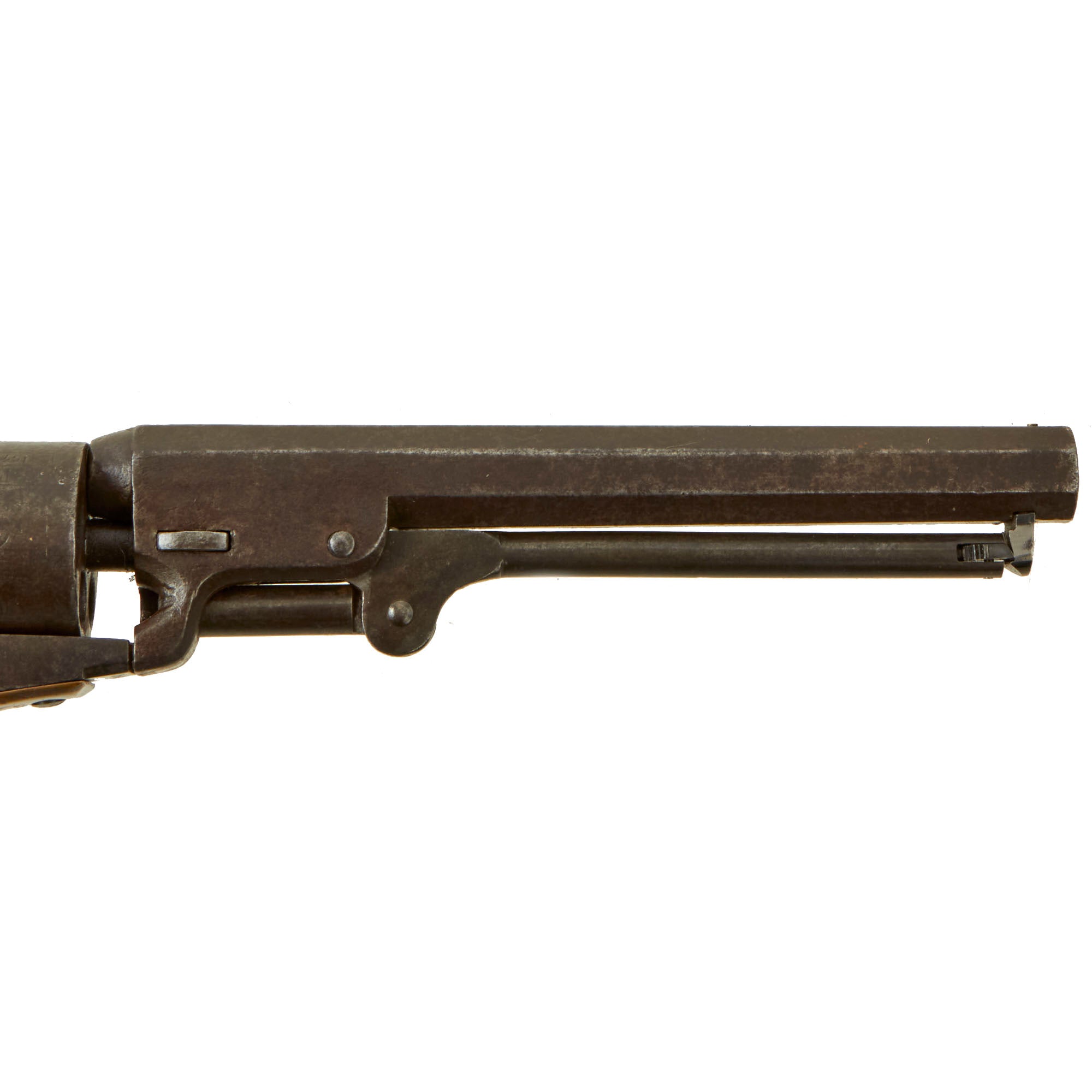 The serial number indicates indicates the year of manufacture as 1859, only two short years before the start of the U.S. Civil War, so it almost certainly saw service during the conflict, possibly on either side. Five shot percussion, .31 caliber with a 6" barrel, and is in nice tight condition with a very nice peppery patina on the steel portions. The grip frame and trigger guard show a lovely "mustard" patina, with a few small areas retaining the original nickel plating. Additionally, about 40% of the original "Stagecoach Robbery" engraved cylinder scene can still be seen, which is usually completely worn away. It also still shows part of the [COLT'S] PATENT / No. marking next to the serial number. Often we see these with the markings completely removed from the cylinder, so this is a real treat!