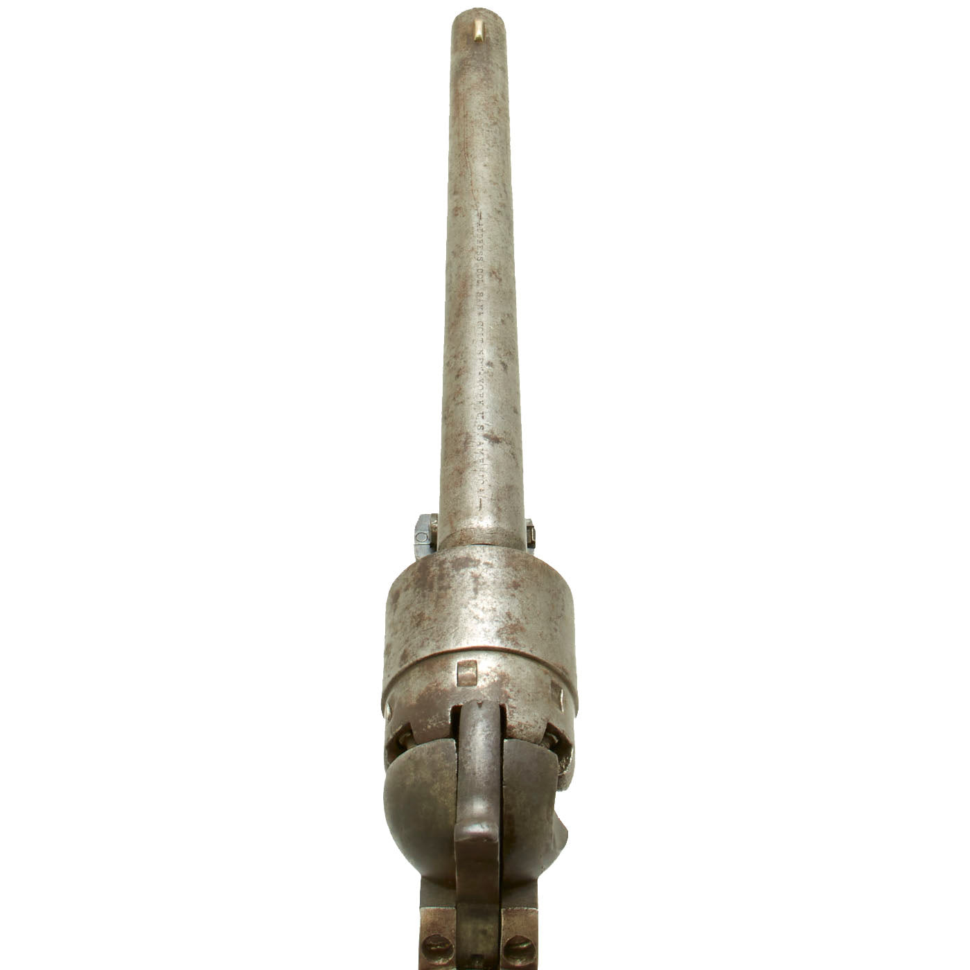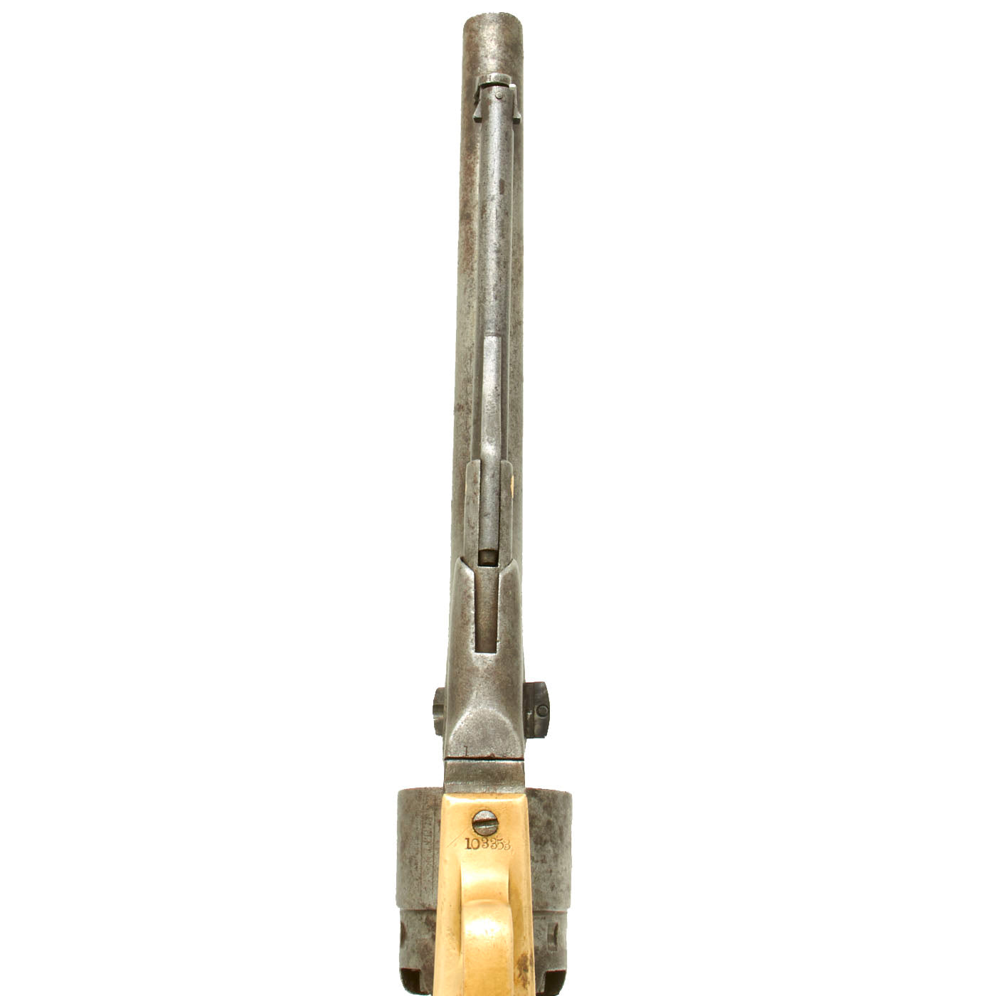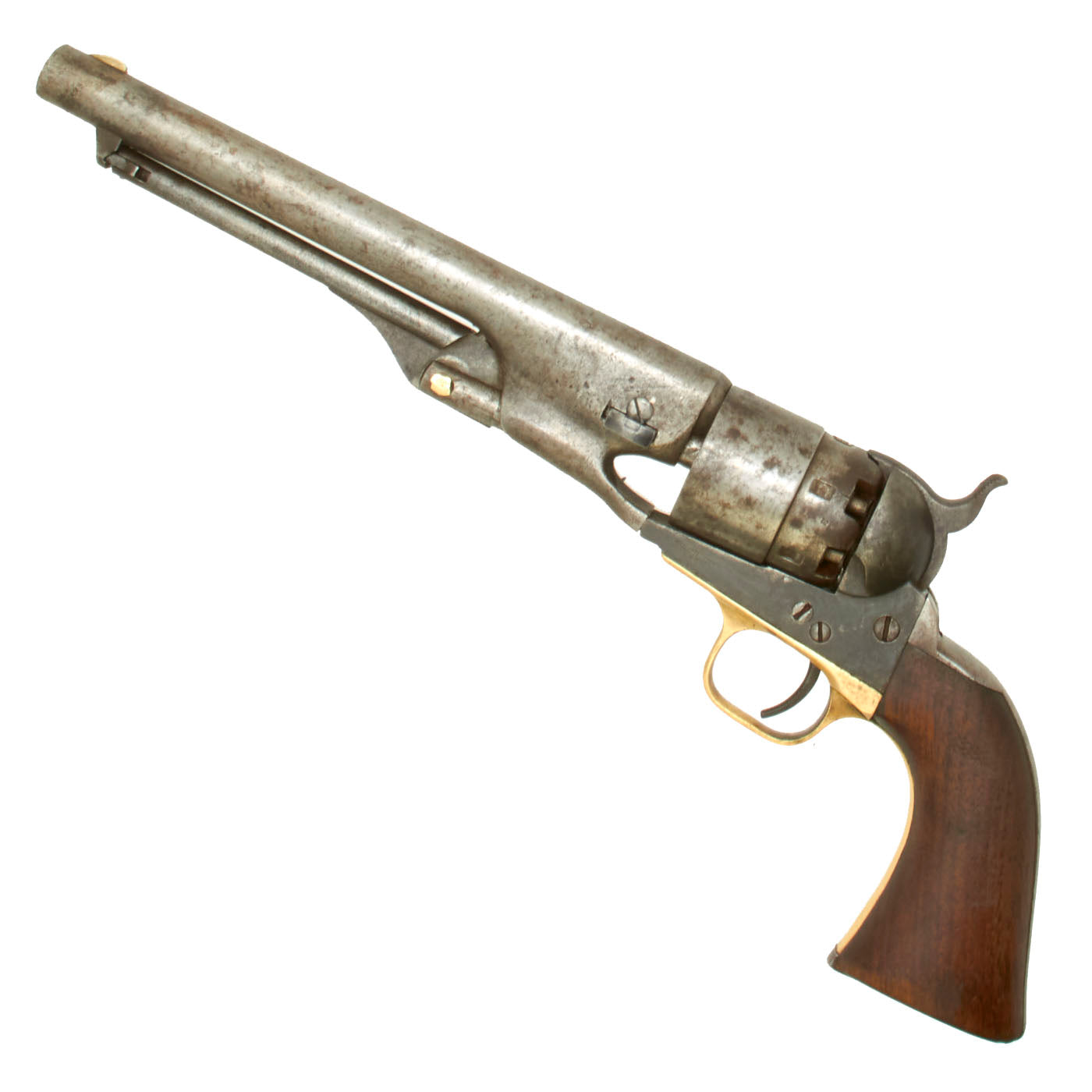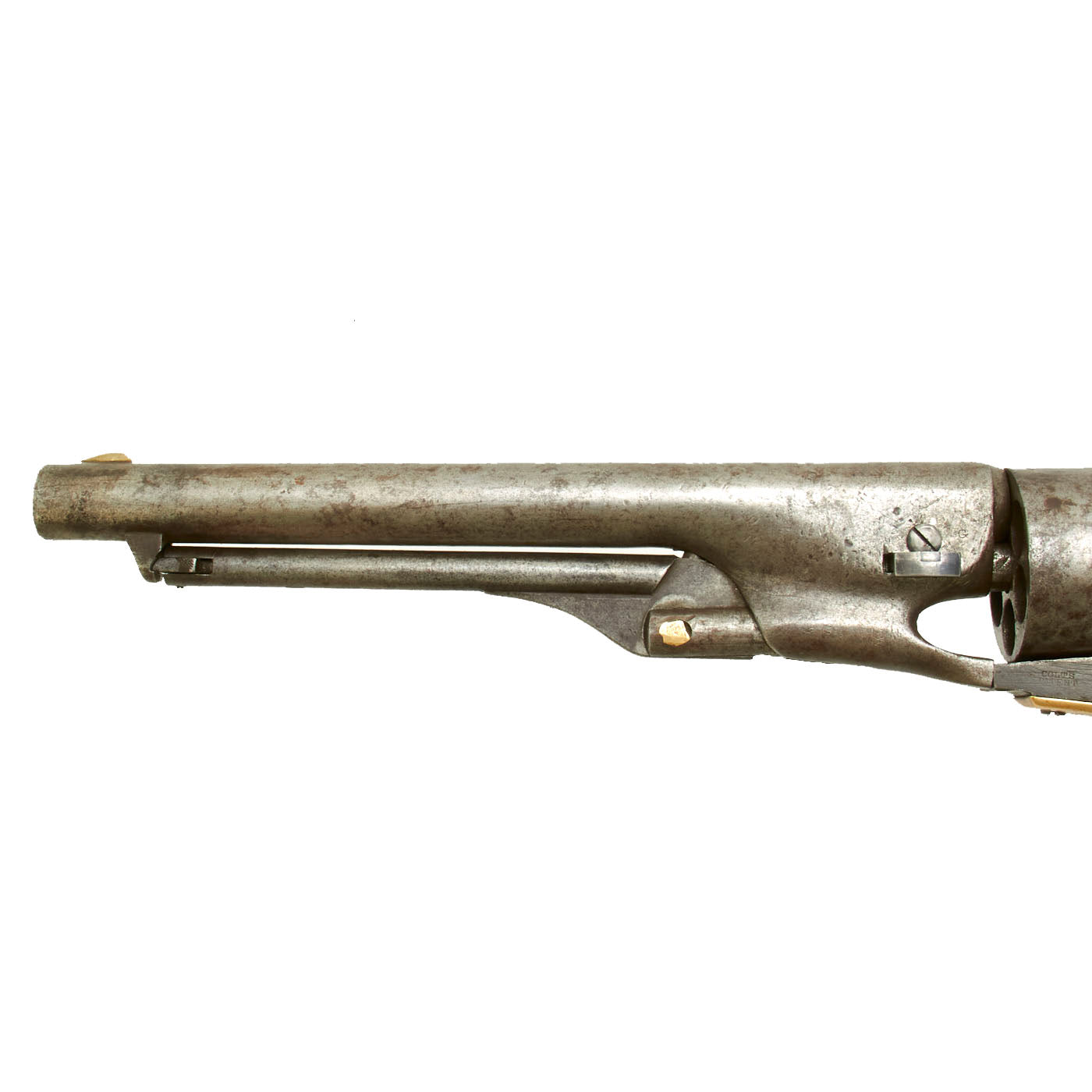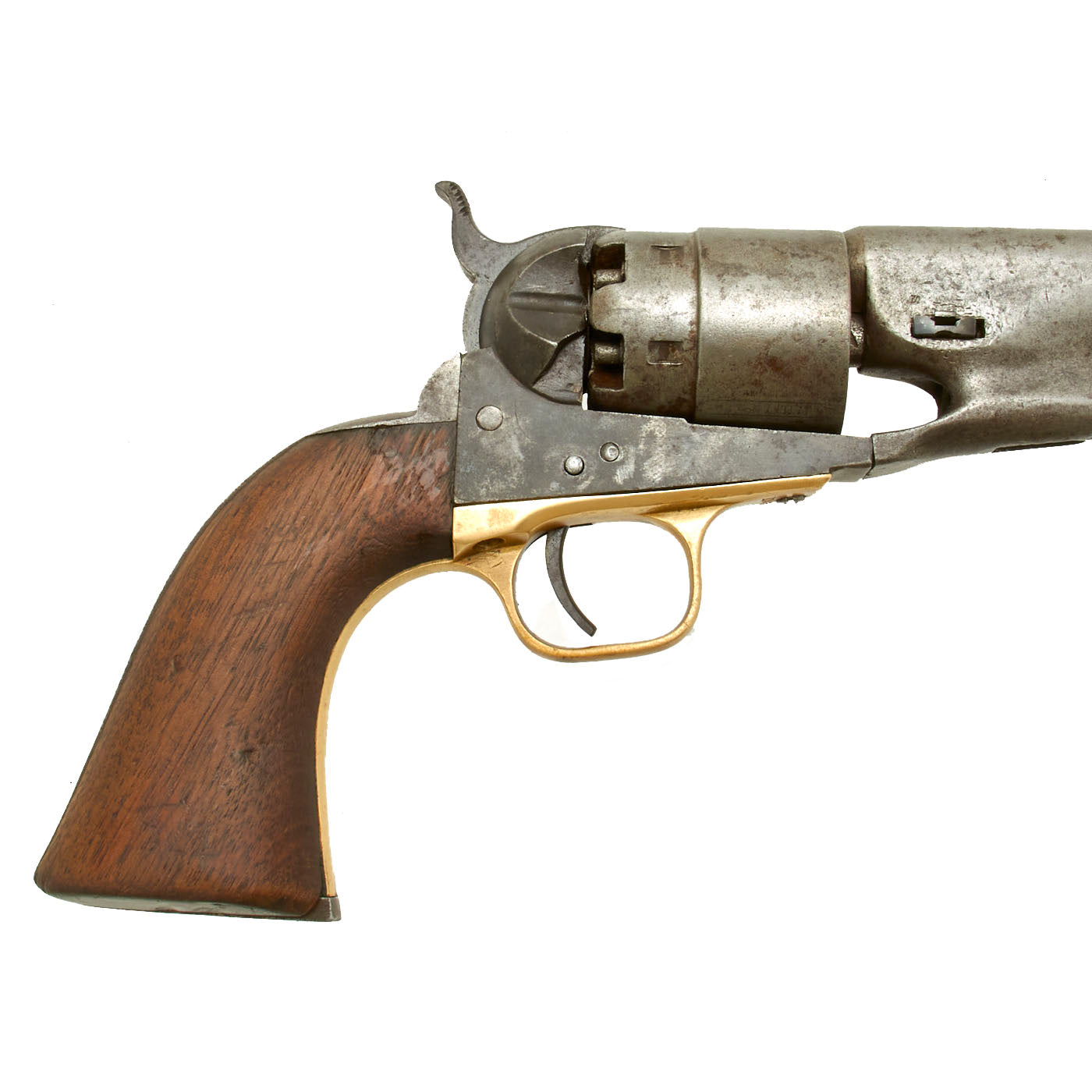 The unfluted cylinder was 'rebated,' meaning that the rear of the cylinder was turned to a smaller diameter than the front. The barrel was rounded and smoothed into the frame, as was the Navy Model. The frame, hammer, and rammer lever were case-hardened, the remainder blued; grips were of one-piece walnut; and the trigger guard and front grip strap were of brass while the backstrap was blued."