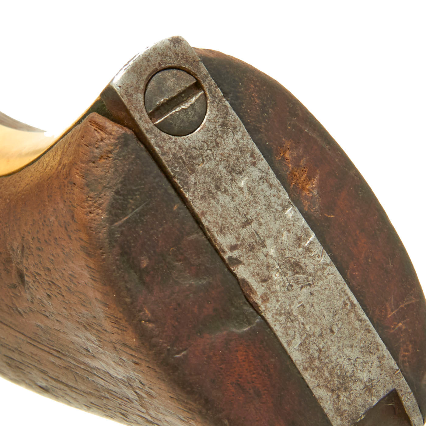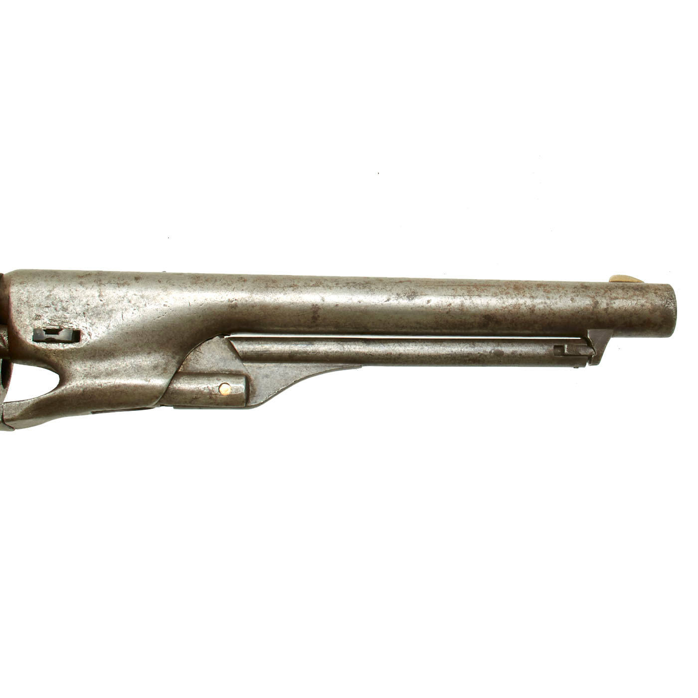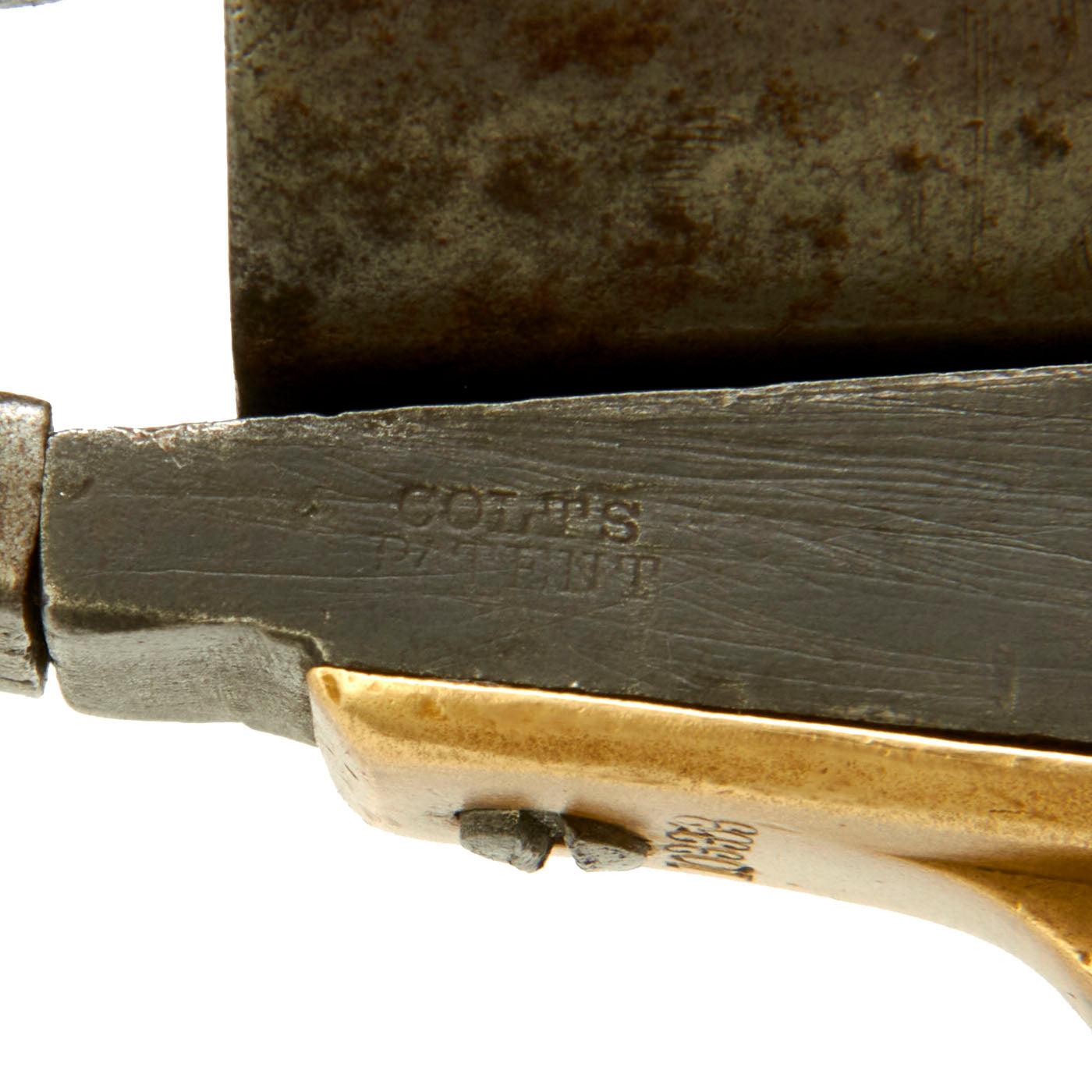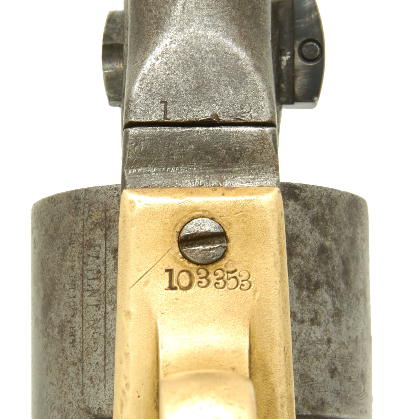 The COLT'S PATENT marking is still fully visible on the left side of the frame, however the "Naval Engagement" scene on the cylinder is completely worn away, as is common. However, it still has a partly clear "COLT'S PATENT" over "PAT. SEPT 10TH 1850" marking. The pistol has a nice worn oxidized finish, and definitely has been refurbished at arsenal, possibly several times. The only parts that still have a clear serial number are the trigger guard and grip frame, which are marked with 103353, indicating production in 1863. The markings on all of the other components are either worn or ground away.