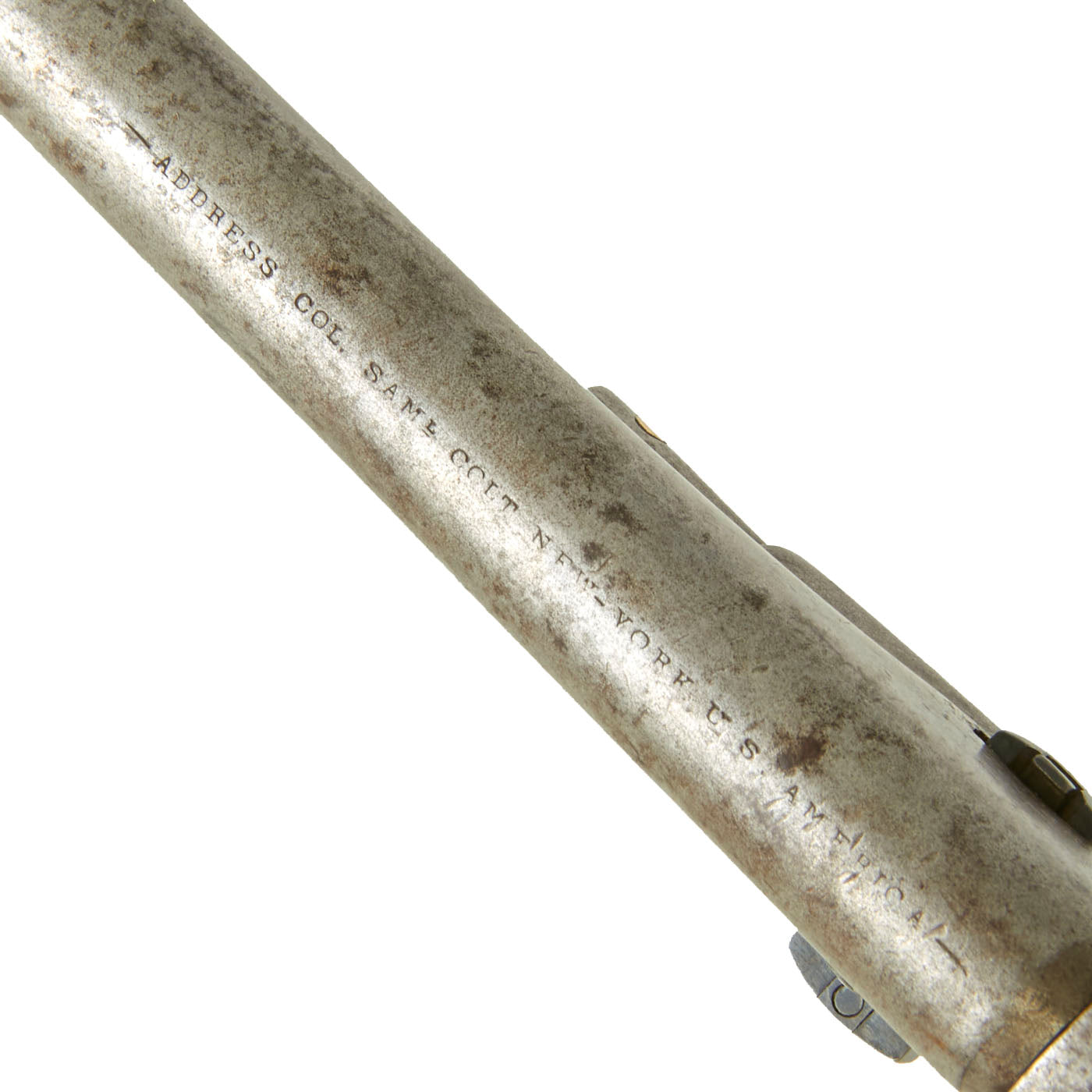 Original Item: Only One Available. This is a nice .44 caliber percussion, 6 shot round cylinder, 8" barrel Model 1860 Colt Army revolver. Gun is in very good used condition, having been arsenal refurbished either during or after the Civil War. It is fully functional, with a lovely patina, and the action and barrel frame lock up are tight. The address marking is still fully legible on the top of the barrel: