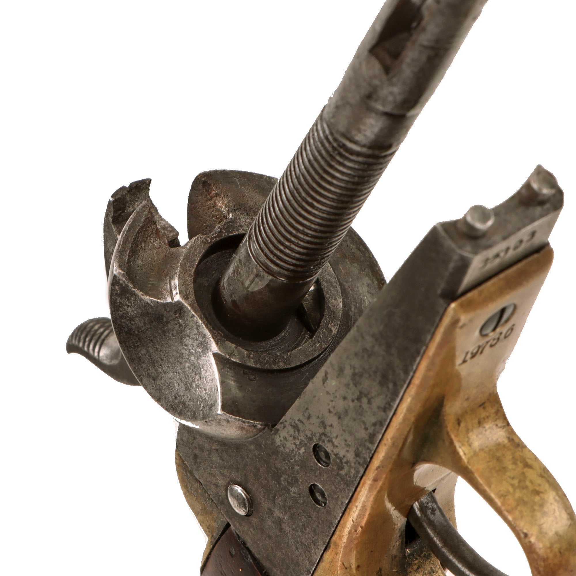 The revolver cycles well, with accurate indexing and strong cylinder lock up. We did not notice any of the finicky behavior we often see on revolvers of this age. The bore is in very good condition, showing a partly bright finish with strong lands and grooves. The "progressive rifling" used when making these revolvers is still clearly visible. There is some light past oxidation and fouling, now cleaned away, making this a really good bore for a service used Civil War revolver. The cap nipples are all intact and clear on the cylinder, showing past oxidation and powder burn on the exterior, which was later cleaned away.