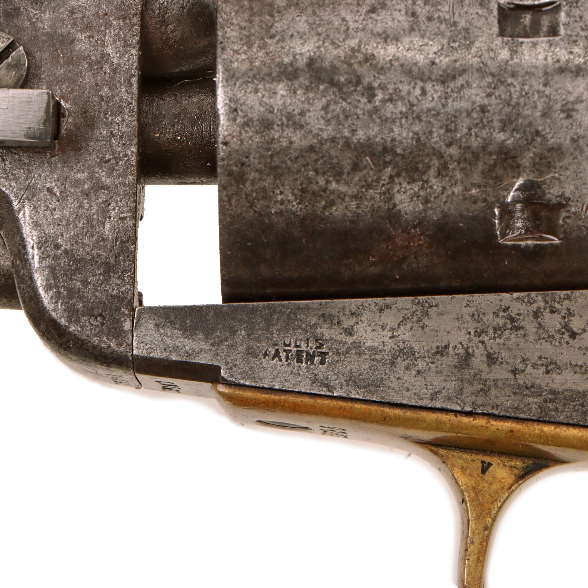 The revolver looks to have seen light to moderate service during the war, and shows a lovely light gray mottled patina overall. There is a bit of past peppering, but no major oxidation such as pitting present. The plating on the trigger guard and grip are almost completely missing, with the brass showing a lovely mustard patina. The COLTS PATENT marking is still partially visible on the left side of the frame, though there is no "36CAL" marking on the trigger guard, which is common. The walnut grip is in lovely condition, showing wear from use in service, but no major damage such as cracks, repairs, and so forth. It does look to have been resurfaced and varnished at some point, which is well retained.
